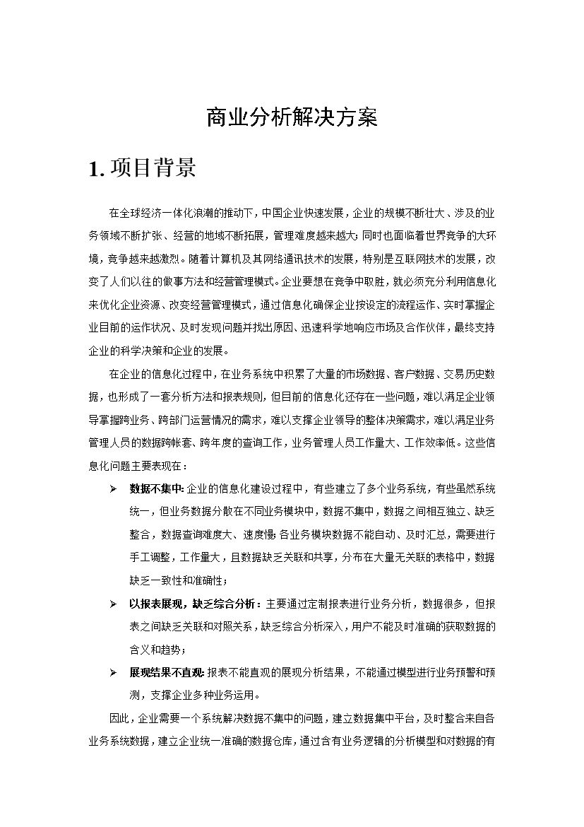 商业分析解决方案项目背景在全球经济一体化浪潮的推动下中国企业快速发展企业的规模不断壮大、涉及的业务领域不断扩张、经营的地域不断拓展管理难度越来越大;同时也面临着世界竞争的大环境竞争越来越激烈。随着计算机及其网络通讯技术的发展特别是互联网技术的发展改变了人们以往的做事方法和经营管理模式。企业要想在竞争中取胜就必须充分利用信息化来优化企业资源、改变经营管理模式通过信息化确保企业按设定的流程运作、实时掌握企业目前的运作状况、及时发现问题并找出原因、迅速科学地响应市场及合作伙伴最终支持企业的科学决策和企业的发展。