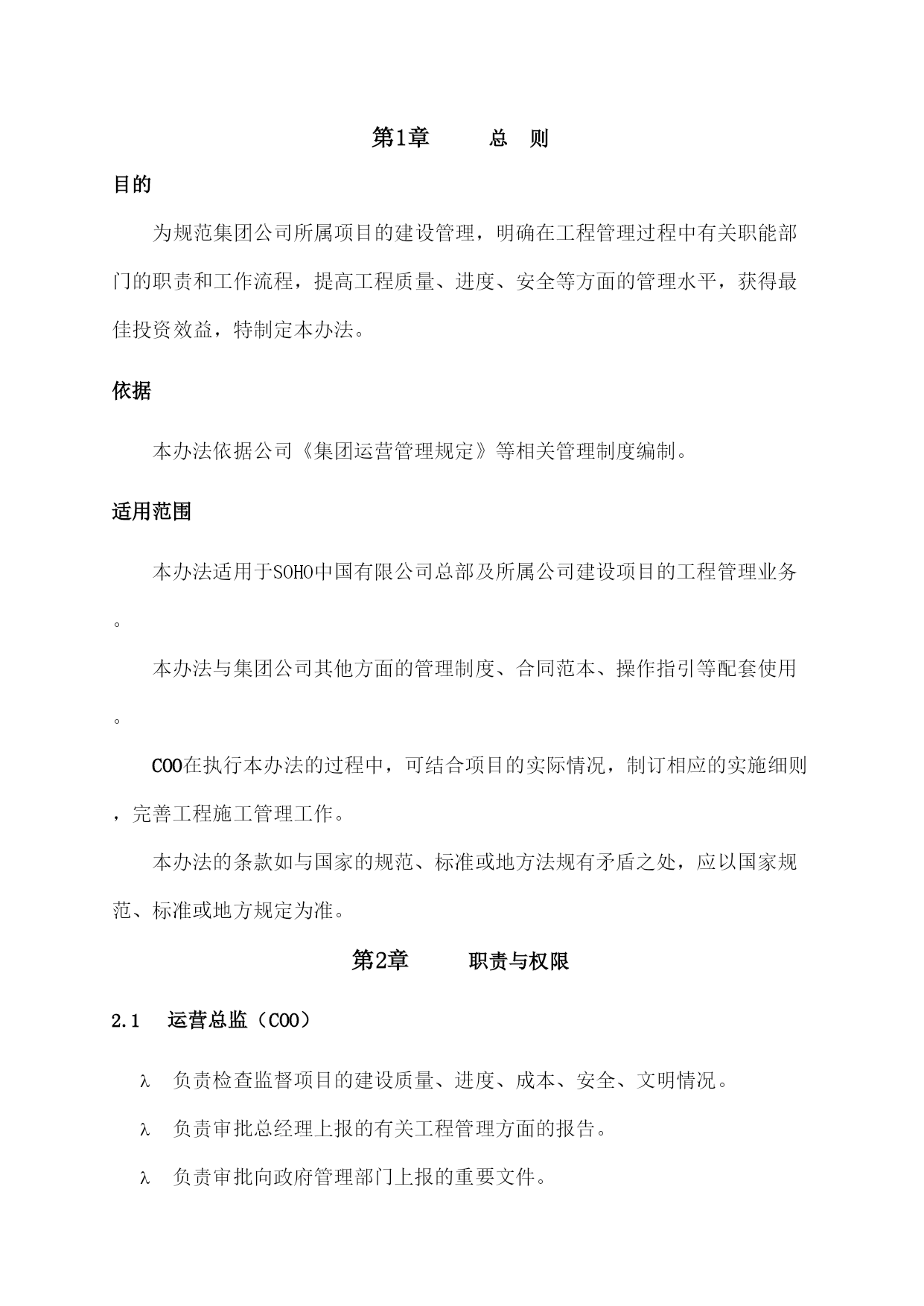 文件编码(GHTU-UITID-GGBKT-POIU-WUUI-8968)SOHO地产工程管理规定办法手册工程管理手册文件编号:文件版本:编制日期:目录总则目的依据适用范围职责与权限运营总监(COO)总经理工程部成本合约部设计部开发部工程管理审批权限工程管理项目管理控制计划现场检查总经理工地现场协调会工程部周例会专题会议与施工单位沟通往来函件图纸工程日记工程月报工程竣工总结监理单位的管理监理人员监理实施细则监理例会监理月报监理发文监理档案资料施工准备场地接收及临时设施建设开工条件施工图纸会审审核施工组织设
