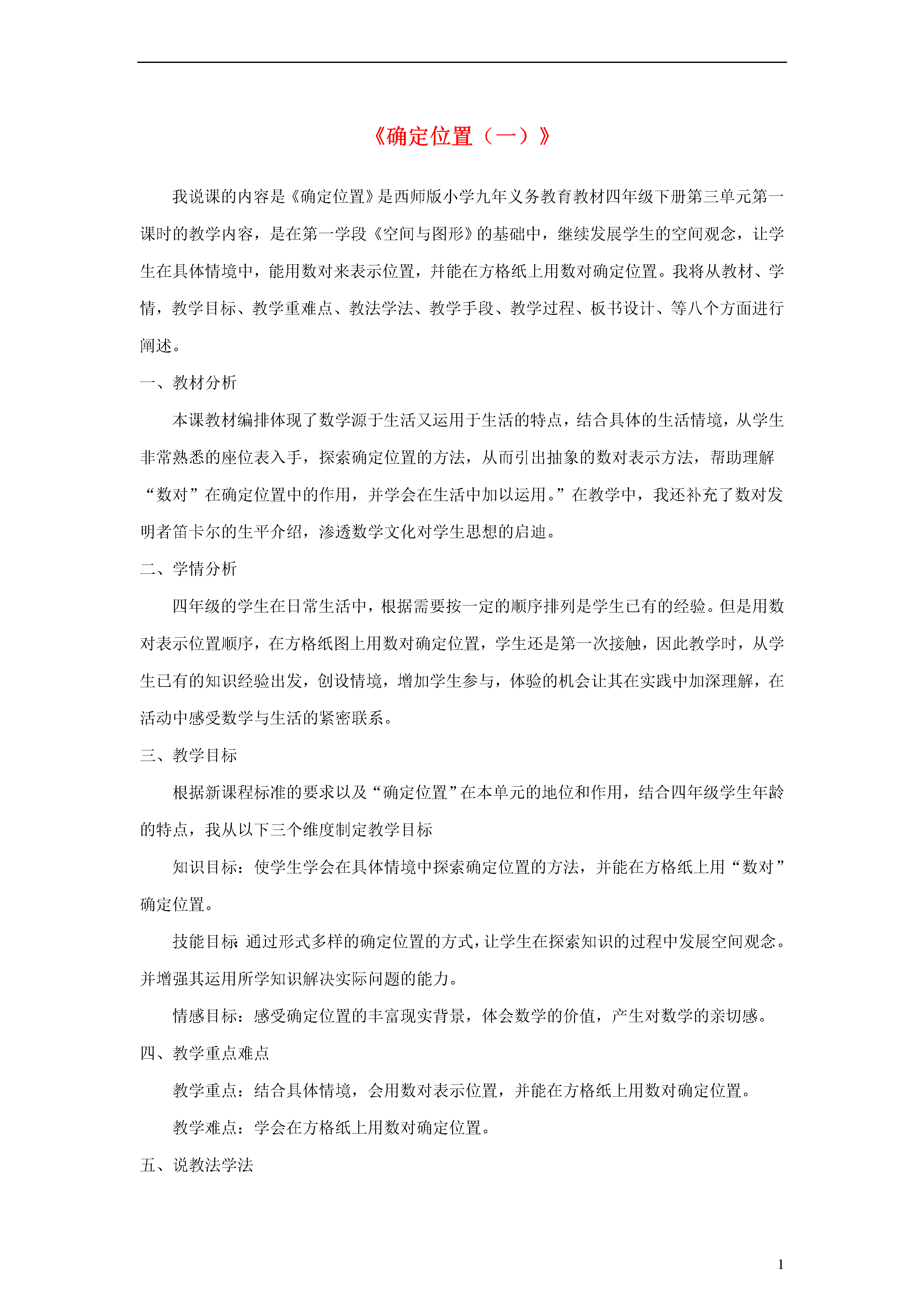 1《确定位置(一)》我说课的内容是《确定位置》是西师版小学九年义务教育教材四年级下册第三单元第一课时的教学内容,是在第一学段《空间与图形》的基础中,继续发展学生的空间观念,让学生在具体情境中,能用数对来表示位置,幷能在方格纸上用数对确定位置。我将从教材、学情,教学目标、教学重难点、教法学法、教学手段、教学过程、板书设计、等八个方面进行阐述。一、教材分析本课教材编排体现了数学源于生活又运用于生活的特点,结合具体的生活情境,从学生非常熟悉的座位表入手,探索确定位置的方法,从而引出抽象的数