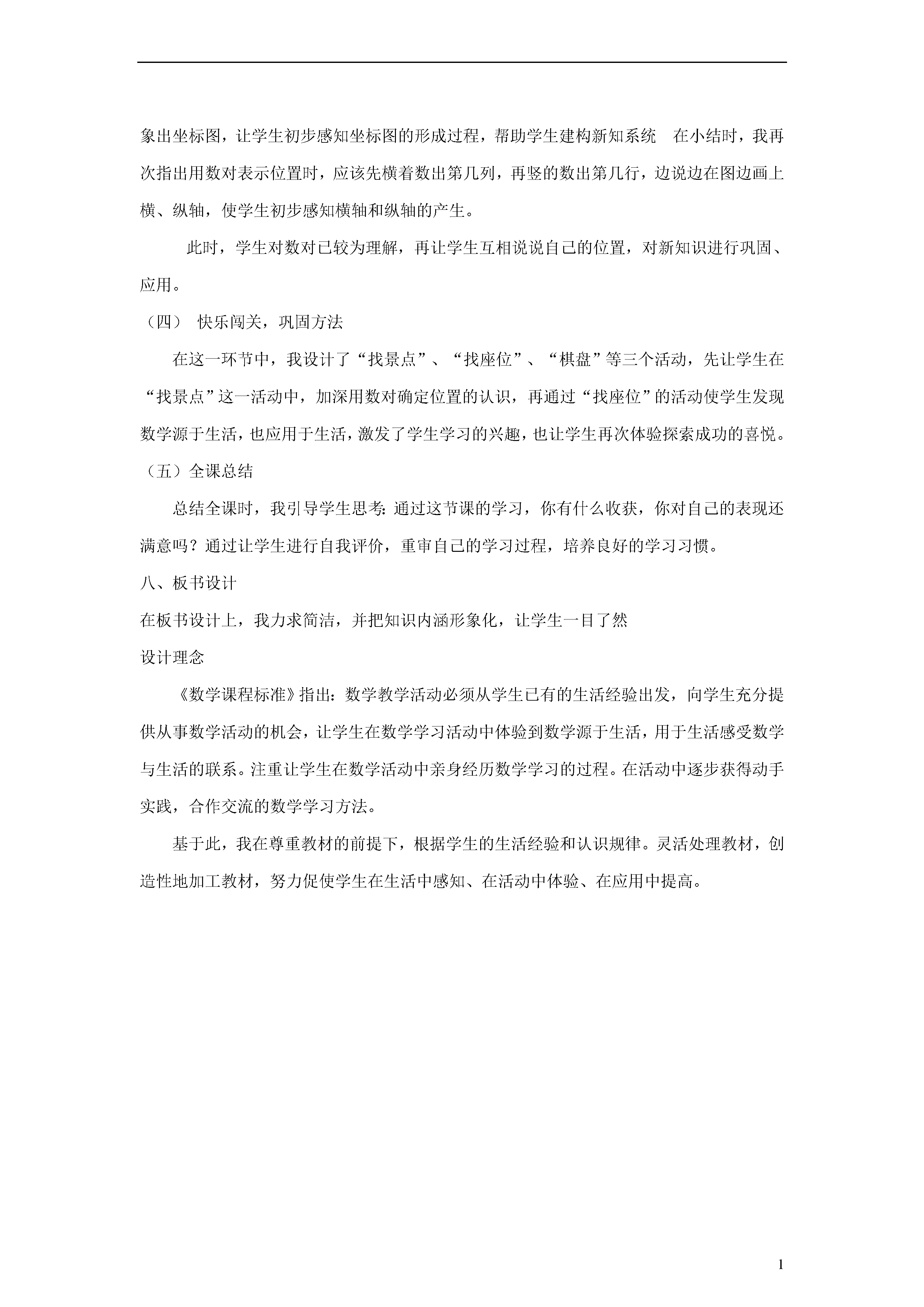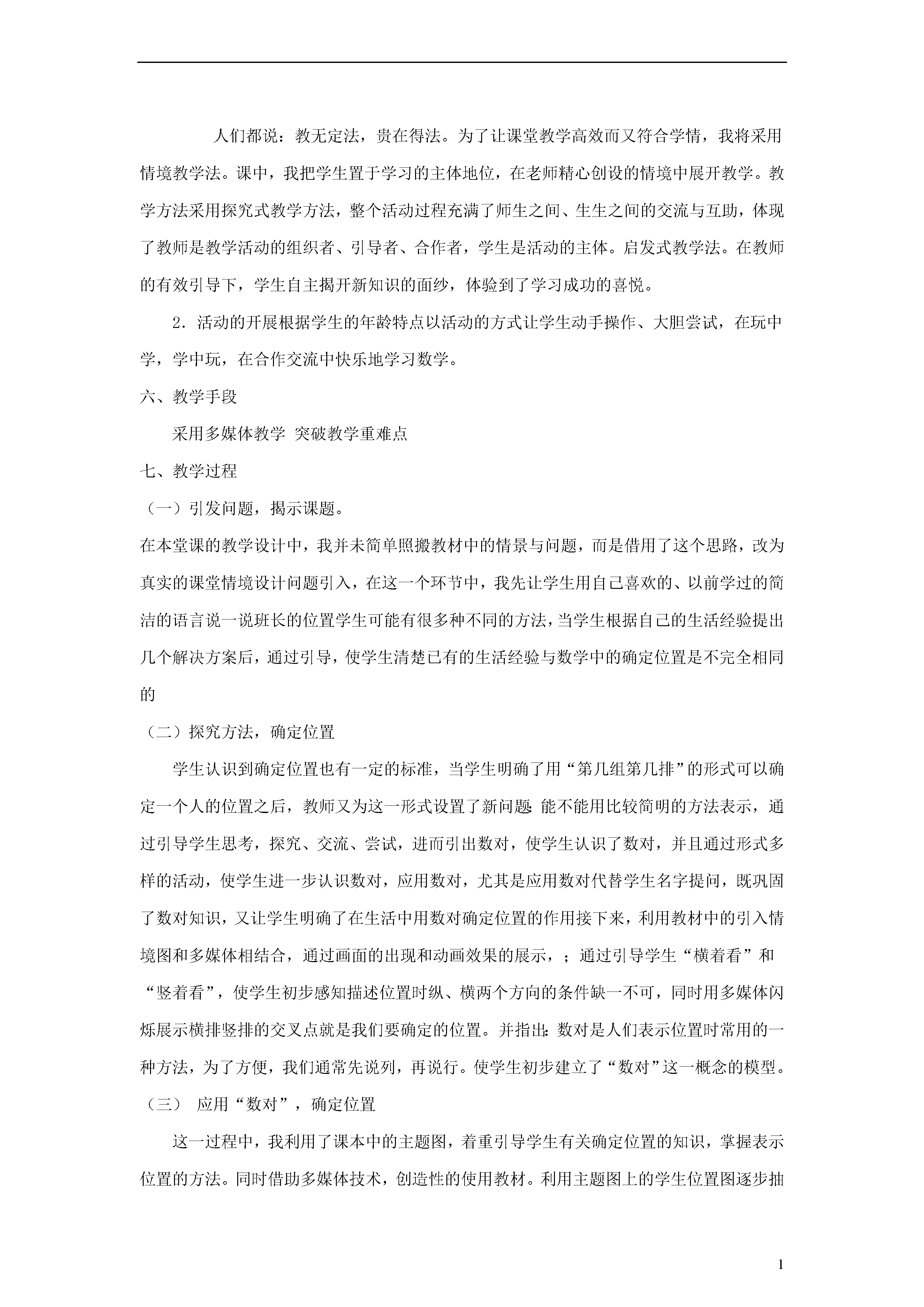 1确定位置(一)教学目标:1.结合生活情境,使学生体验用数对确定位置的必要性和简洁性。2.在具体情境中,能用数对表示位置,根据数对确定位置,并能在方格图中根据数对确定位置。3.引导学生经历由实物图到点子图最后到方格图的数学化抽象过程,渗透坐标的思想,发展学生的空间观念。4.体验确定物体位置与生活的联系。(二)学生和内容分析:在第一学段中,学生已经学习了前后、上下、左右表示物体具体位置的知识,也学习了简单的方向等知识,这些知识为学生进一步认识物体在空间的具体位置打下基础。这节“