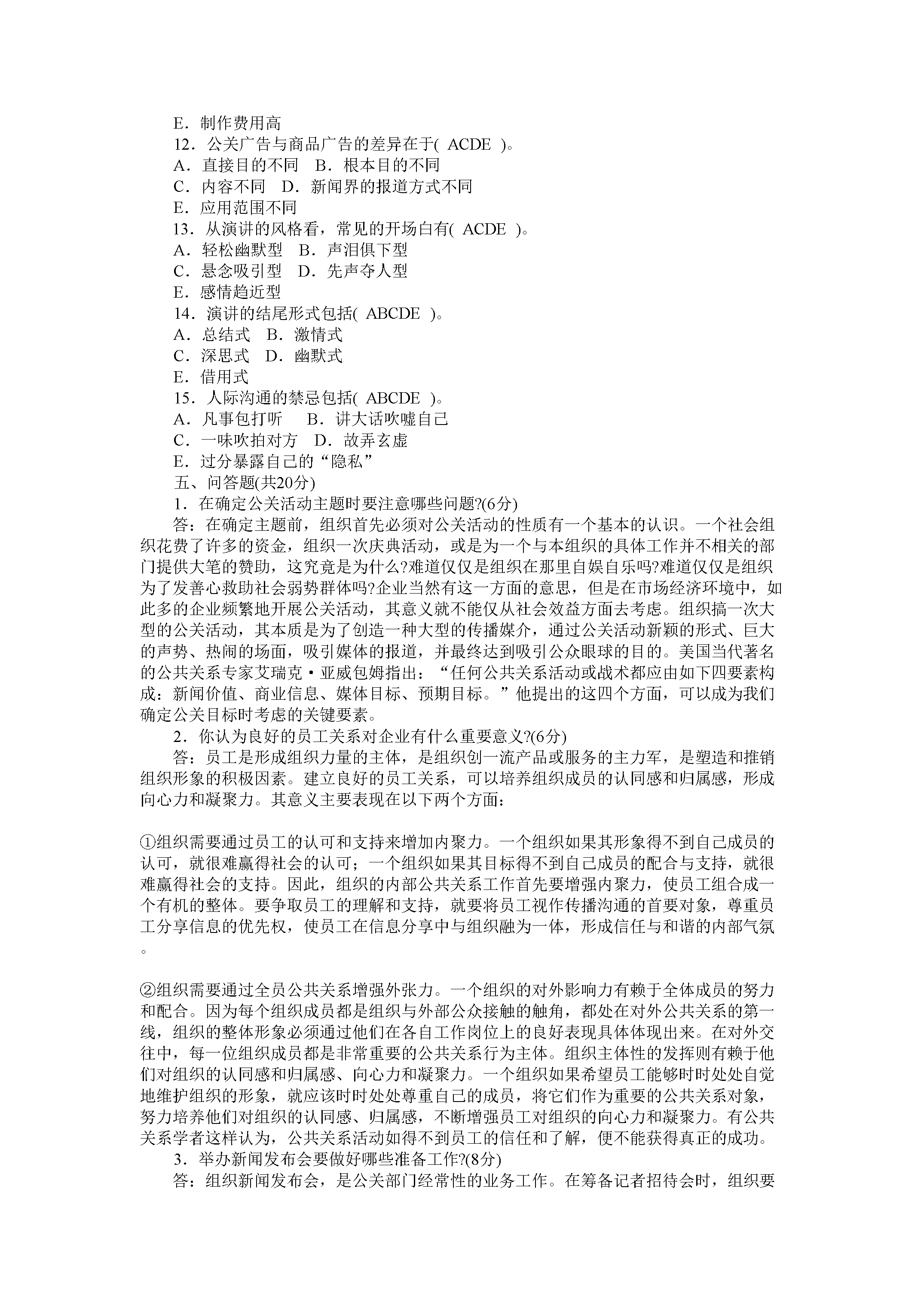 公共关系学作业1第1章—第4章一、名词解释(每小题3分共15分)1.公共关系:所谓公共关系就是一个组织运用有效的传播手段使自身适应公众的需要并使公众也适应组织发展需要的一种思想、政策和管理职能。2.公共关系观念:是人们在公共关系实践中形成的影响人们思想和行为倾向的深层的思想意识是人们对公共关系活动的一种自觉的认识和理解。3.揭丑运动:19世纪下半叶美国的商品经济得到高度发展资本主义从自由竞争走向了垄断。百来个经济巨头控制了美国的经济命脉他们为了巩固这种垄断地位对内根本无视员工的利益对外以