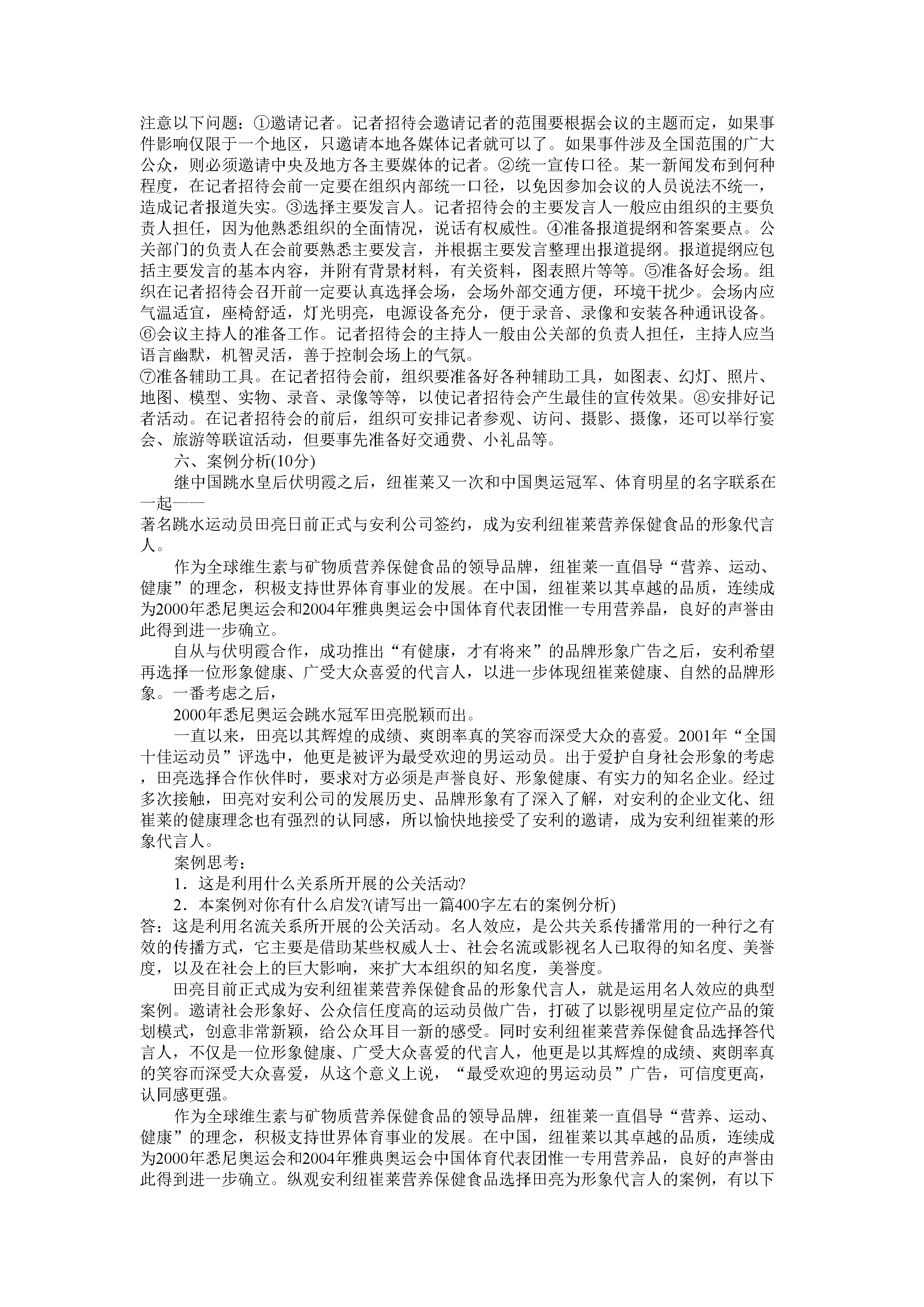 公共关系学作业1第1章—第4章一、名词解释(每小题3分,共15分)1.公共关系:所谓公共关系,就是一个组织运用有效的传播手段,使自身适应公众的需要,并使公众也适应组织发展需要的一种思想、政策和管理职能。2.公共关系观念:是人们在公共关系实践中形成的影响人们思想和行为倾向的深层的思想意识,是人们对公共关系活动的一种自觉的认识和理解。3.揭丑运动:19世纪下半叶,美国的商品经济得到高度发展,资本主义从自由竞争走向了垄断。百来个经济巨头控制了美国的经济命脉,他们为了巩固这种垄断地位,对内根本无视员工的利益,对外