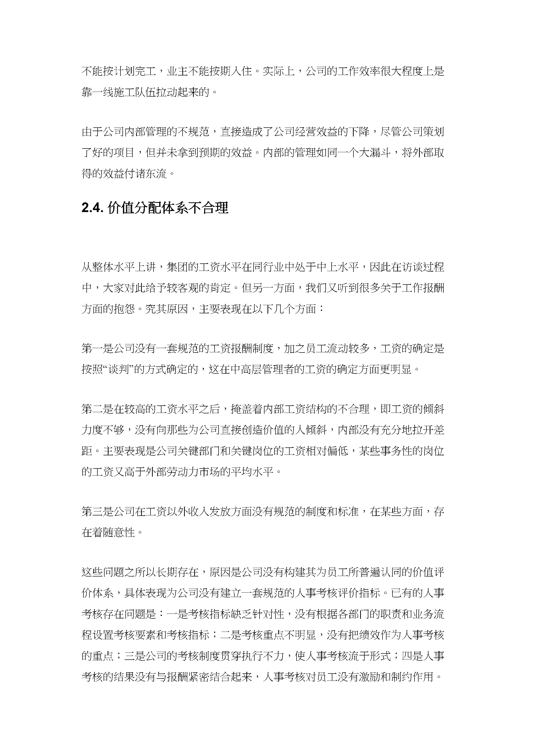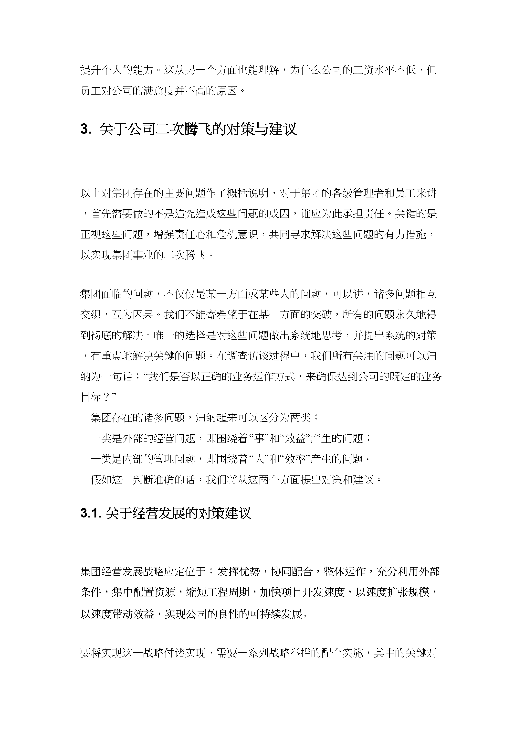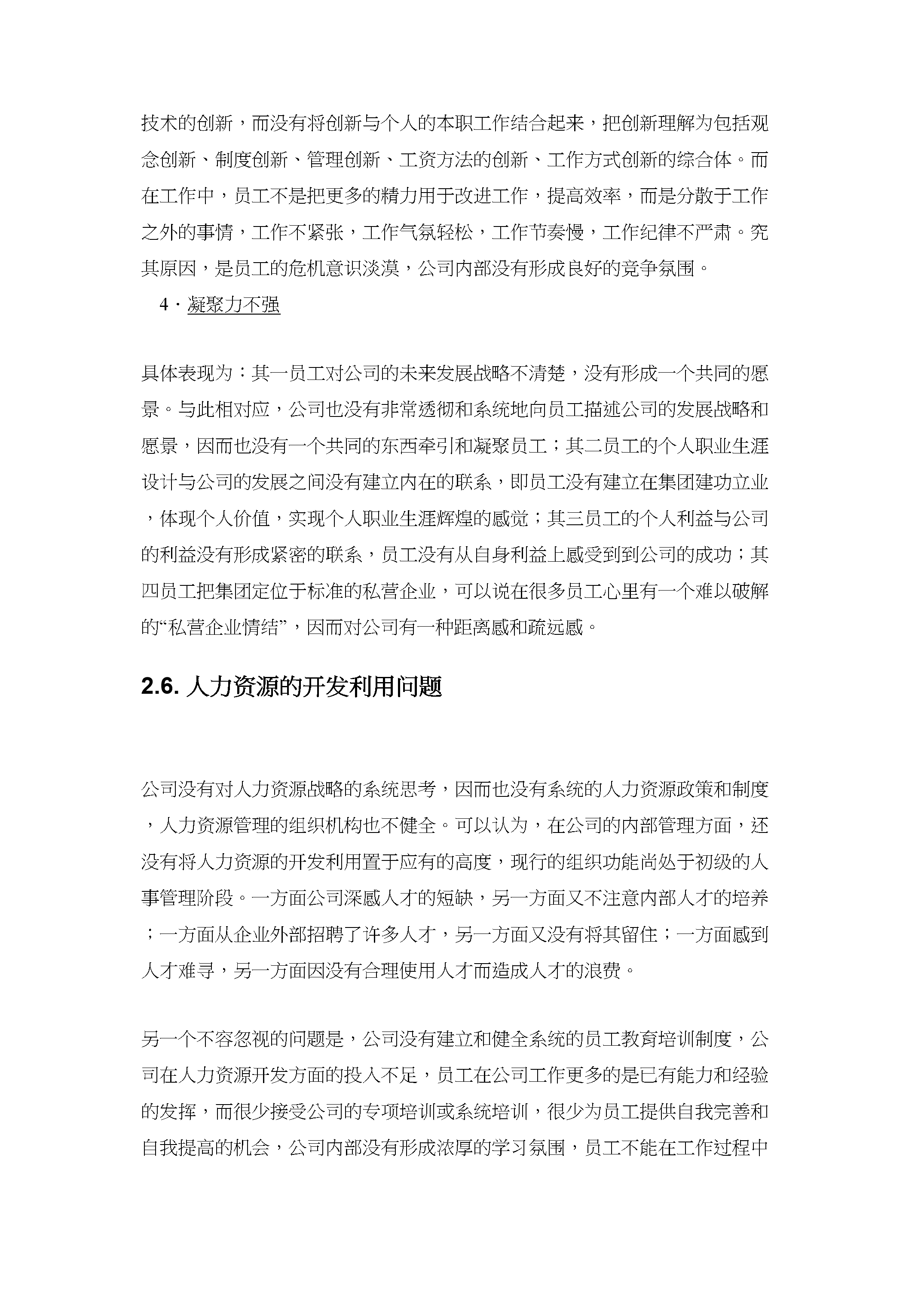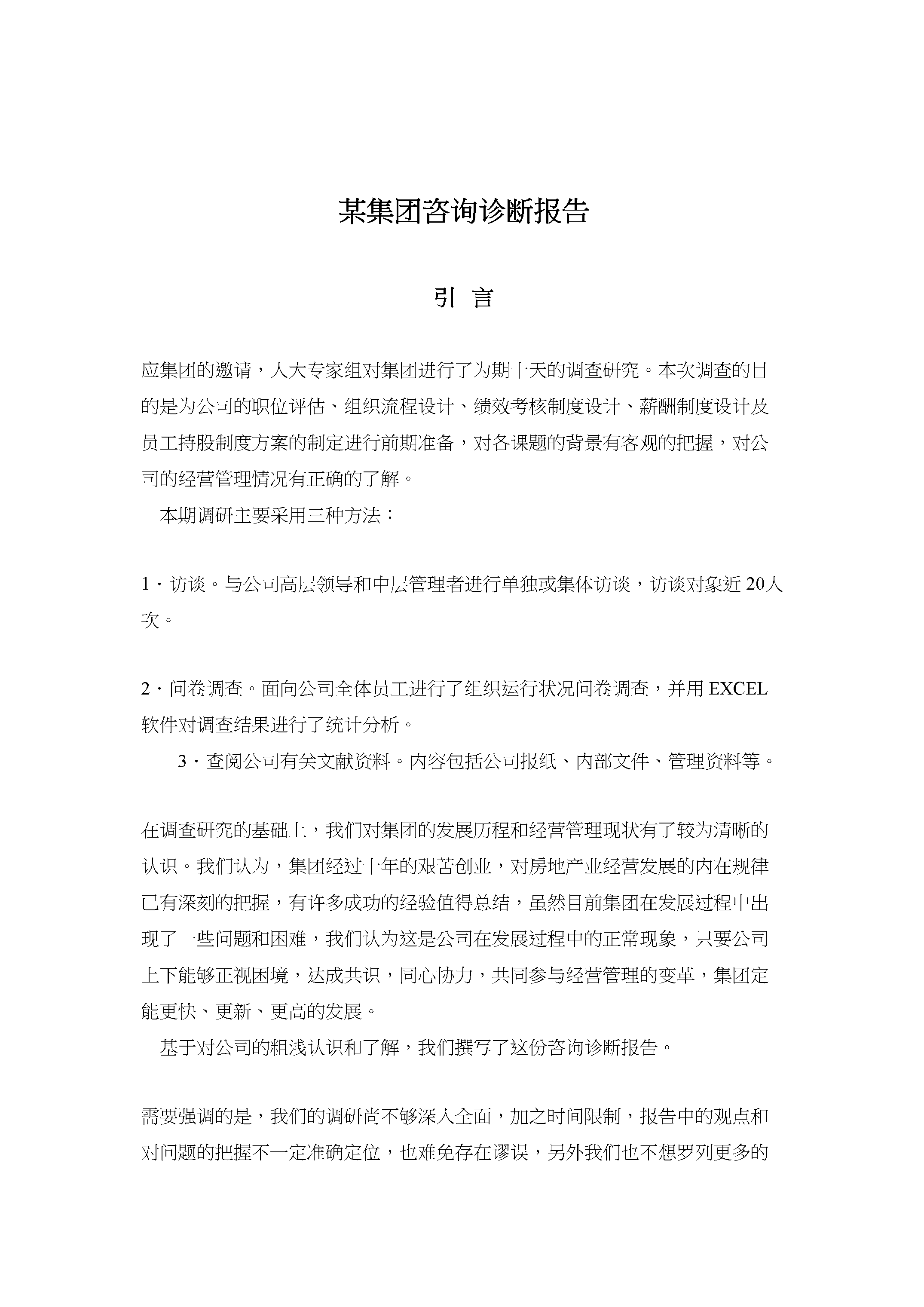 某集团咨询诊断报告引言应集团的邀请人大专家组对集团进行了为期十天的调查研究。本次调查的目的是为公司的职位评估、组织流程设计、绩效考核制度设计、薪酬制度设计及员工持股制度方案的制定进行前期准备对各课题的背景有客观的把握对公司的经营管理情况有正确的了解。本期调研主要采用三种方法:1.访谈。与公司高层领导和中层管理者进行单独或集体访谈访谈对象近20人次。2.问卷调查。面向公司全体员工进行了组织运行状况问卷调查并用EXCEL软件对调查结果进行了统计分析。3.查阅公司有关文献资