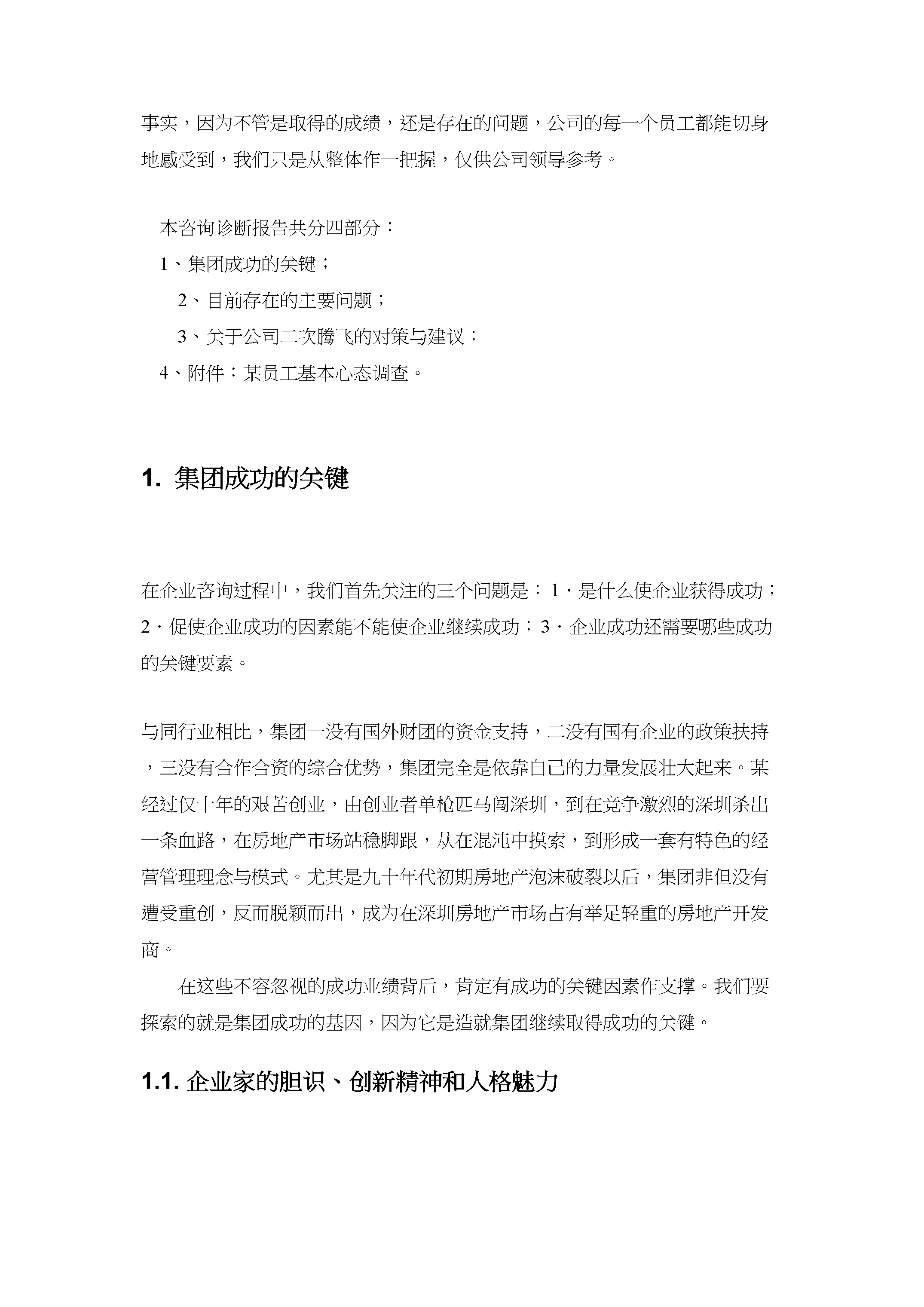 某集团咨询诊断报告引言应集团的邀请,人大专家组对集团进行了为期十天的调查研究。本次调查的目的是为公司的职位评估、组织流程设计、绩效考核制度设计、薪酬制度设计及员工持股制度方案的制定进行前期准备,对各课题的背景有客观的把握,对公司的经营管理情况有正确的了解。本期调研主要采用三种方法:1.访谈。与公司高层领导和中层管理者进行单独或集体访谈,访谈对象近20人次。2.问卷调查。面向公司全体员工进行了组织运行状况问卷调查,并用EXCEL软件对调查结果进行了统计分析。3.查阅公司有关文献资料。内容包括公司报纸、内部文