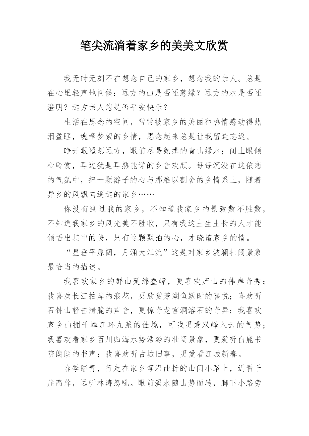 笔尖流淌着家乡的美美文欣赏我无时无刻不在想念自己的家乡,想念我的亲人。总是在心里轻声地问候:远方的山是否还葱绿?远方的水是否还澄明?远方亲人您是否平安快乐?生活在思念的空间,常常被家乡的美丽和热情感动得热泪盈眶,魂牵梦萦的乡情,思念起来总是让我留连忘返。睁开眼遥想远方,眼前尽是熟悉的青山绿水;闭上眼倾心聆赏,耳边犹是耳熟能详的乡音欢颜。每每沉浸在这依恋的气氛中,把一颗游子的心与那难以割舍的乡情系上,随着异乡的风飘向遥远的家乡……你没有到过我的家乡,不知道我家乡的景致数不胜数,不知道我家乡的风光美不胜收,只