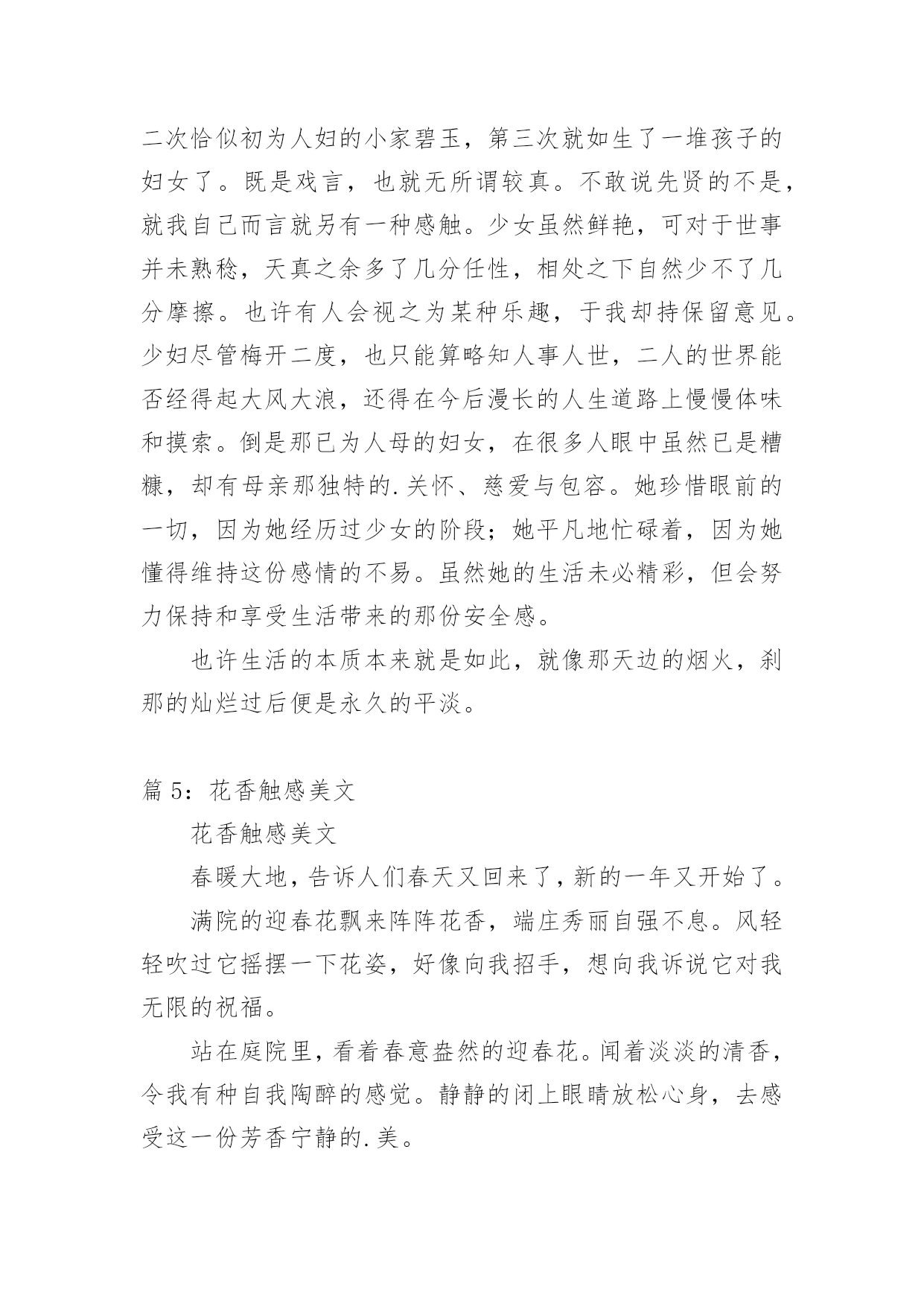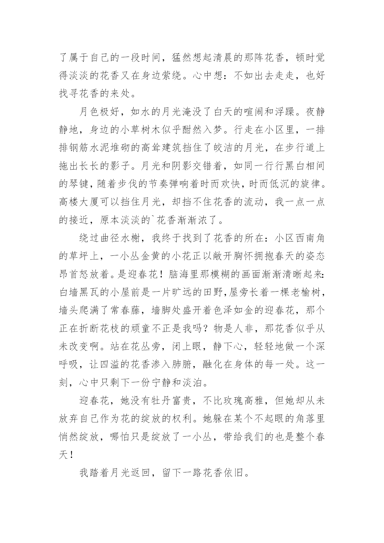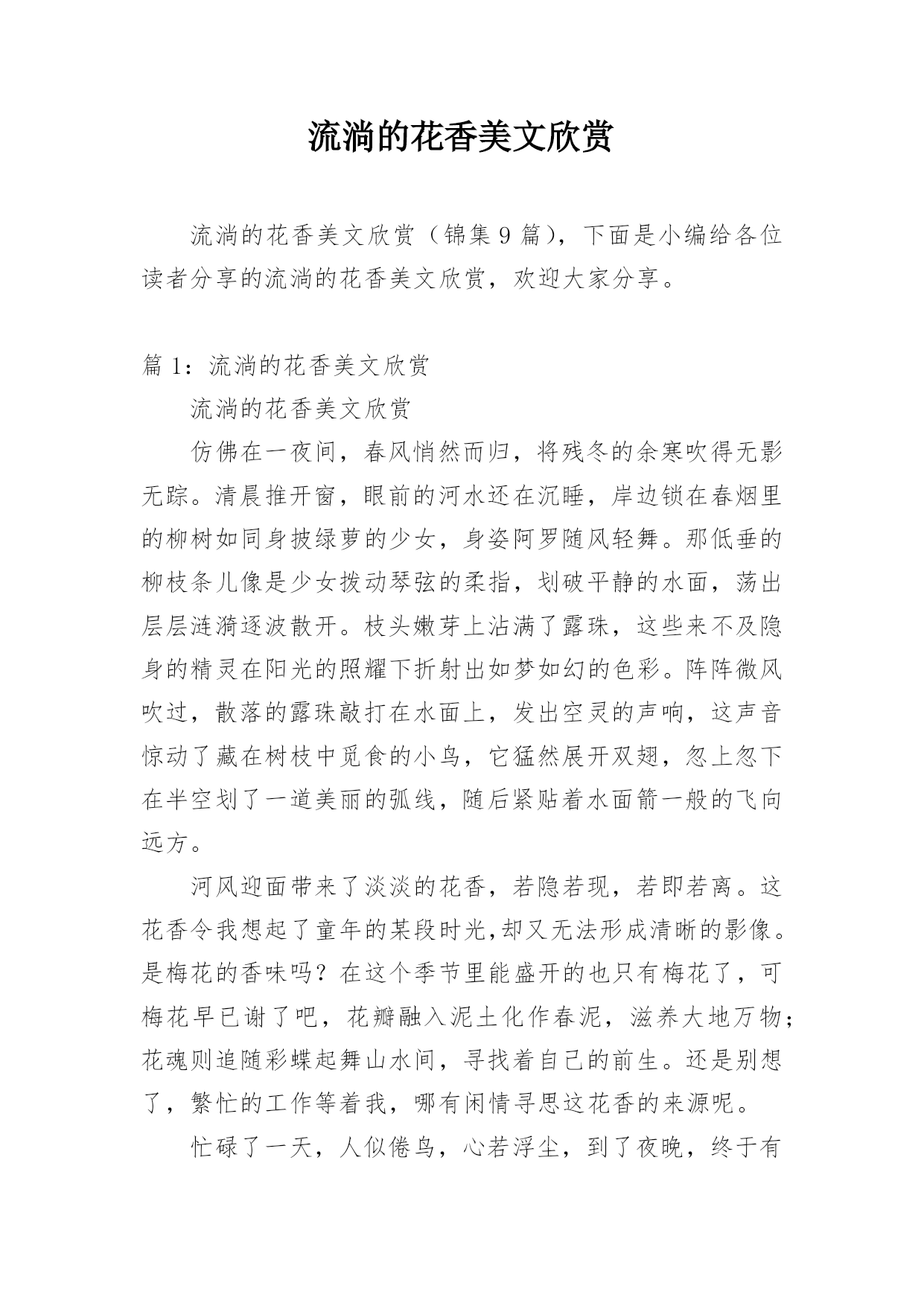 流淌的花香美文欣赏流淌的花香美文欣赏(锦集9篇),下面是小编给各位读者分享的流淌的花香美文欣赏,欢迎大家分享。篇1:流淌的花香美文欣赏流淌的花香美文欣赏仿佛在一夜间,春风悄然而归,将残冬的余寒吹得无影无踪。清晨推开窗,眼前的河水还在沉睡,岸边锁在春烟里的柳树如同身披绿萝的少女,身姿阿罗随风轻舞。那低垂的柳枝条儿像是少女拨动琴弦的柔指,划破平静的水面,荡出层层涟漪逐波散开。枝头嫩芽上沾满了露珠,这些来不及隐身的精灵在阳光的照耀下折射出如梦如幻的色彩。阵阵微风吹过,散落的露珠敲打在水面上,发出空灵的声响,这声