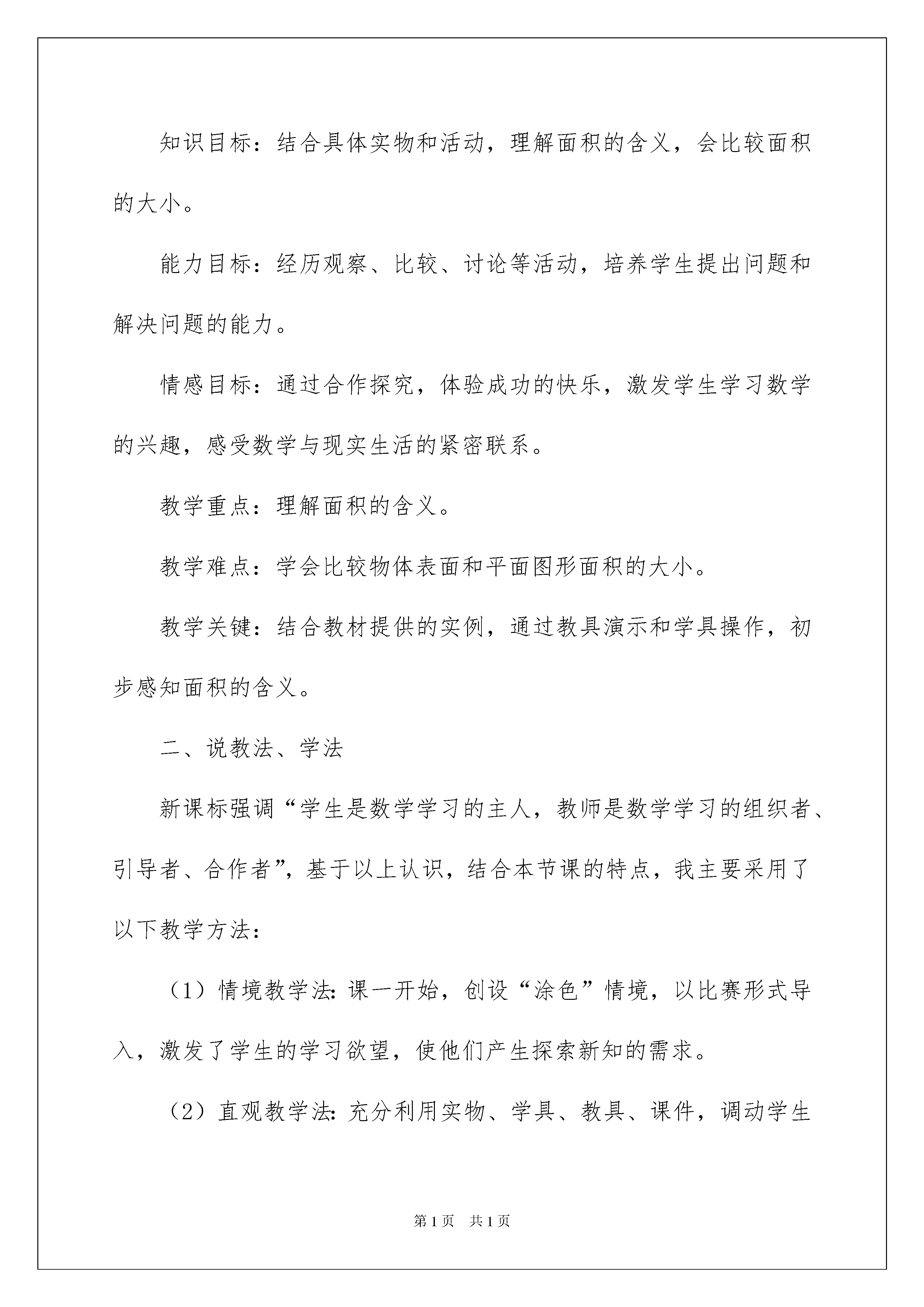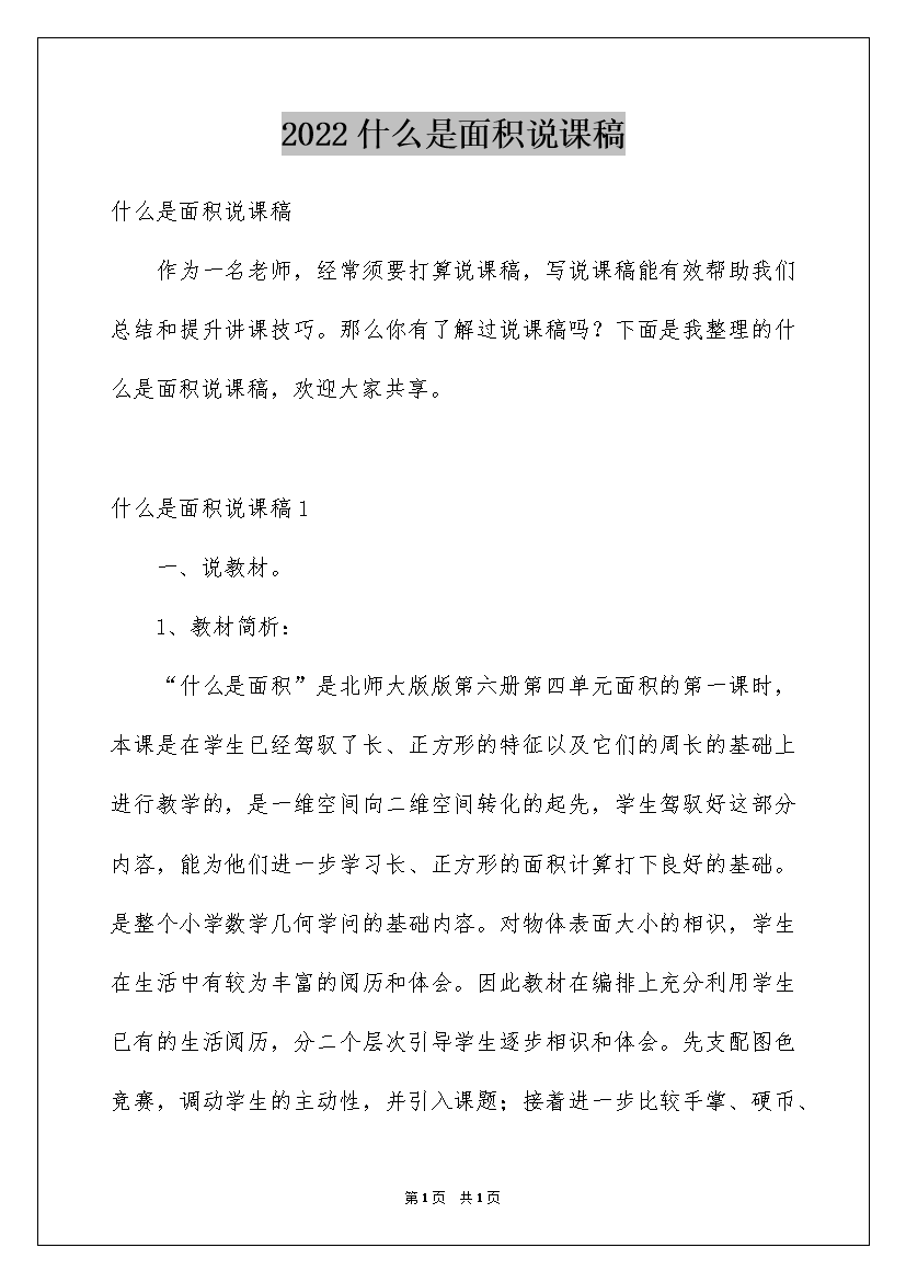 2022什么是面积说课稿什么是面积说课稿作为一名教师常常需要准备说课稿写说课稿能有效帮助我们总结和提升讲课技巧。那么你有了解过说课稿吗?下面是我整理的什么是面积说课稿欢迎大家分享。什么是面积说课稿1一、说教材。1、教材