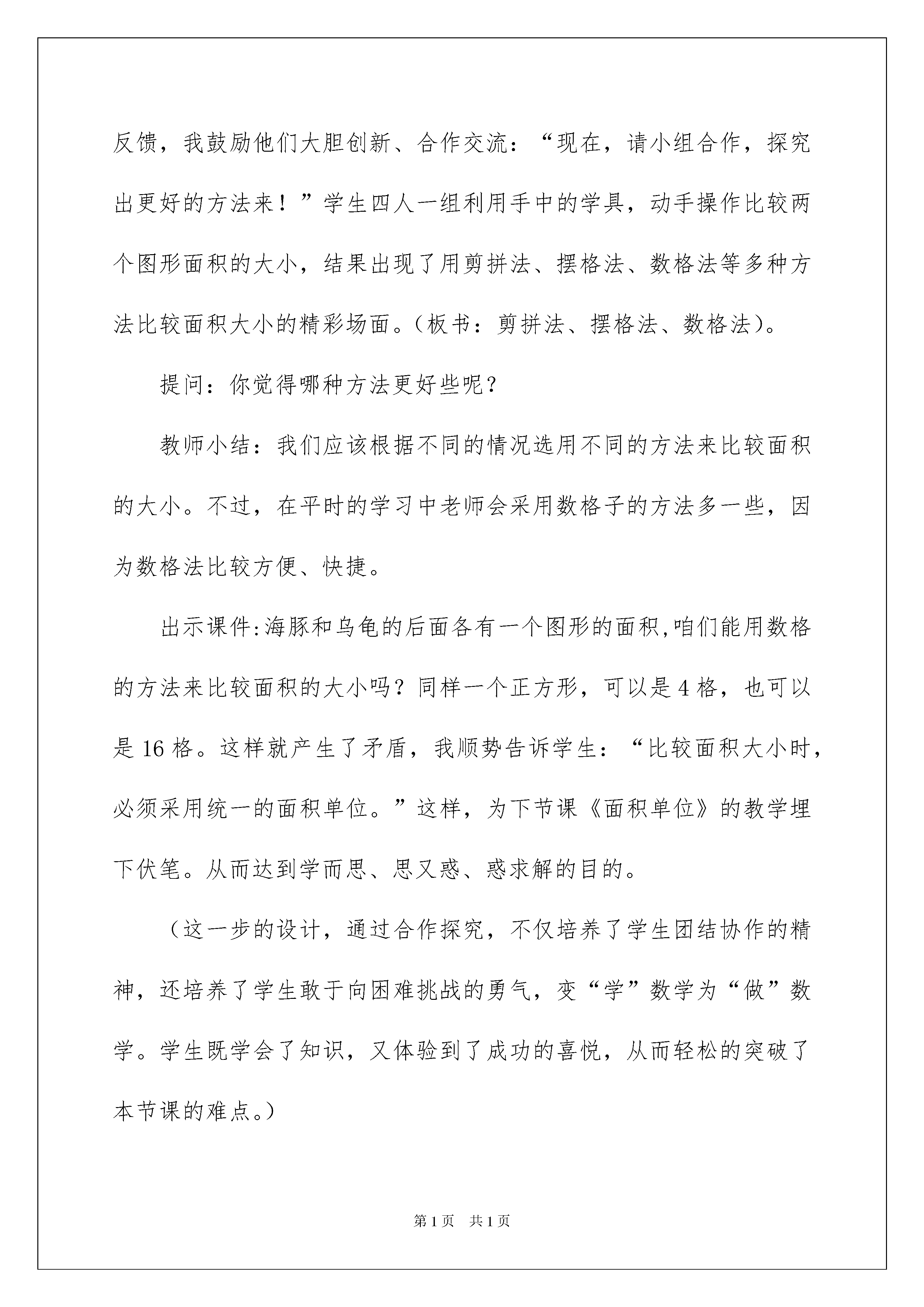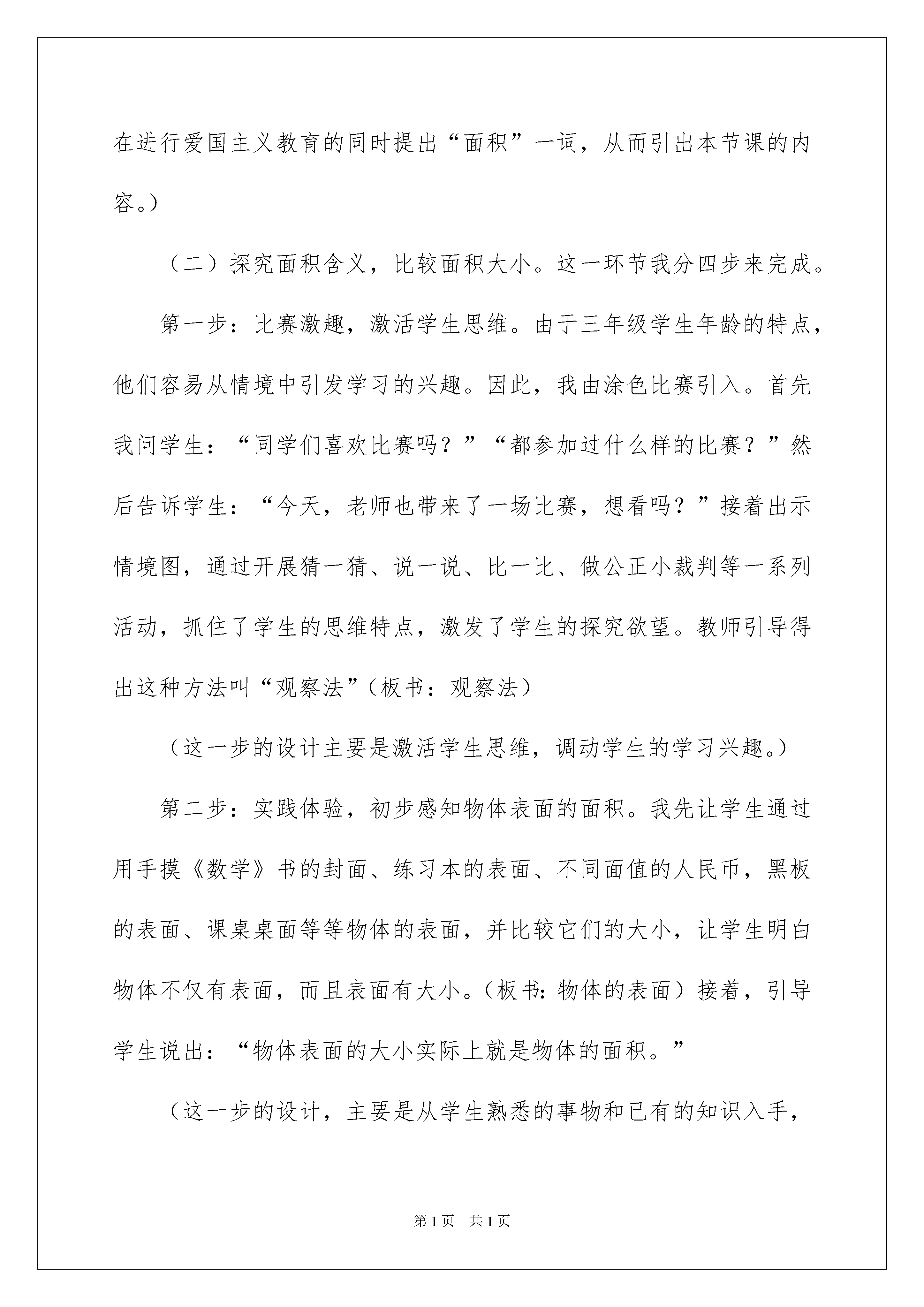 2022什么是面积说课稿什么是面积说课稿作为一名老师,经常须要打算说课稿,写说课稿能有效帮助我们总结和提升讲课技巧。那么你有了解过说课稿吗?下面是我整理的什么是面积说课稿,欢迎大家共享。什么是面积说课稿1一、说教材。1、教材简析:“什么是面积”是北师大版版第六册第四单元面积的第一课时,本课是在学生已经驾驭了长、正方形的特征以及它们的周长的基础上进行教学的,是一维空间向二维空间