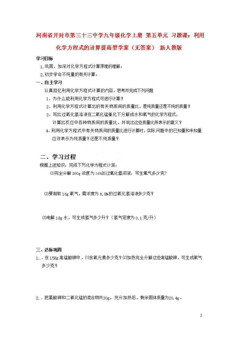 2河南省开封市第三十三中学九年级化学上册第五单元习题课:利用化学方程式的计算提高型学案(无答案)新人教版学习目标1.巩固、加深对化学方程式计算原理的理解。2.初步学会不纯量的有关计算。一、自主学习认真回忆利用化学方程式计算的内容思考并完成下列问题1、为什么能利用化学方程式可进行计算?2、利用化学方程式计算出的有关物质间的质量比是纯质量还是不纯的质量?3、写出过氧化氢溶液在二氧化锰催化下分解成水和氧气的化学方程式计算出反应中各种物质间的质量比并说出这些质量比所表示的意义?4、利用化学方程式中有关物