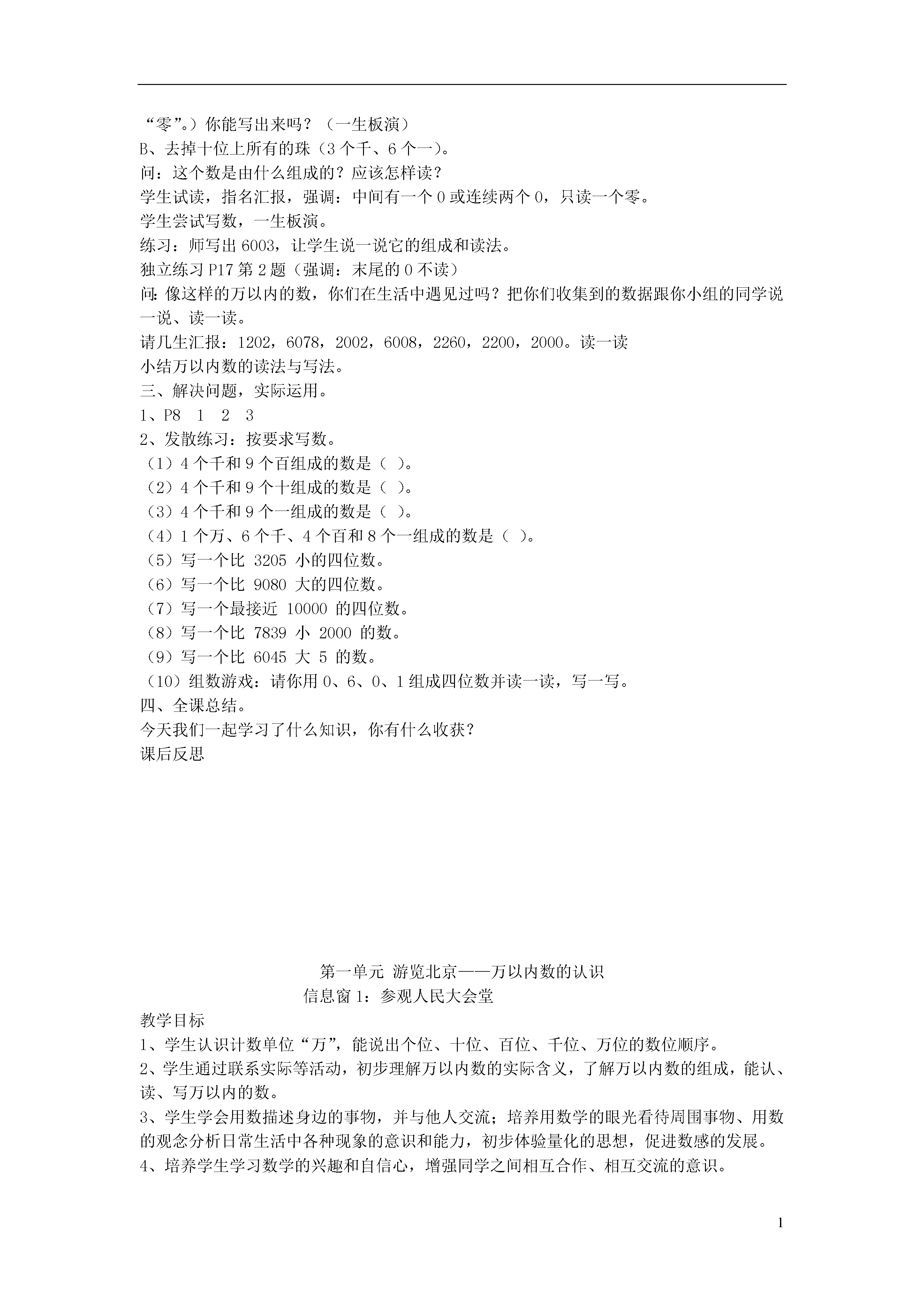 1游览北京—万以内数的认识教学目标:1、体会生活中有大数,感受大数的必要性。经历摆一摆、拨一拨、估一估、数一数、想一想、认一认、说一说等数学实践活动,体验感受万以内数的大小,培养数感。认识“万位”及其位置,能说出万以内各数位的名称及相邻数位之间的进率。4、会读写万以内的数,能用数学的语言和符号描述万以内数的大小。5、进一步学习用具体的数描述生活中的事物,经历与他人交流的活动,培养学习数学的兴趣和自信心。教学重难点:体会“万”的必要性,数感的培养,十进位计数法。教学过程:【