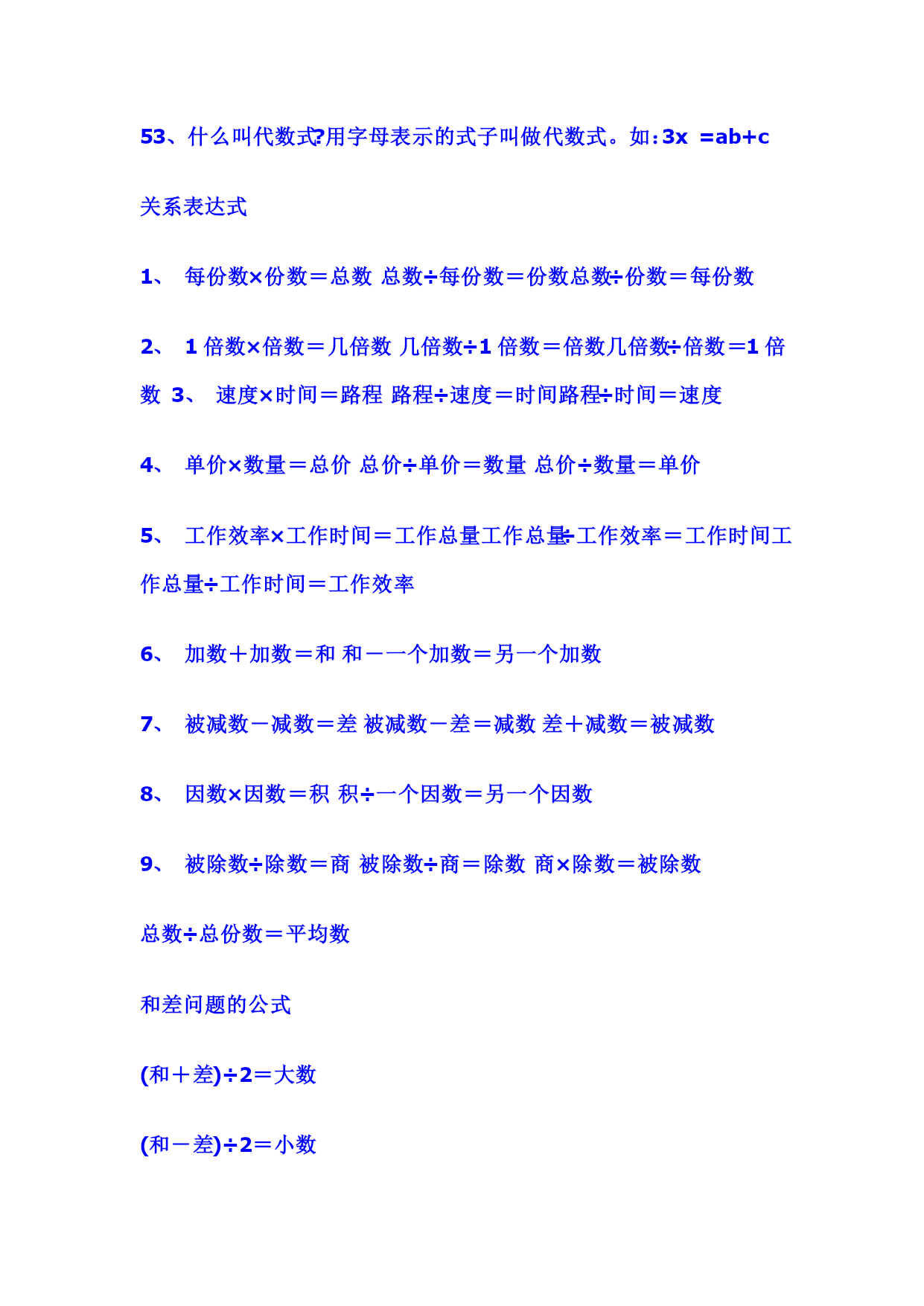 小学数学概念及公式集锦第一部分:概念1、什么叫方程式?答:含有未知数的等式叫方程式。2.分数:把单位“1”平均分成若干份,表示这样的一份或几分的数,叫做分数。3、什么叫比:两个数相除就叫做两个数的比。如:2÷5或3:6或1/3比的基本性质:比的前项和后项同时乘以或除以一个相同的数(0除外),比值不变。4、什么叫比例:表示两个比相等的式子叫做比例。如3:6=9:185、比例的基本性质:在比例里,两外项之积等于两内项之积。6、解比例:求比例中的未知项,叫做解比例。如3:χ=9:187、百分数也叫做百分率或百分