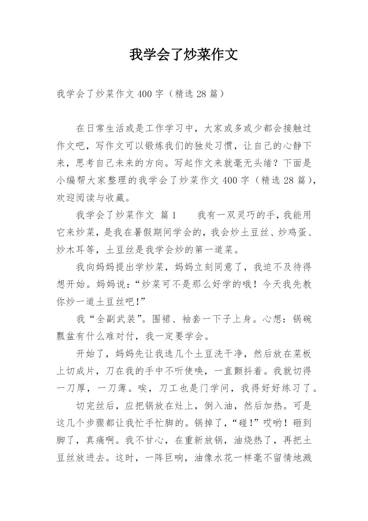 我学会了炒菜作文我学会了炒菜作文400字(精选28篇)在日常生活或是工作学习中,大家或多或少都会接触过作文吧,写作文可以锻炼我们的独处习惯,让自己的心静下来,思考自己未来的方向。写起作文来就毫无头绪?下面是小编帮大家整理的我学会了炒菜作文400字(精选28篇),欢迎阅读与收藏。我学会了炒菜作文篇1我有一双灵巧的手,我能用它来炒菜,是我在暑假期间学会的,我会炒土豆丝、炒鸡蛋、炒木耳等,土豆丝是我学会炒的第一道菜。我向妈妈提出学炒菜,妈妈立刻同意了,我迫不及待得想开始。妈妈说:“炒菜可不是那么好学的哦!今天我