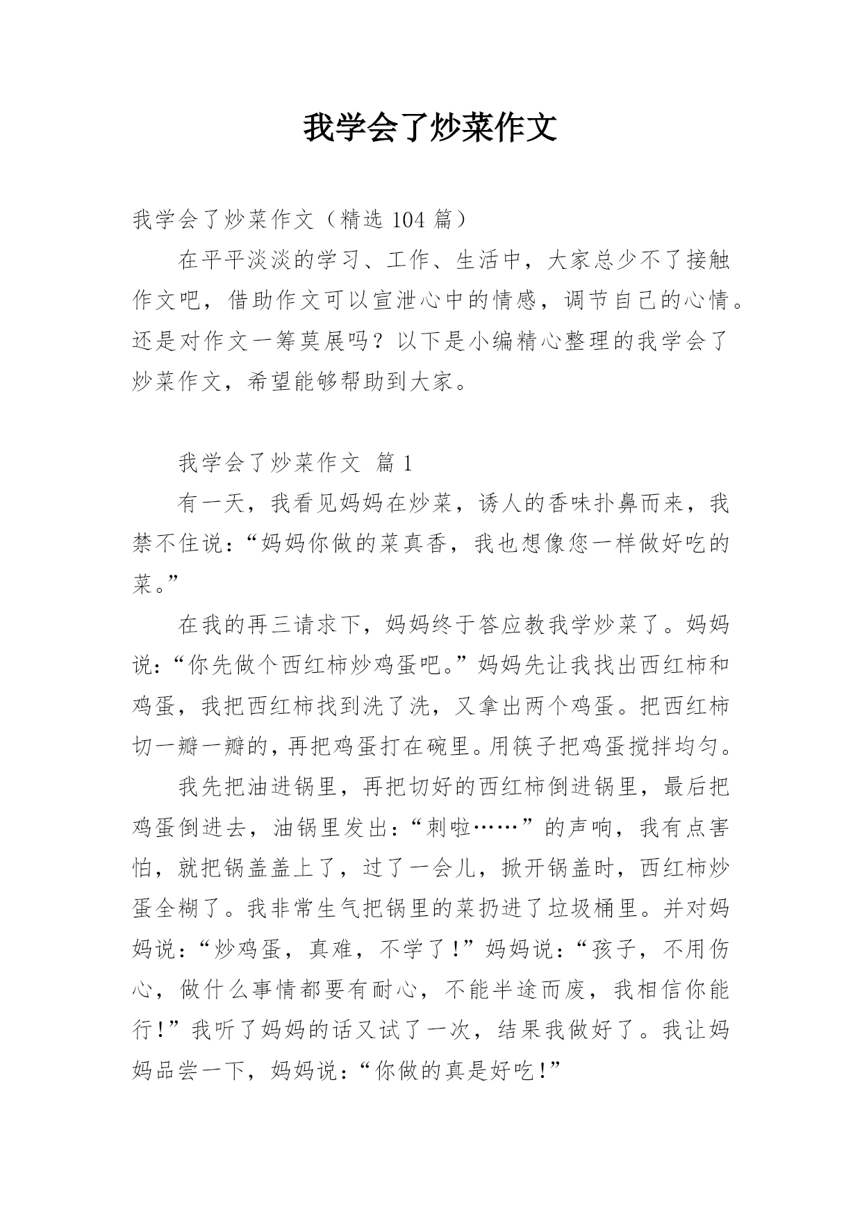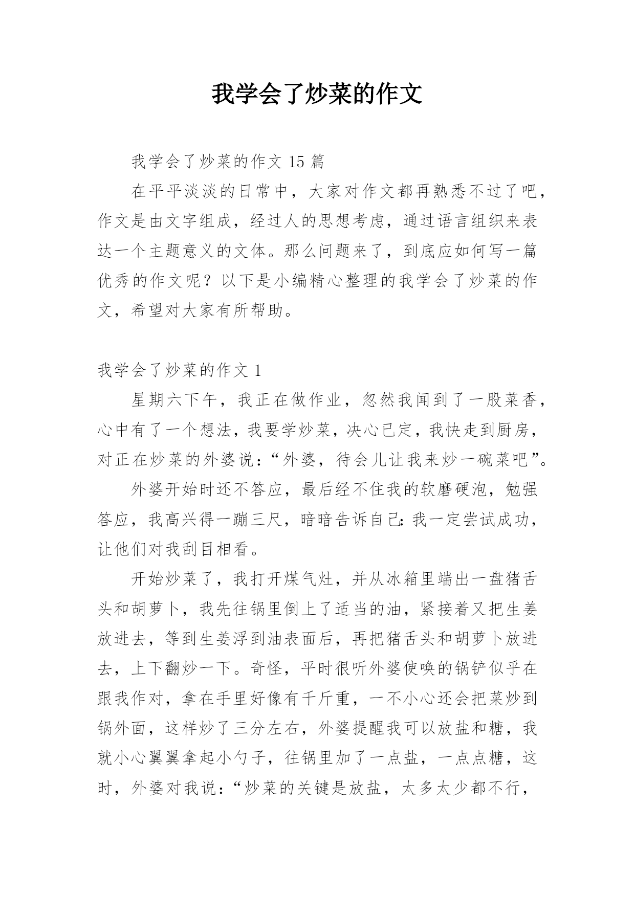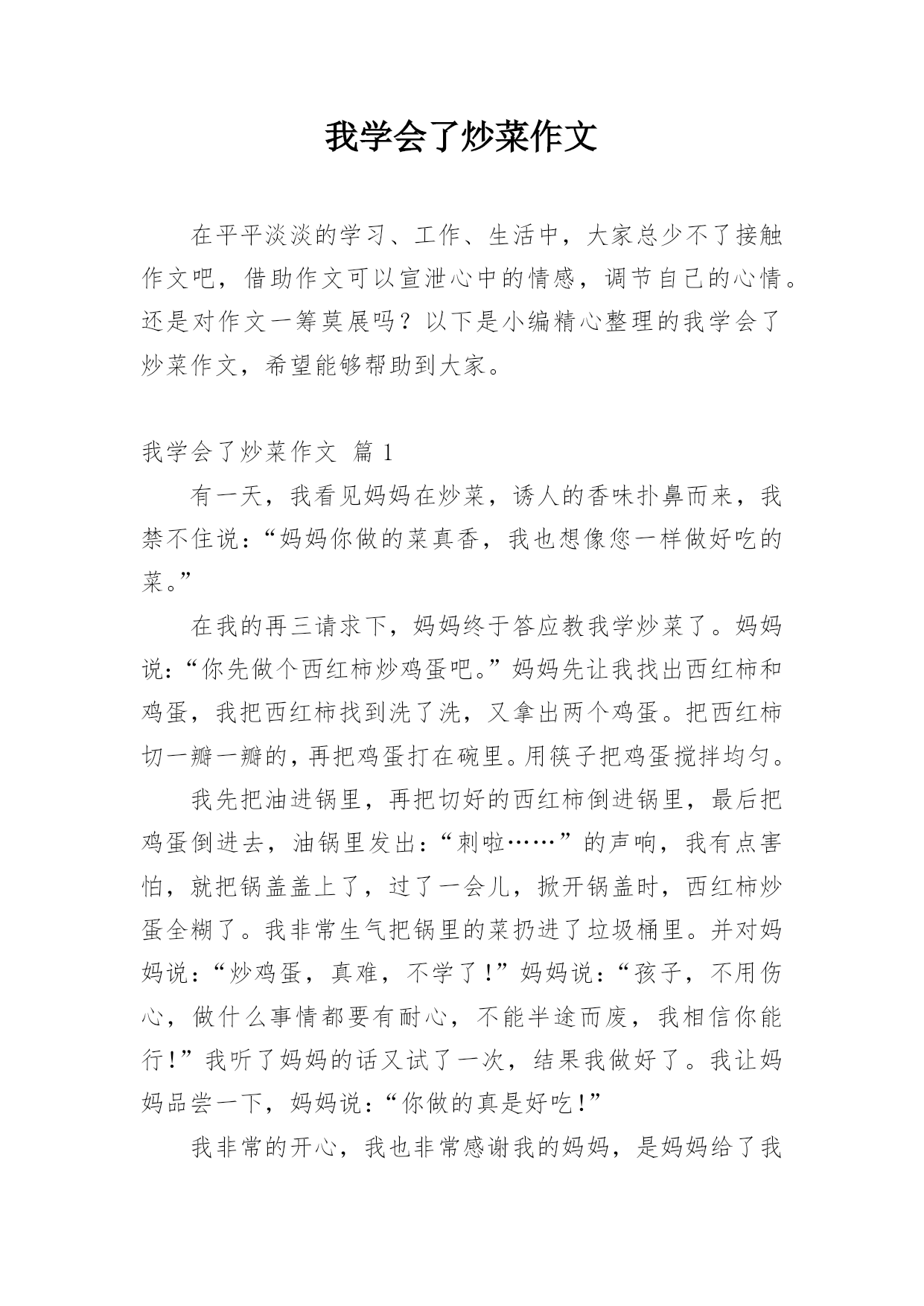 我学会了炒菜的作文我学会了炒菜的作文15篇在平平淡淡的日常中,大家对作文都再熟悉不过了吧,作文是由文字组成,经过人的思想考虑,通过语言组织来表达一个主题意义的文体。那么问题来了,到底应如何写一篇优秀的作文呢?以下是小编精心整理的我学会了炒菜的作文,希望对大家有所帮助。我学会了炒菜的作文1星期六下午,我正在做作业,忽然我闻到了一股菜香,心中有了一个想法,我要学炒菜,决心已定,我快走到厨房,对正在炒菜的外婆说:“外婆,待会儿让我来炒一碗菜吧”。外婆开始时还不答应,最后经不住我的软磨硬泡,勉强答应,我高兴得一蹦