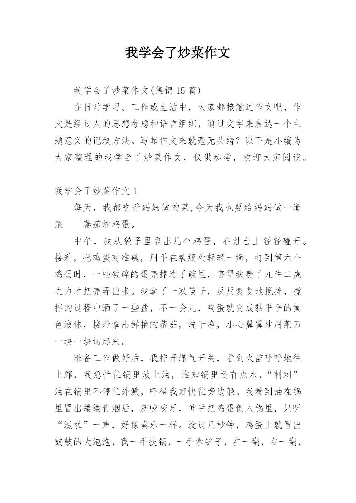 我学会了炒菜作文我学会了炒菜作文(集锦15篇)在日常学习、工作或生活中,大家都接触过作文吧,作文是经过人的思想考虑和语言组织,通过文字来表达一个主题意义的记叙方法。写起作文来就毫无头绪?以下是小编为大家整理的我学会了炒菜作文,仅供参考,欢迎大家阅读。我学会了炒菜作文1每天,我都吃着妈妈做的菜,今天我也要给妈妈做一道菜——蕃茄炒鸡蛋。中午,我从袋子里取出几个鸡蛋,在灶台上轻轻碰开。接着,把鸡蛋对准碗,用手在裂缝处轻轻一掰,打到第六个鸡蛋时,一些破碎的蛋壳掉进了碗里,害得我费了九牛二虎之力才把壳弄出来。我拿了