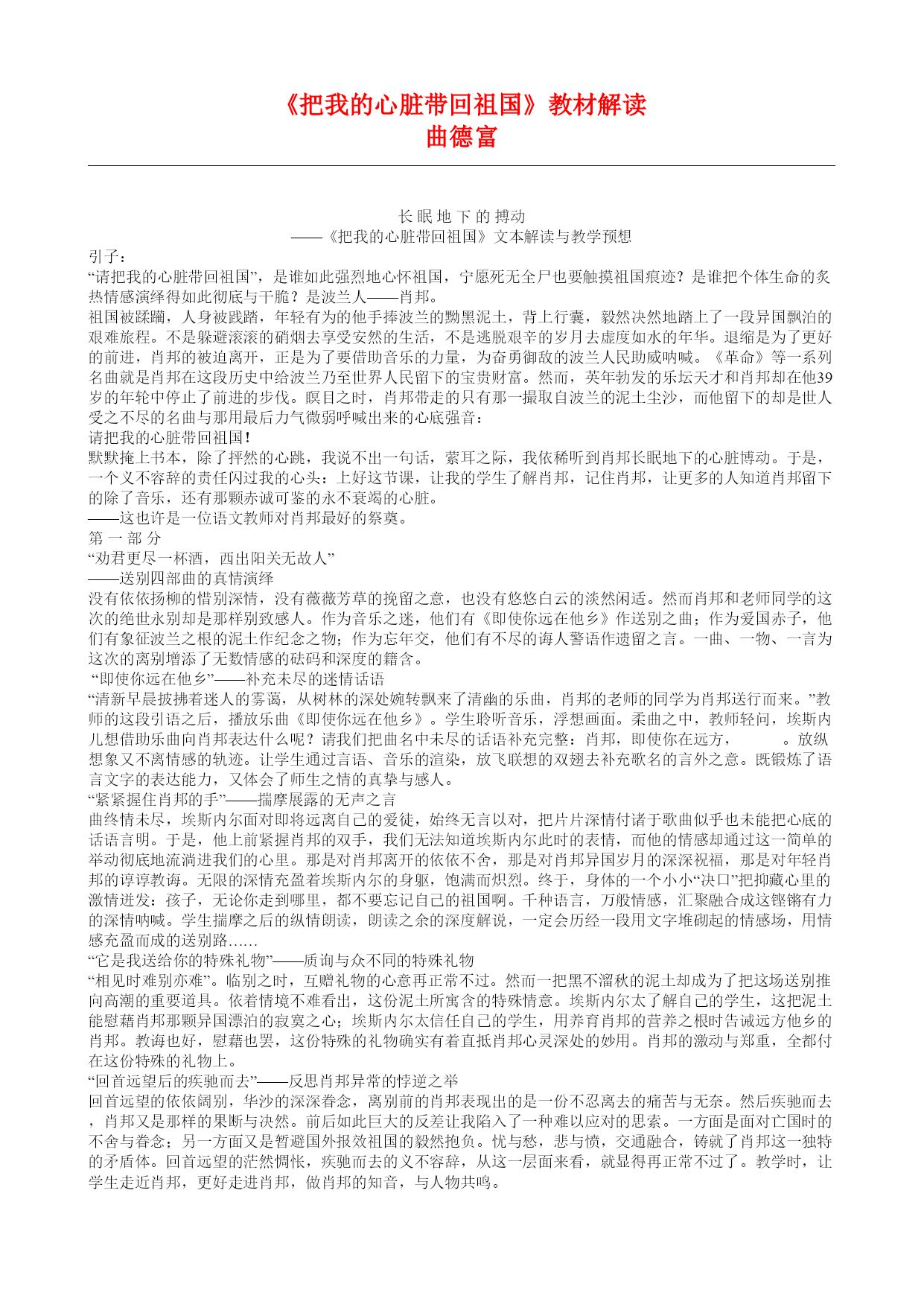 《把我的心脏带回祖国》教材解读曲德富长眠地下的搏动——《把我的心脏带回祖国》文本解读与教学预想引子:“请把我的心脏带回祖国”,是谁如此强烈地心怀祖国,宁愿死无全尸也要触摸祖国痕迹?是谁把个体生命的炙热情感演绎得如此彻底与干脆?是波兰人——肖邦。祖国被蹂躏,人身被践踏,年轻有为的他手捧波兰的黝黑泥土,背上行囊,毅然决然地踏上了一段异国飘泊的艰难旅程。不是躲避滚滚的硝烟去享受安然的生活,不是逃脱艰辛的岁月去虚度如水的年华。退缩是为了更好的前进,肖邦的被迫离开,正是为了要借助音乐的力量,为奋勇御敌的波兰人民助威
