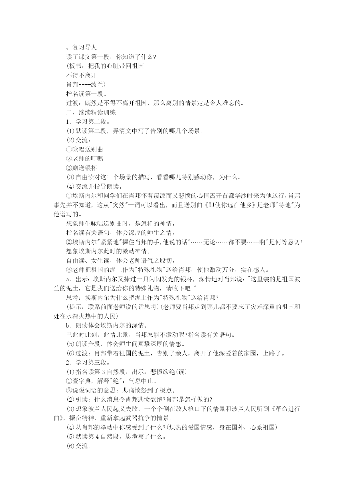 一、复习导人读了课文第一段,你知道了什么?(板书:把我的心脏带回祖国不得不离开肖邦----波兰)指名读第一段。过渡:既然是不得不离开祖国,那么离别的情景定是令人难忘的。二、继续精读训练1.学习第二段。(1)默读第二段,弄清文中写了告别的哪几个场景。(2)交流:①咏唱送别曲②老师的叮嘱③赠送银杯(3)自由读对这三个场景的描写,看看哪儿特别感动你,为什么。(4)交流并指导朗读。①埃斯内尔和同学们在肖邦怀着凄凉而又悲愤的心情离开首都华沙时来为他送行,肖邦事先并不知道,这从"突然"一词可以看出,而且送别曲《即使你