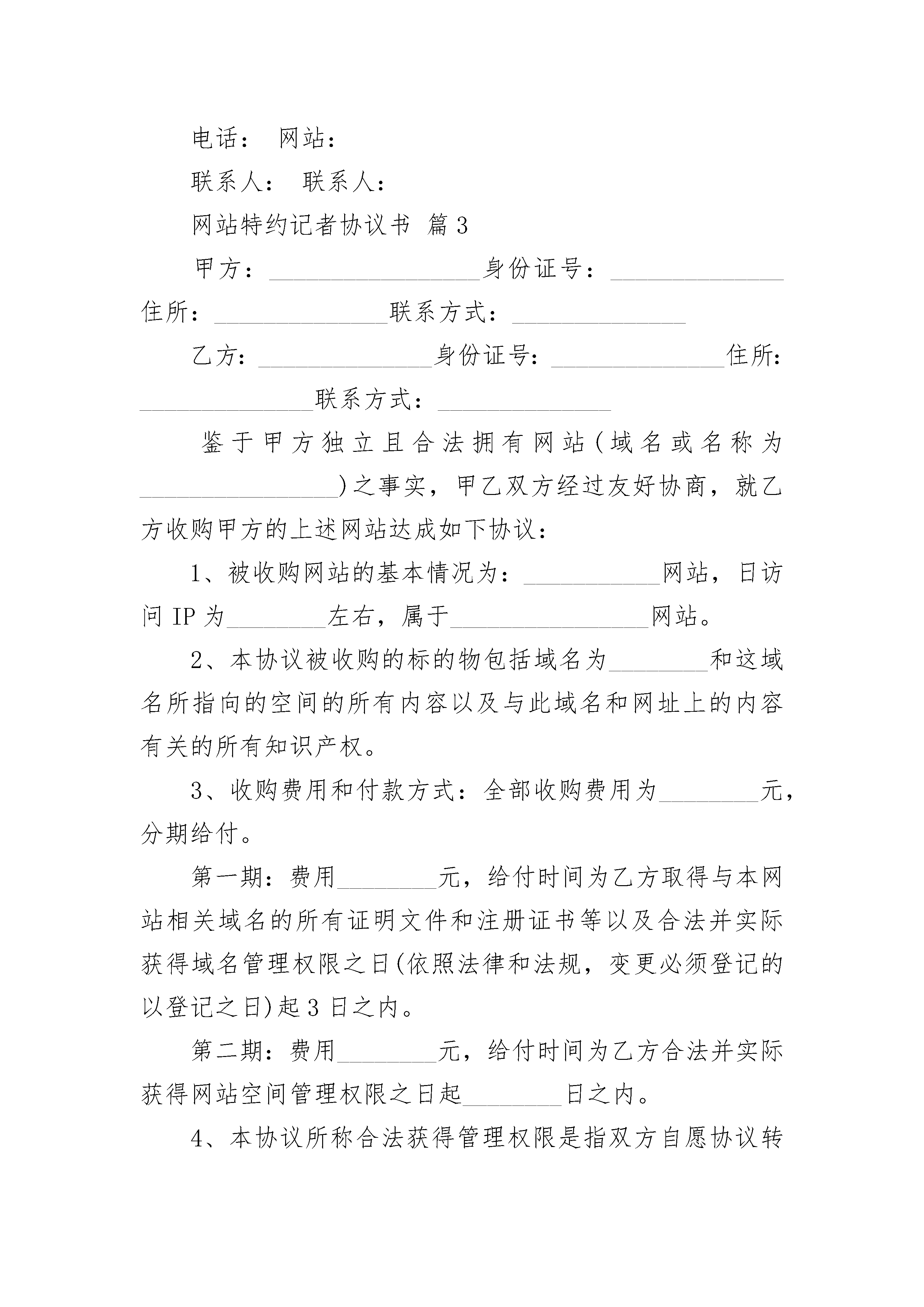 网站特约记者合约网站特约记者合约(通用3篇)网站特约记者合约篇1正文:网站特约记者合约网站特约记者合约甲方:《________________》网站乙方:________________________一、甲方权利和义务1.给乙方发放《________特约记者证》2个(1个为手册样式,1个为胸牌样式)。2.为乙方联系乙方所在地的各种汽车活动及获取参加采访活动的资格(例如:车展门票)。3.定期对乙方的《________特约记者证》进行年检和审核,对表现突出的给予相应的奖励。二、乙方权利和义务1.遵守国家