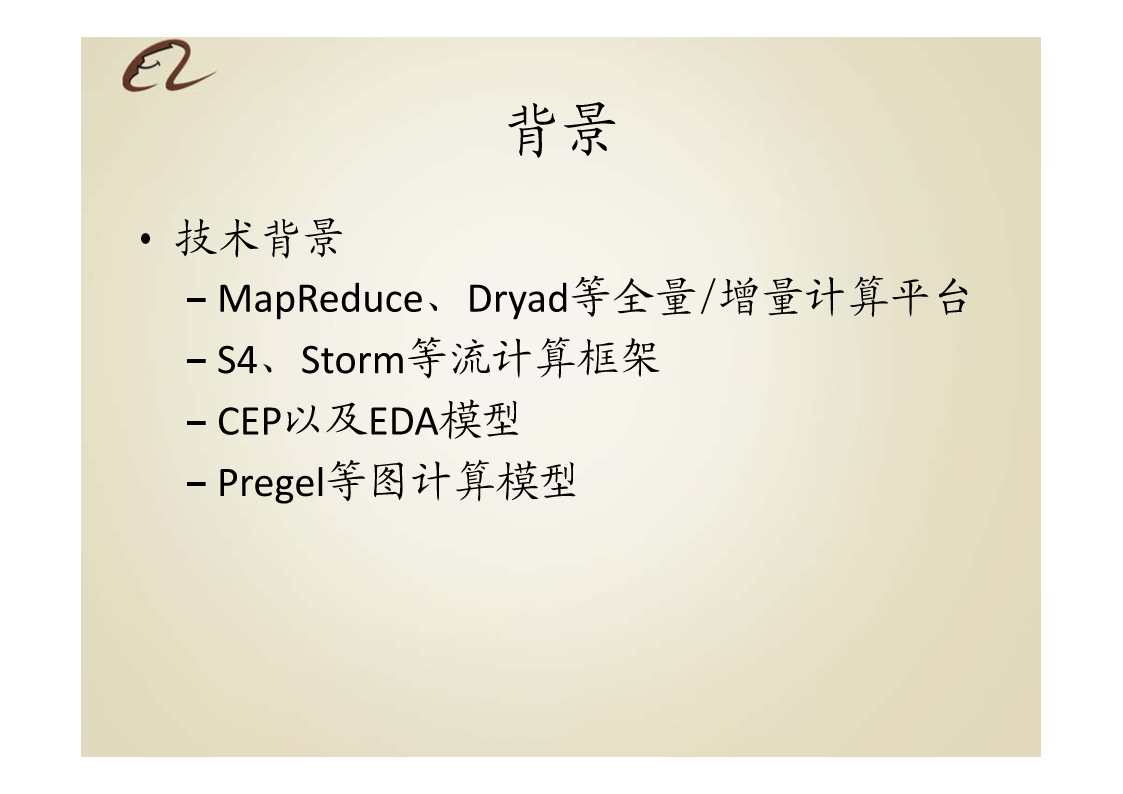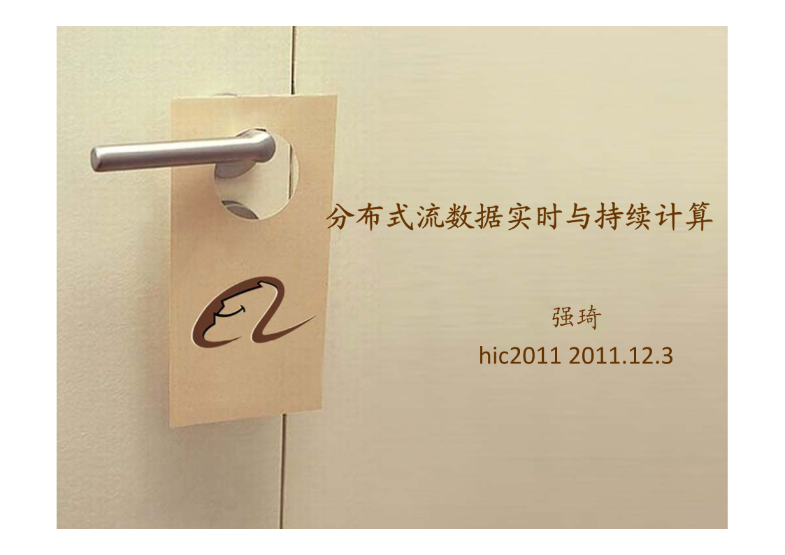 分布式流数据实时与持续计算强琦hic20112011.12.3提纲•背景•目标•传统方案与业界进展•设计理念(重点)•技术架构•要点•例子•系统边界•计划背景•应用背景–数据量急剧增加–Web1.0Æweb2.0,publicÆegonet–电子商务、移动互联网、移动支付–欺诈、风控对海量交易实时性–用户体验的个性化和实时性–由点到面•实时搜索、个人实时信息服务、SNS等背景•技术背景–MapReduce、Dryad等全量/增量计算平台–S4、Storm等流计算框架–CEP以及EDA模型–Pregel等图