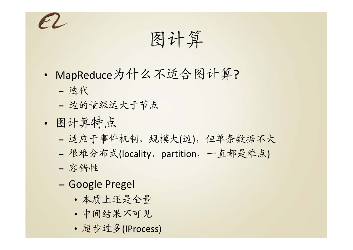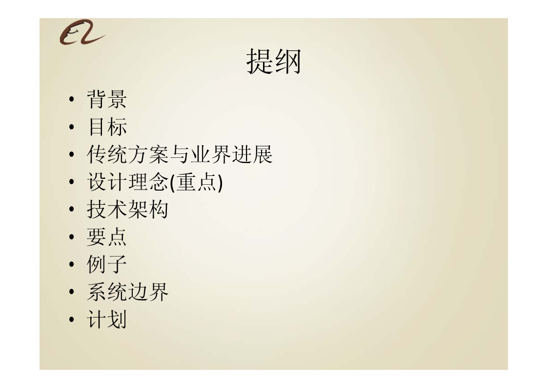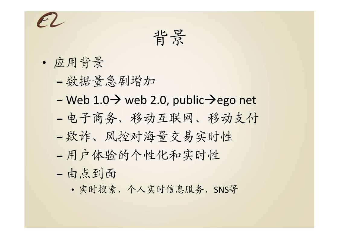 淘宝分布式大数据及实时流数据技术架构提纲•背景•目标•传统方案与业界进展•设计理念(重点)•技术架构•要点•例子•系统边界•计划背景•应用背景–数据量急剧增加–Web1.0web2.0,publicegonet–电子商务、移动互联网、移动支付–欺诈、风控对海量交易实时性–用户体验的个性化和实时性–由点到面•实时搜索、个人实时信息服务、SNS等背景•技术背景MapReduce、Dryad等全量/增量计算平台–S4、Storm等流计算框架CEP以及EDA模型Pregel等图计算模型传统方案与业界进展Had