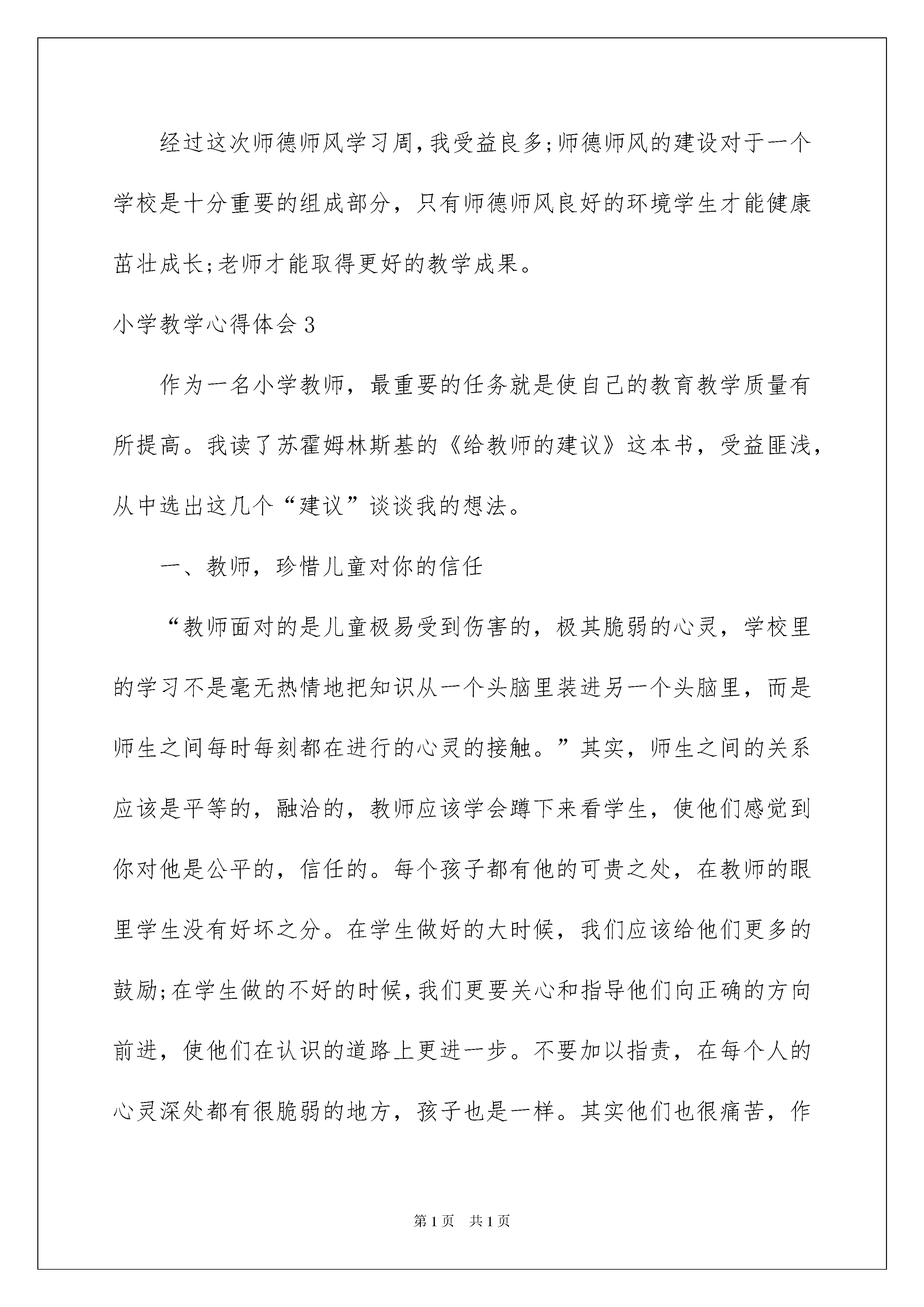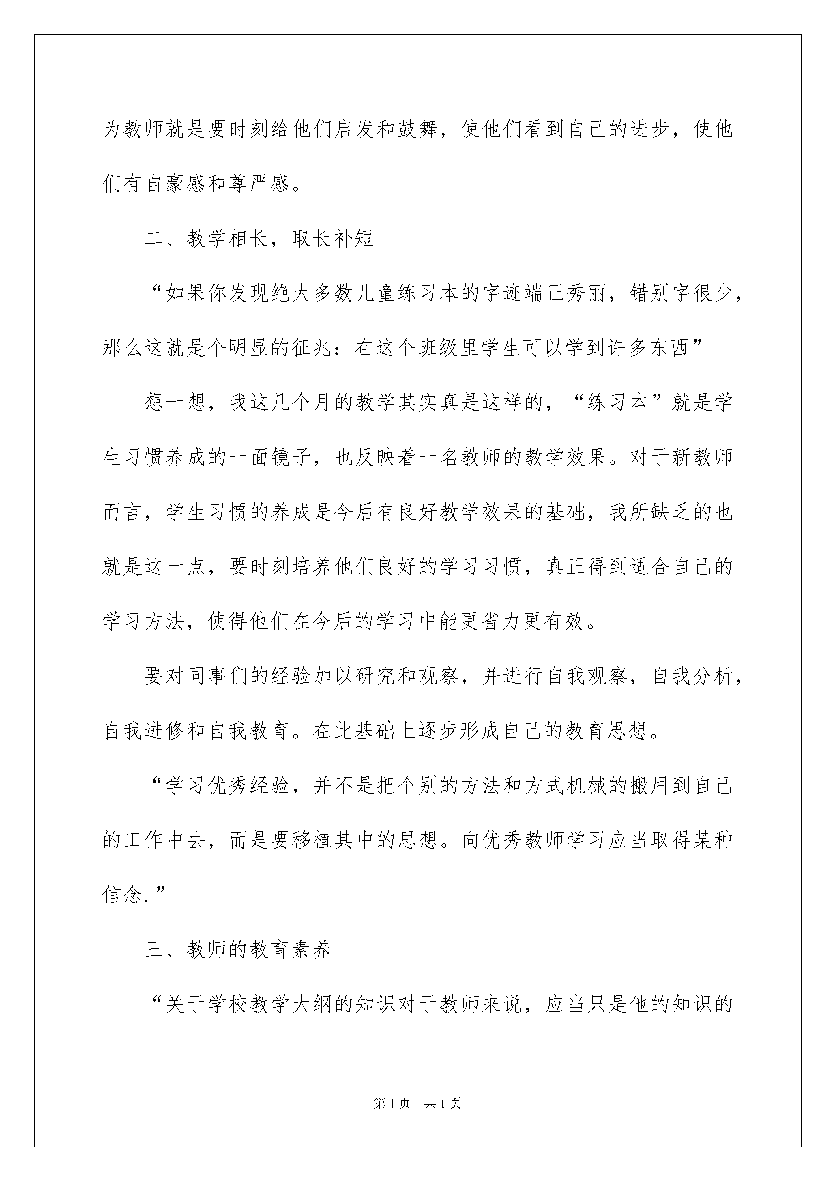 2022小学教学心得体会小学教学心得体会我们心里有一些收获后,有这样的时机,要好好记录下来,这样可以帮助我们分析出现问题的原因,从而找出解决问题的办法。那么心得体会该怎么写?想必这让大家都很苦恼吧,以下是我精心整理的小学教学心得体会,欢迎大家借鉴与参考,希望对大家有所帮助。小学教学心得体会1某一闲时,蓦然回首,自己走上讲台,居然已有20多年了。三年一个轮回,由初一到初三。看着一批批进校时还满脸稚气、乳臭未干的毛孩三年后却变成了或阳光帅气、或亭亭玉立的少男少女,心中便涌出颇多感慨。许是与这些朝气蓬勃的孩子在一起呆得太久了,时常忽略了自己已老之将至,由青丝变华发,由蹦蹦跳跳到步履缓慢,由活力四射到沉静稳重,岁月的痕迹已悄然显现。唯一不变的就是课堂上的激情和对学生一如既往的热爱。二十多年来,学生充实了我的生活,体现着我的生命价值。我一边教给他们知识,一边在他们身上汲取智慧,丰富自己,提高自己。取长补短,互相促进;教学相长,其乐无穷。因为自己读小学时教师素质有限,所以学的普通话并不标准,一些字的读音不时有误,是学生帮我一个个纠正,如“气氛”的“氛”,“兴奋”的“兴”,“憎恶”的“憎”,“浅浅流水声”的“浅浅”等等,我们已达成了很好的默契,只要有错及时提醒。现在我的错音越来越少了。谢谢你们,我的“一字之师”们!有时一堂课会因学生的精彩表现而让人难以忘怀,如给莫怀戚的《散步》再拟题目时,有些学生的回答非常好。有《初春的温暖》、《亲意浓浓》、《爱在田野》等等新颖悦目。自己的一天在学生的精彩中而快乐无限。谢谢你们,免费点亮我每一个平常日子的“小精灵们”!通过看学生随笔,让我了解了学生的内心世界,他们有自己的喜怒哀乐。快乐多多,烦恼多多。因朋友闹别扭而让他们伤心欲绝;因前后桌碰倒了书而硝烟弥漫;因大雾遮日数天而让他们心烦气躁;因生病时一句温暖的问候而暖意融融;因考试进步而兴奋许久;因老师的一句鼓励而学劲十足……一群真实的孩子,一群正在经历成长的孩子!他们的敏感,他们的脆弱,让我明白自己该怎样去维护他们的尊严,怎样走进他们的内心世界,怎样让课堂气氛更融洽,怎样鼓起他们的斗志,怎样与他们一起经风沐雨……面对人生中变化最剧烈的青春期的孩子们,我学到了很多。俗话说“活到老,学到老”,“学然后知不足,教然后知困;知不足,然后能自反也;知困,然后能自强也。故曰‘教学相长’也。”古人真是智慧,一语中的,一条学习规律流传至今。选择了教师,今生无悔!感谢一届一届陪伴我度过三年的学生,你们充实了我人生的每一天!名誉上我是你们的老师,实际上我们是互为人师,互相学习,共同提高。你们让老师青春永驻,你们让老师常教常新,你们让老师与时俱进!谢谢你们,我亲爱的孩子们!教学相长,我们共同进步!小学教学心得体会2教师是“人类灵魂的工程师”,肩负着为祖国的建设与发展培养人才的历史使命。怎样才能不辜负“人类灵魂工程师”这一光荣的称号,怎样才能完成党赋予的培养人才的责任,这是每个教师必须认真对待并要用实践作出回答的问题。我认为,好教师首先必须有敬业精神,要毕生忠诚党的教育事业。要做到这一点,就应充分认识教师工作的意义,从而深深地热爱教育事业。现代的时代是一个竞争激烈的时代。地区与地区的竞争主要体现为综合区力的竞争,综合区力的竞争归根结底是人才的竞争,而人才的培养靠的是教育,靠的是教师兢兢业业的工作。只有深深地认识这一点,才能激发对教师工作的热爱,也才能把这种爱倾注到对学生的教育中去。教师的具体工作在于“传道、授业、解惑”,也就是说教师要通过自身的教学实践,给学生传授知识,培养学生的实践能力,使学生懂得、各种事理。这就要求教师应具有“学而不厌,悔人不倦”来开拓学生的知识视野,丰富学生的知识储备,并在此基础上,培养学生运用知识解决实际问题的能力。与此同时,教师要有崇高的理想,完善的道德情操,坚定的信念,顽强的意志品质,并用它们对学生进行浅够默化的影响和熏陶。这样,才能培养出祖国需要的,全面发展的,能适应竞争形势的有用之才。其次,必须热爱自己的教育对象——学生。教师应该是一位雕塑大师,能将一块坯材,用自己的思想与感情,将它雕塑成一件艺术精品。从本质上看,学生并不存在好与差之分,“差生”之所以“差”,原因在于他们潜能被种种主客观因素所束缚,而未得到充分的释放而已。来自学生自身的主观因素和来自客观的影响。主客观的因素,都会严重束缚学生内在潜能的发挥,都会成为学生健康成长与发展的障碍。正因如此,我们教师对这些所谓的“差生”,更应加备的关爱与呵护。在他们身上,我们要倾注全部的爱,去发现他们学习上每一点滴的进步,去寻找他们生活中,品德上每一个闪