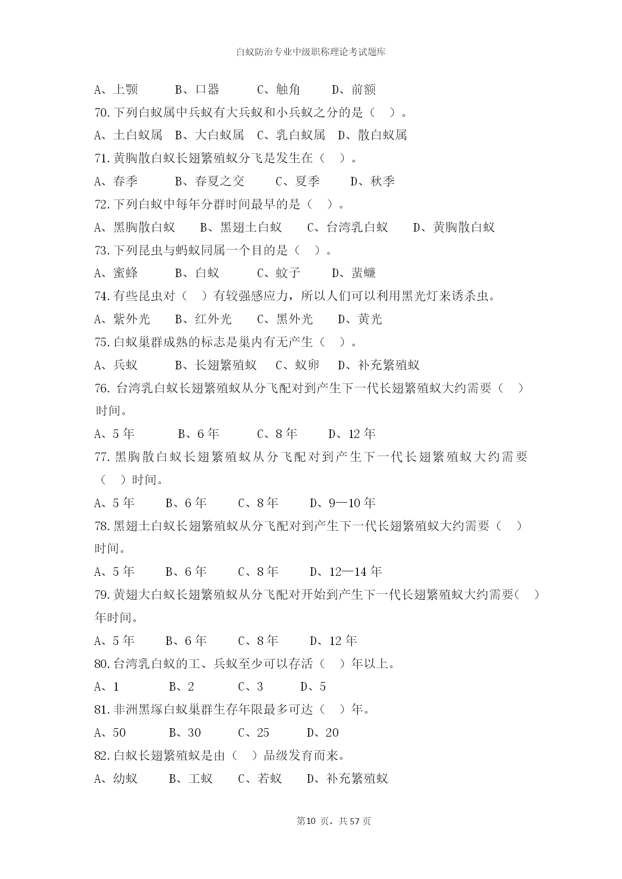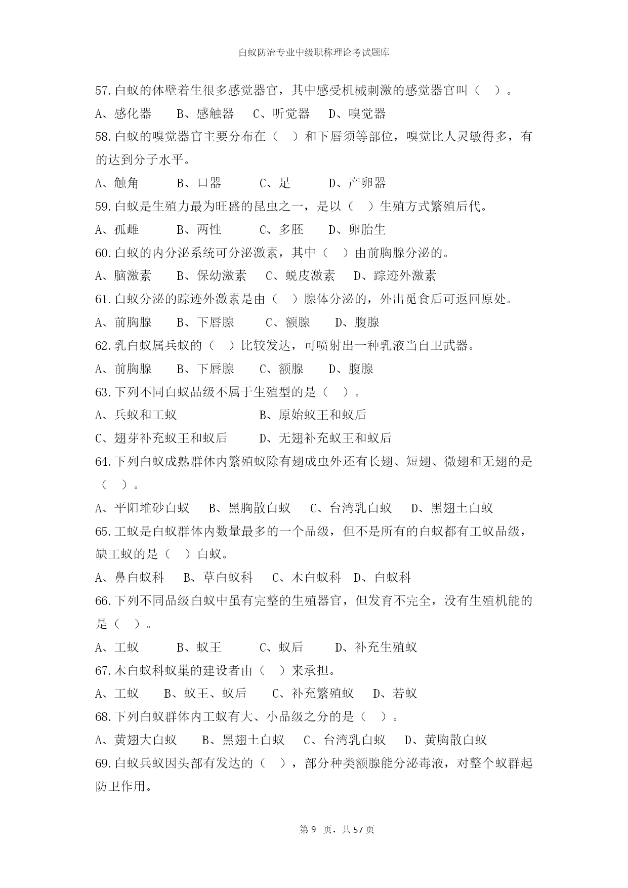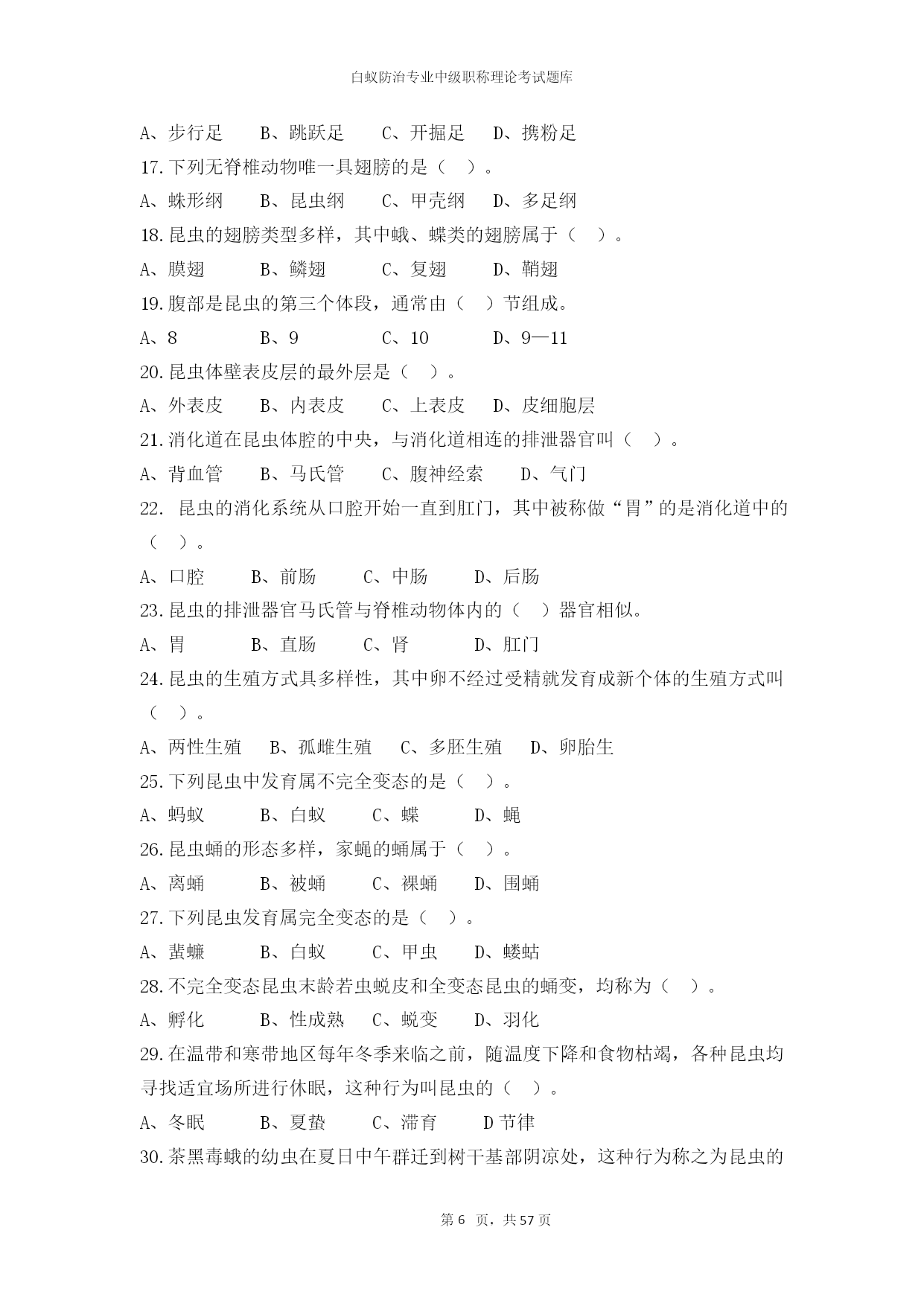白蚁防治专业中级职称理论考试题库PAGE\*MERGEFORMAT57第页,白蚁防治专业中级职称理论考试题库判断题(正确的请在括号内填“A”,错误的请在括号内填“B”,共100题)。()1.白蚁属全变态昆虫,有蛹期。()2.白蚁的下唇腺能分泌诱食信息素。()3.昆虫体壁的最外层是外表皮。()4.卵不经过受精就发育成新个体的生殖方式叫孤雌生殖。()5.木蠹蛾成虫的口器类型是虹吸式。()6.蝴蝶属半翅目昆虫。()7.昆虫抗药性是指种群的特性,而不是昆虫个体改变的结果。()8.保幼激素是昆虫咽侧体分泌的一