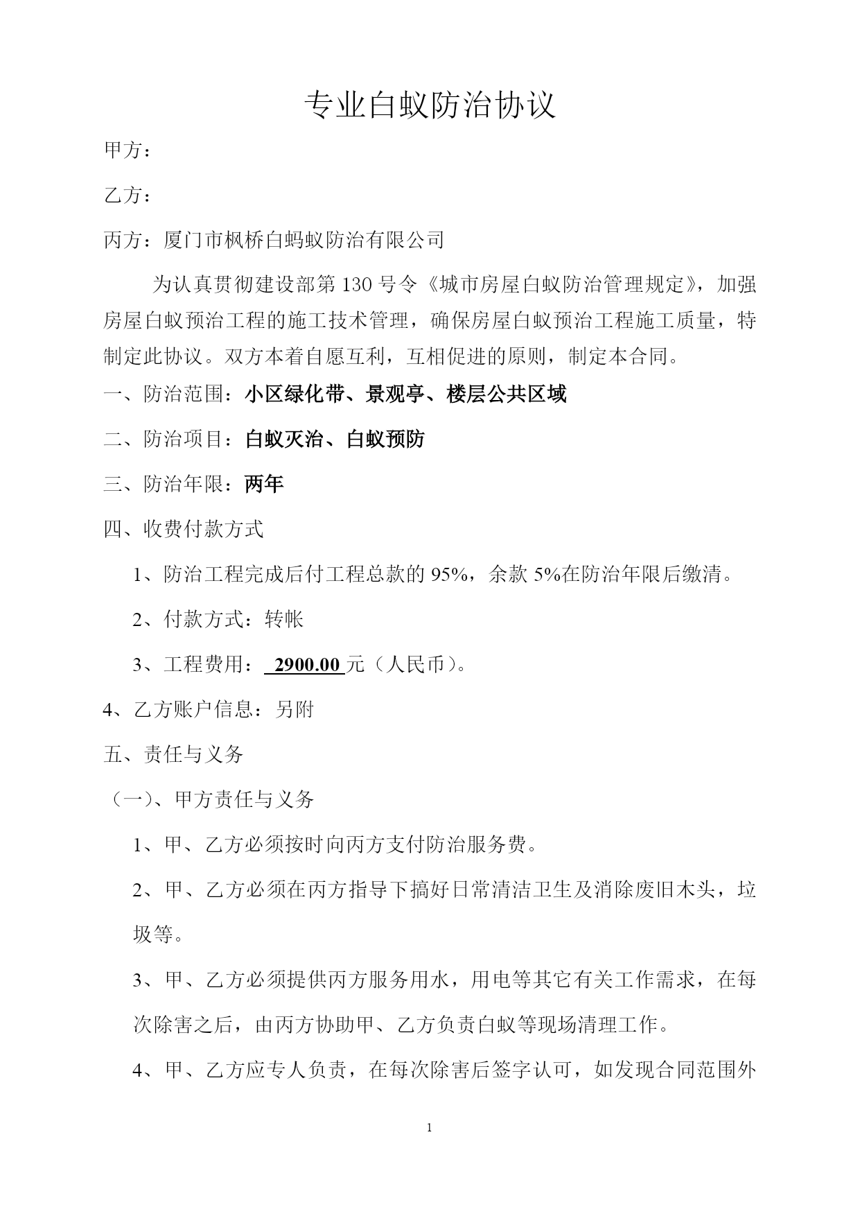 专业白蚁防治协议甲方:乙方:丙方:厦门市枫桥白蚂蚁防治有限公司为认真贯彻建设部第130号令《城市房屋白蚁防治管理规定》,加强房屋白蚁预治工程的施工技术管理,确保房屋白蚁预治工程施工质量,特制定此协议。双方本着自愿互利,互相促进的原则,制定本合同。一、防治范围:小区绿化带、景观亭、楼层公共区域二、防治项目:白蚁灭治、白蚁预防三、防治年限:两年四、收费付款方式1、防治工程完成后付工程总款的95%,余款5%在防治年限后缴清。2、付款方式:转帐3、工程费用:2900.00元(人民币)