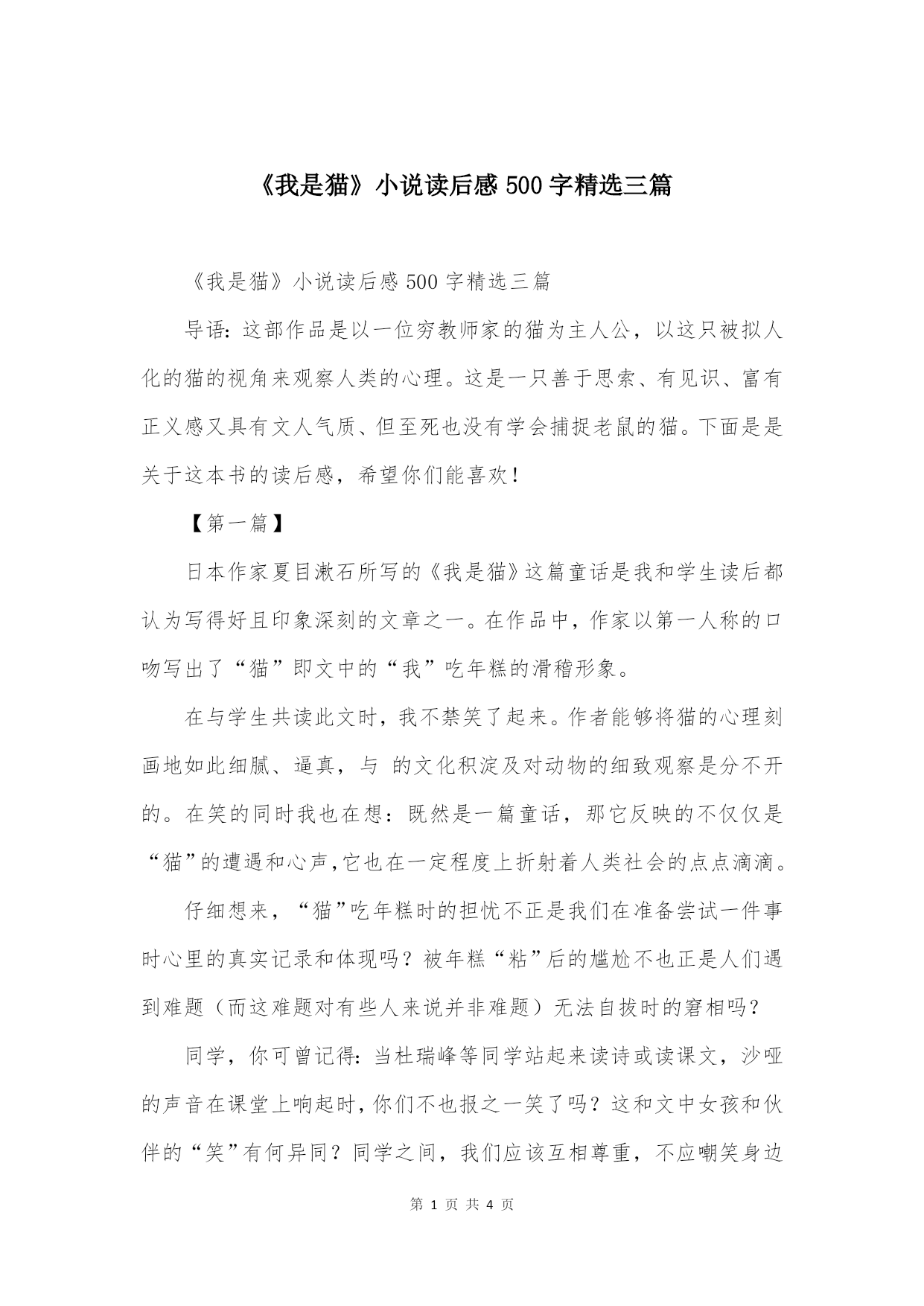 第PAGE\*MERGEFORMAT4页共NUMPAGES\*MERGEFORMAT4页《我是猫》小说读后感500字精选三篇《我是猫》小说读后感500字精选三篇导语:这部作品是以一位穷教师家的猫为主人公,以这只被拟人化的猫的视角来观察人类的心理。这是一只善于思索、有见识、富有正义感又具有文人气质、但至死也没有学会捕捉老鼠的猫。下面是是关于这本书的读后感,希望你们能喜欢!【第一篇】日本作家夏目漱石所写的《我是猫》这篇童话是我和学生读后都认为写得好且印象深刻的文章之一。在作品中,作家以第一人称的口