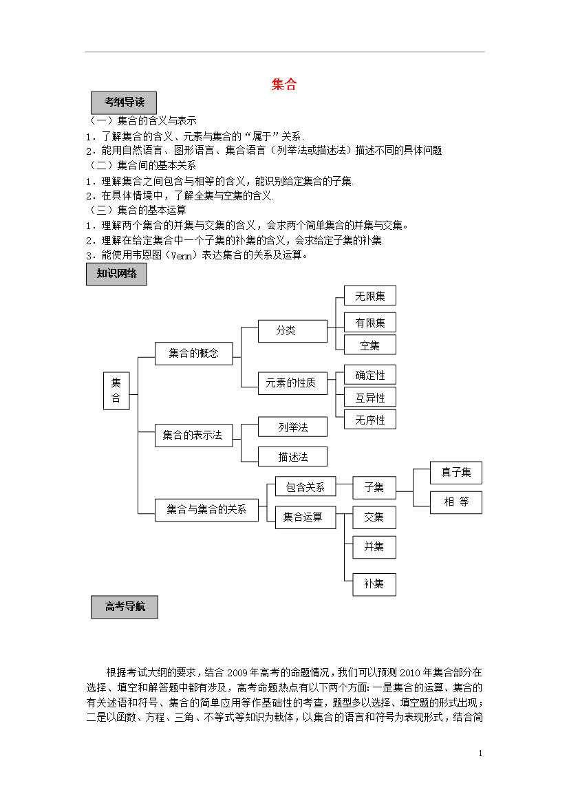 13考纲导读集合(一)集合的含义与表示1.了解集合的含义、元素与集合的“属于”关系.2.能用自然语言、图形语言、集合语言(列举法或描述法)描述不同的具体问题(二)集合间的基本关系1.理解集合之间包含与相等的含义,能识别给定集合的子集.2.在具体情境中,了解全集与空集的含义.(三)集合的基本运算1.理解两个集合的并集与交集的含义,会求两个简单集合的并集与交集。2.理解在给定集合中一个子集的补集的含义,会求给定子集的补集.3.能使用韦恩图(Venn)表达集合的关系及运算。相等真子集列举法描述法确定性包含关系无