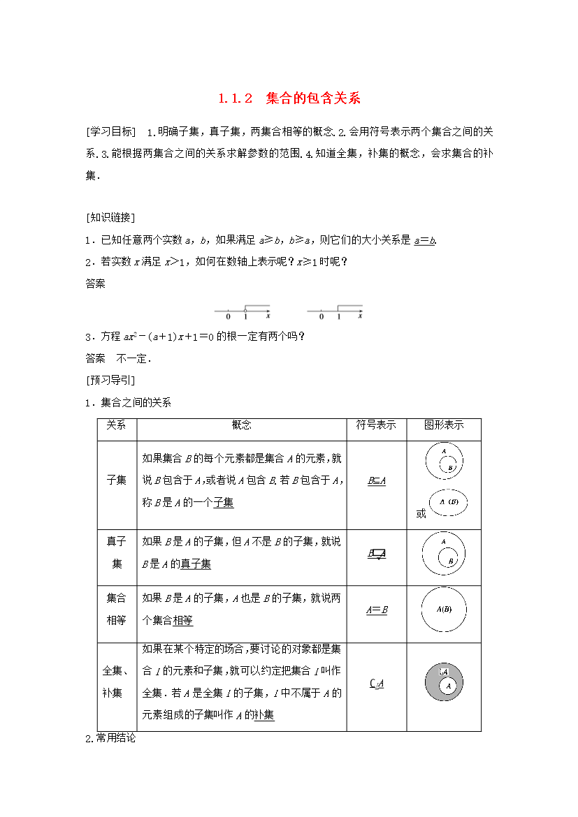 1.1.2集合的包含关系[学习目标]1.明确子集真子集两集合相等的概念.2.会用符号表示两个集合之间的关系.3.能根据两集合之间的关系求解参数的范围.4.知道全集补集的概念会求集合的补集.[知识链接]1.已知任意两个实数ab如果满足a≥bb≥a则它们的大小关系是a=b.2.若实数x满足x>1如何在数轴上表示呢?x≥1时呢?答案3.方程ax2-(a+1)x+1=0的根一定有两个吗?答案不一定.[预习导引]1.集合之间的关系关系概念符号表示图形表示子集如果集合B的每个元素都是集合A的元素就说B包含于A