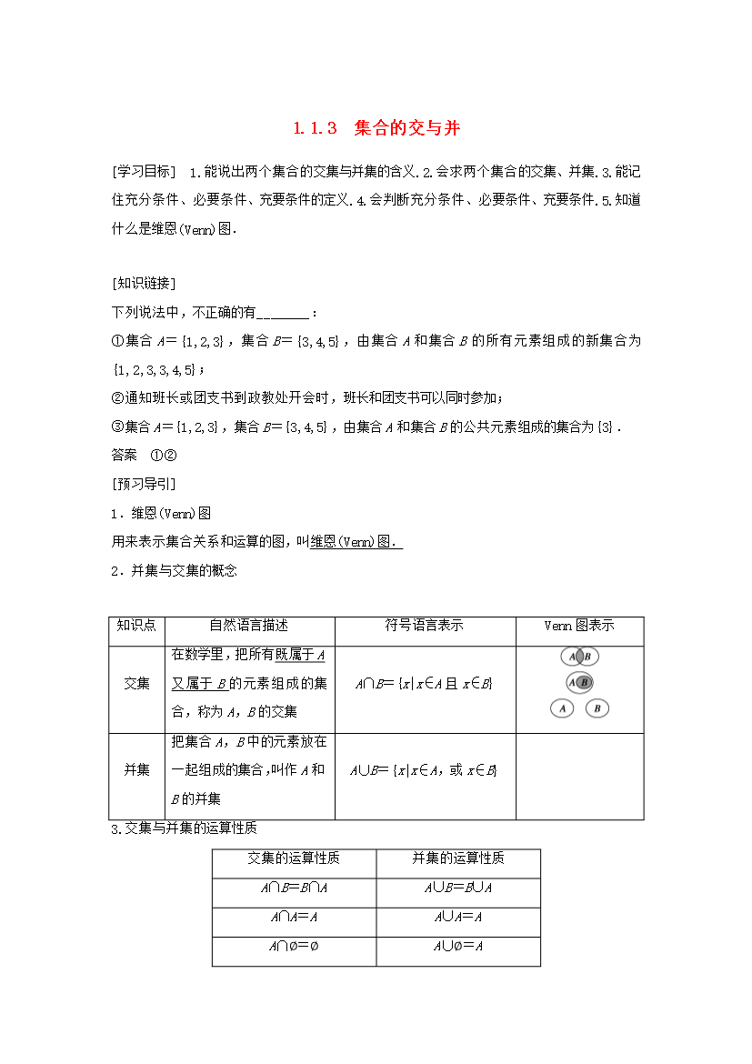 1.1.3集合的交与并[学习目标]1.能说出两个集合的交集与并集的含义.2.会求两个集合的交集、并集.3.能记住充分条件、必要条件、充要条件的定义.4.会判断充分条件、必要条件、充要条件.5.知道什么是维恩(Venn)图.[知识链接]下列说法中不正确的有________:①集合A={123}集合B={345}由集合A和集合B的所有元素组成的新集合为{123345};②通知班长或团支书到政教处开会时班长和团支书可以同时参加;③集合A={123}集合B={345}由集合A和集合B的公共元素组成的集合为{3