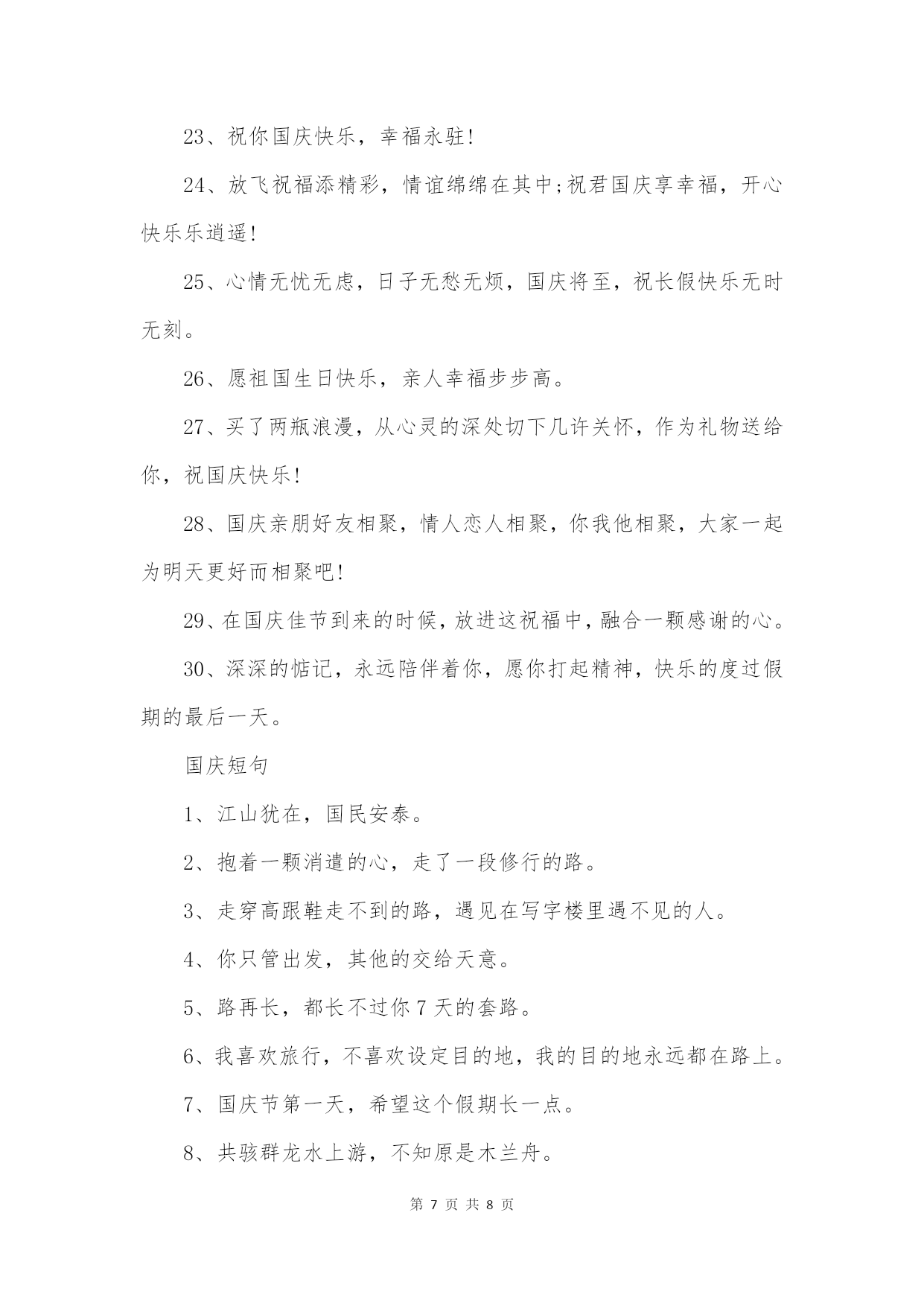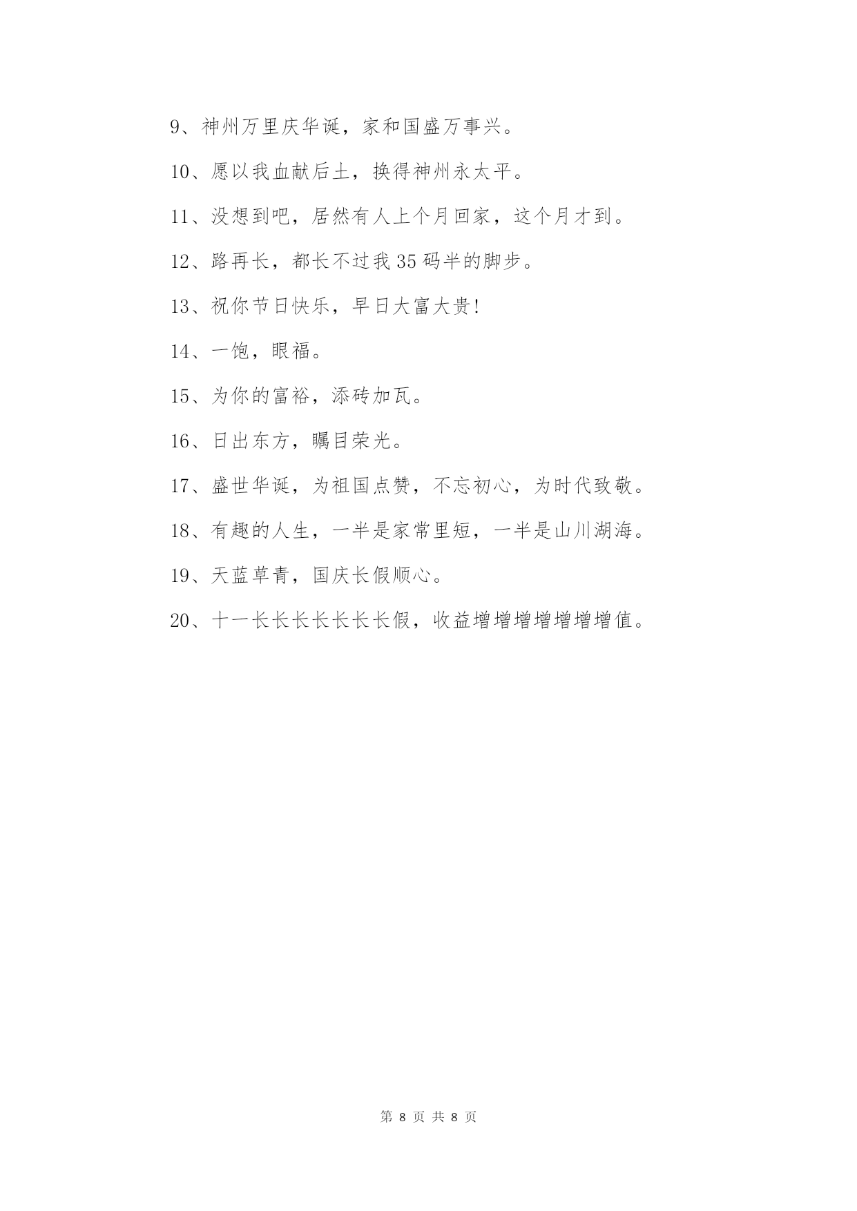 第PAGE\*MERGEFORMAT8页共NUMPAGES\*MERGEFORMAT8页2022国庆节经典语录国庆节到来一刻,让我们与国同庆,回想一下祖国的积淀与文明,我们学习上的乘风破浪奔向大海,那么你有什么想要和祖国母亲说的吗?本店铺在这里给大家带来2022国庆节经典语录,希望大家喜欢!·国庆节经典语录1、十月的秋天是收获的季节,十月的问候是真切的关怀,十月的我用最深情的手指敲击出最美的祝福送给远方的你,希望你快乐健康。2、把烦恼抛之脑后,让快乐跟着走;把忙碌甩在身后,让身体放轻松;把疲惫