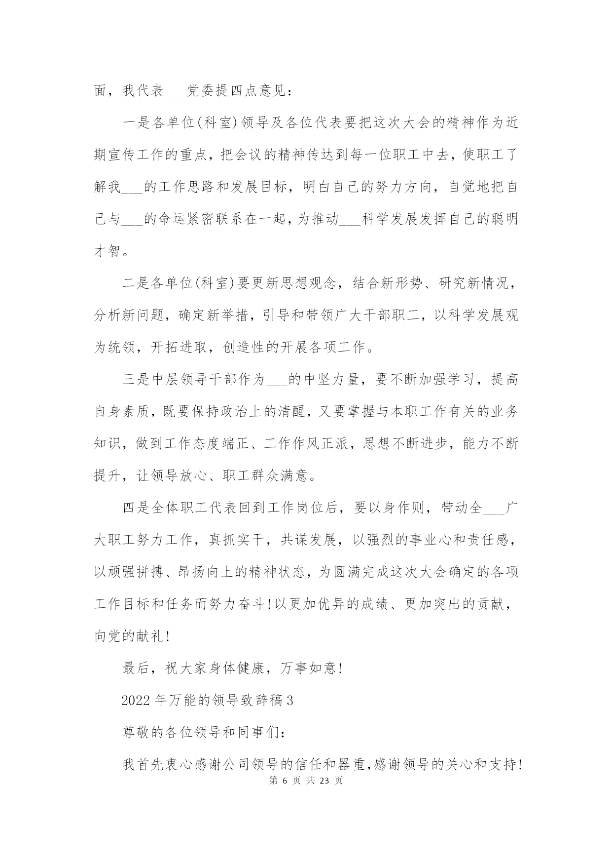 第PAGE\*Arabic\*MERGEFORMAT16页共NUMPAGES\*MERGEFORMAT16页篇一:领导万能讲话稿领导讲话稿同志们:今天,我们在这里召开会议(隆重集会),我认为是十分必要的,这对于某某工作的开展,具有十分重要的指导意义。对于刚才某某同志的的讲话,我认为,讲得非常好,非常深刻。希望在座的同志,要认真领会,深刻理解。回去后,注意传达学习,并认真抓好落实,确实把工作往前赶、往实里抓。真抓实干,扎实地推动某某工作的顺利开展,努力创造某某工作的新局面。对于某某工作,我在这里