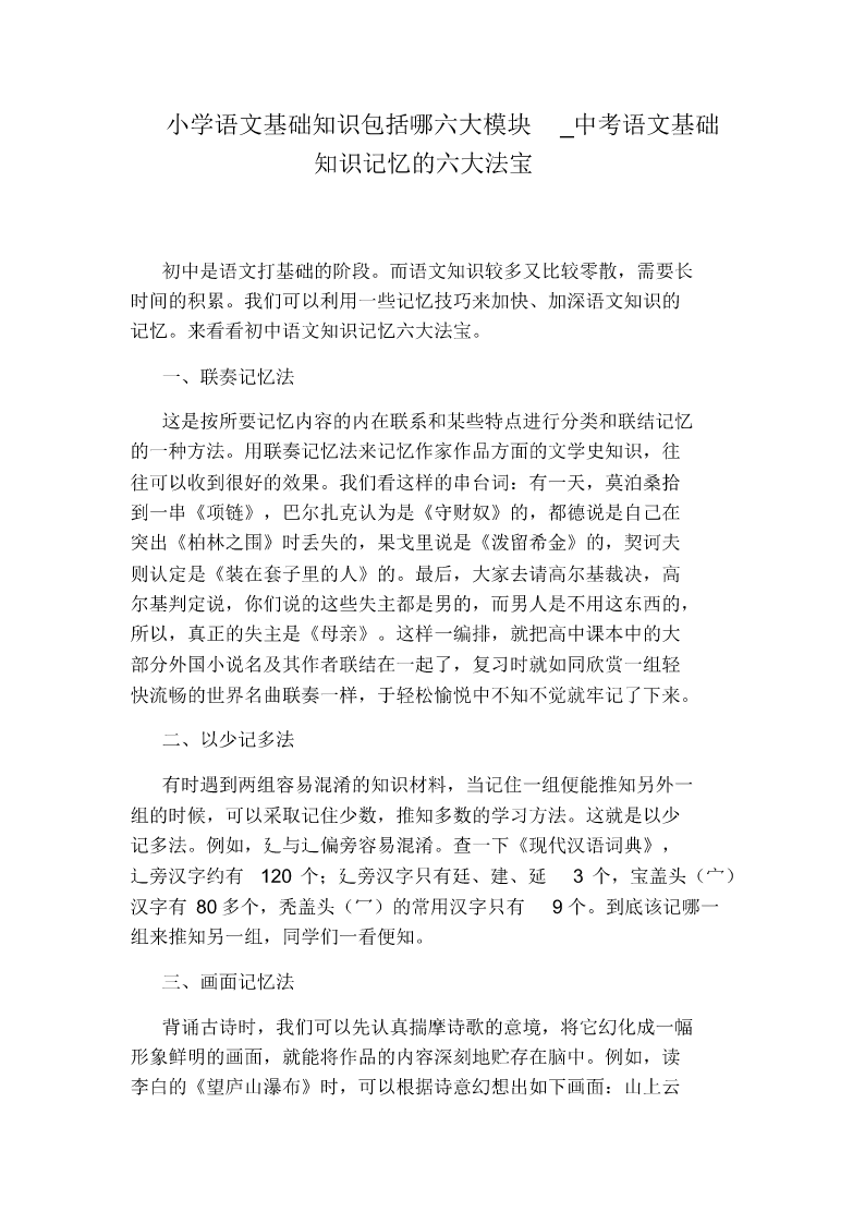 中考语文基础知识六大记忆法宝2017中考语文基础知识六大记忆法宝语文知识较多又比较零散,需要长时间的积累。为帮助考生们加深语文知识的记忆,以下是百分网小编搜索整理的关于中考语文基础知识六大记忆法宝,供参考学习,希望对大家有所帮助!想了解更多相关信息请持续关注我们应届毕业生考试网!一、联奏记忆法这是按所要记忆内容的内在联系和某些特点进行分类和联结记忆的一种方法。用“联奏记忆法”来记忆作家作品方面的文学史知识,往往可以收到很好的效果。我们看这样的“串台词”:有一天,莫泊桑拾到一串《项链》,巴尔扎克认为是《守财