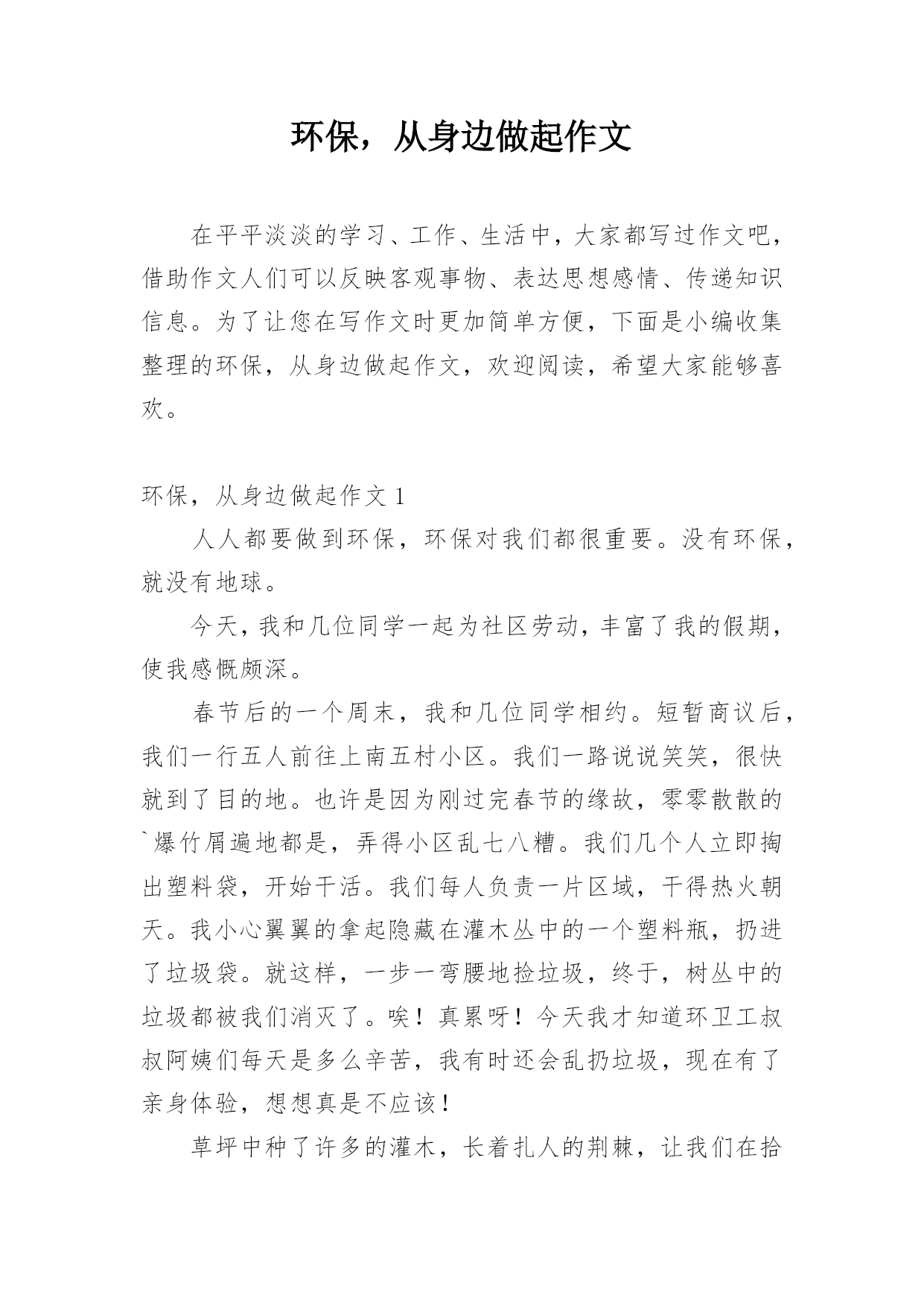 环保,从身边做起作文在平平淡淡的学习、工作、生活中,大家都写过作文吧,借助作文人们可以反映客观事物、表达思想感情、传递知识信息。为了让您在写作文时更加简单方便,下面是小编收集整理的环保,从身边做起作文,欢迎阅读,希望大家能够喜欢。环保,从身边做起作文1人人都要做到环保,环保对我们都很重要。没有环保,就没有地球。今天,我和几位同学一起为社区劳动,丰富了我的假期,使我感慨颇深。春节后的一个周末,我和几位同学相约。短暂商议后,我们一行五人前往上南五村小区。我们一路说说笑笑,很快就到了目的地。也许是因为刚过完春节