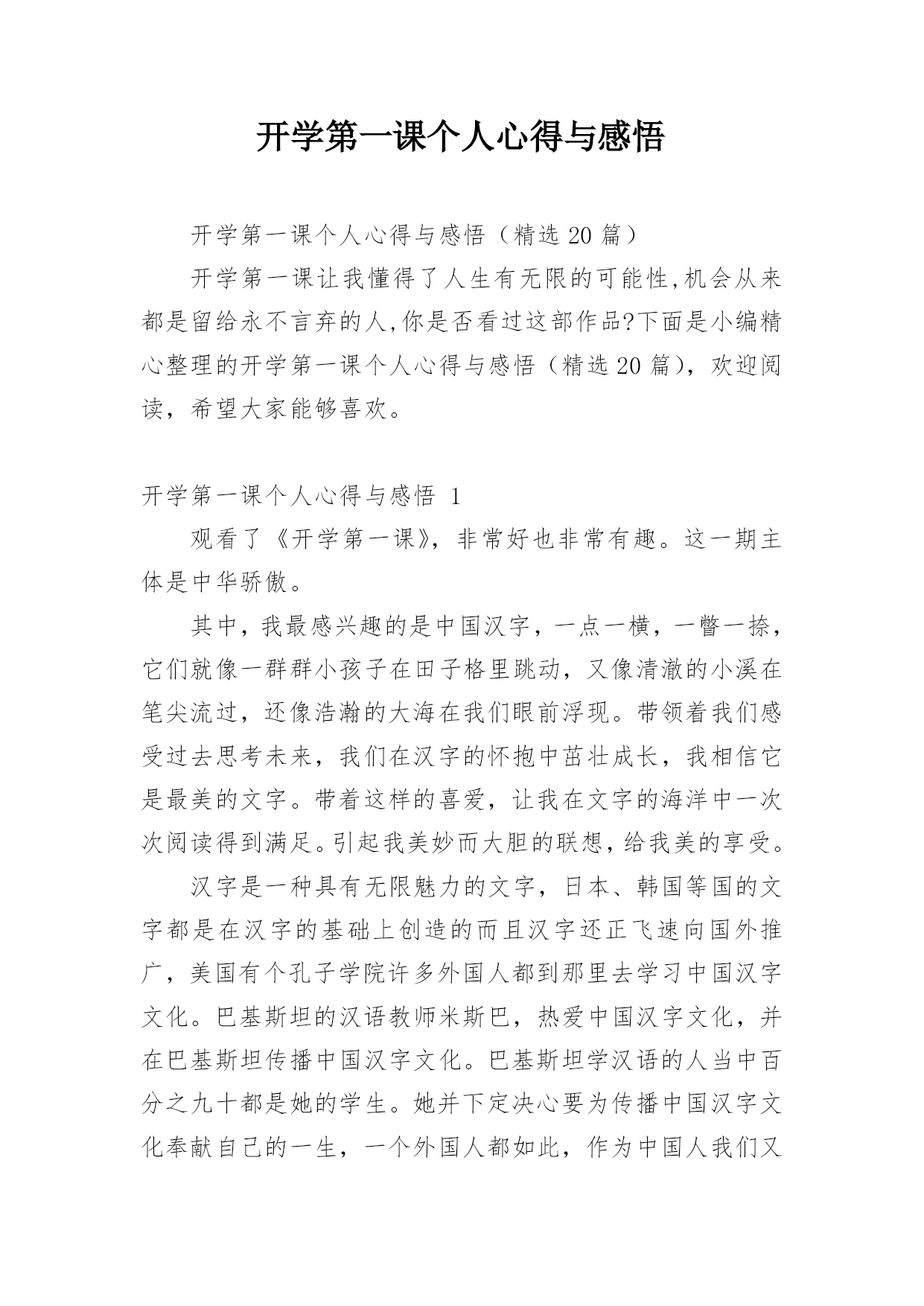 开学第一课个人心得与感悟开学第一课个人心得与感悟(精选20篇)开学第一课让我懂得了人生有无限的可能性,机会从来都是留给永不言弃的人,你是否看过这部作品?下面是小编精心整理的开学第一课个人心得与感悟(精选20篇),欢迎阅读,希望大家能够喜欢。开学第一课个人心得与感悟1观看了《开学第一课》,非常好也非常有趣。这一期主体是中华骄傲。其中,我最感兴趣的是中国汉字,一点一横,一瞥一捺,它们就像一群群小孩子在田子格里跳动,又像清澈的小溪在笔尖流过,还像浩瀚的大海在我们眼前浮现。带领着我们感受过去思考未来,我们在汉字的