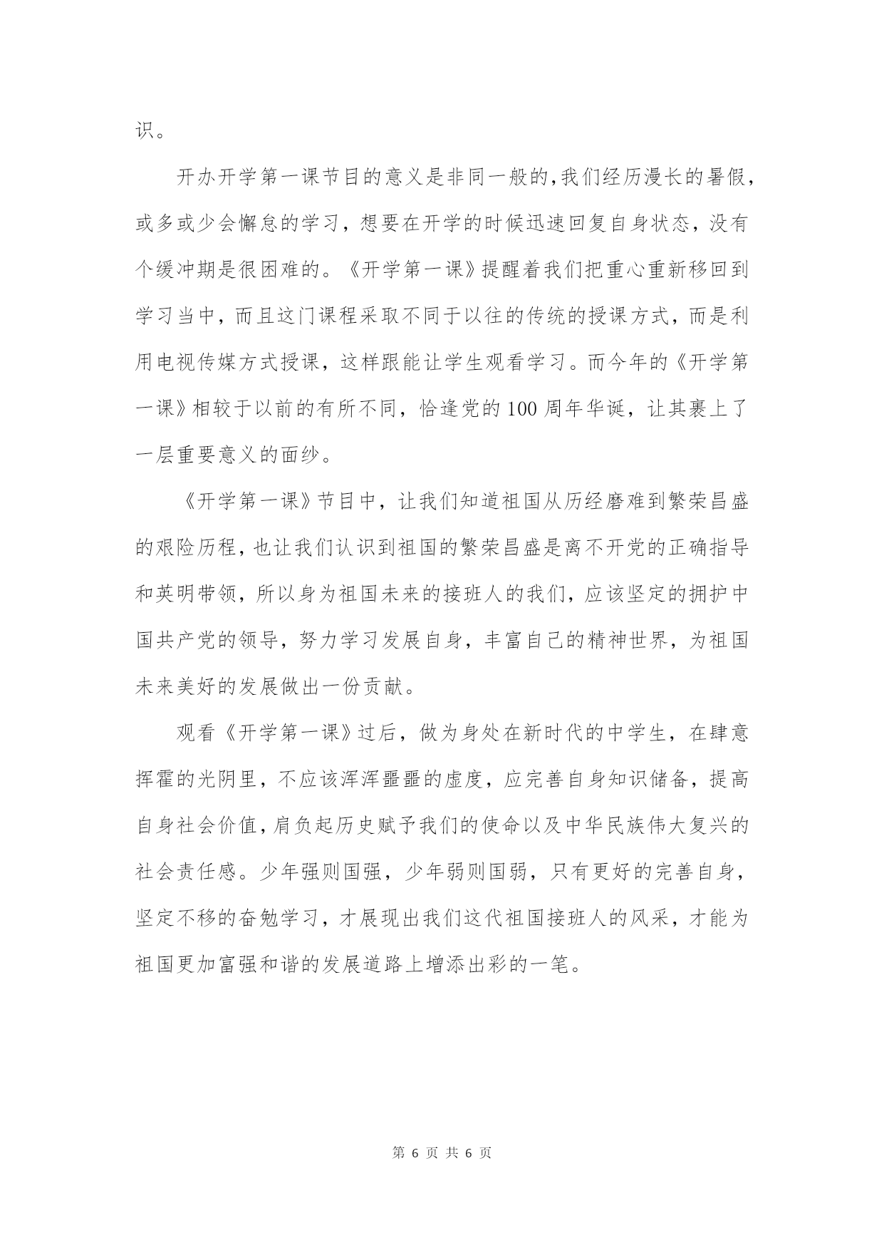 第PAGE\*MERGEFORMAT6页共NUMPAGES\*MERGEFORMAT6页2022《开学第一课》心得与个人感悟600字每年的开学第一课都是同学们非常期待的,过完了漫长的暑假,迎来了新学期,同时也迎来了新学期的开学第一课,那么你知道开学第一课的观后感要怎么写吗?本店铺在这给大家带来2022《开学第一课》心得与个人感悟600字5篇,欢迎大家借鉴参考!《开学第一课》心得与个人感悟【篇一】金秋九月,欢乐的暑假时间已过,迎接我们的便是新的开学季,而在9月1号这一天里,我们共同观看了一个特别
