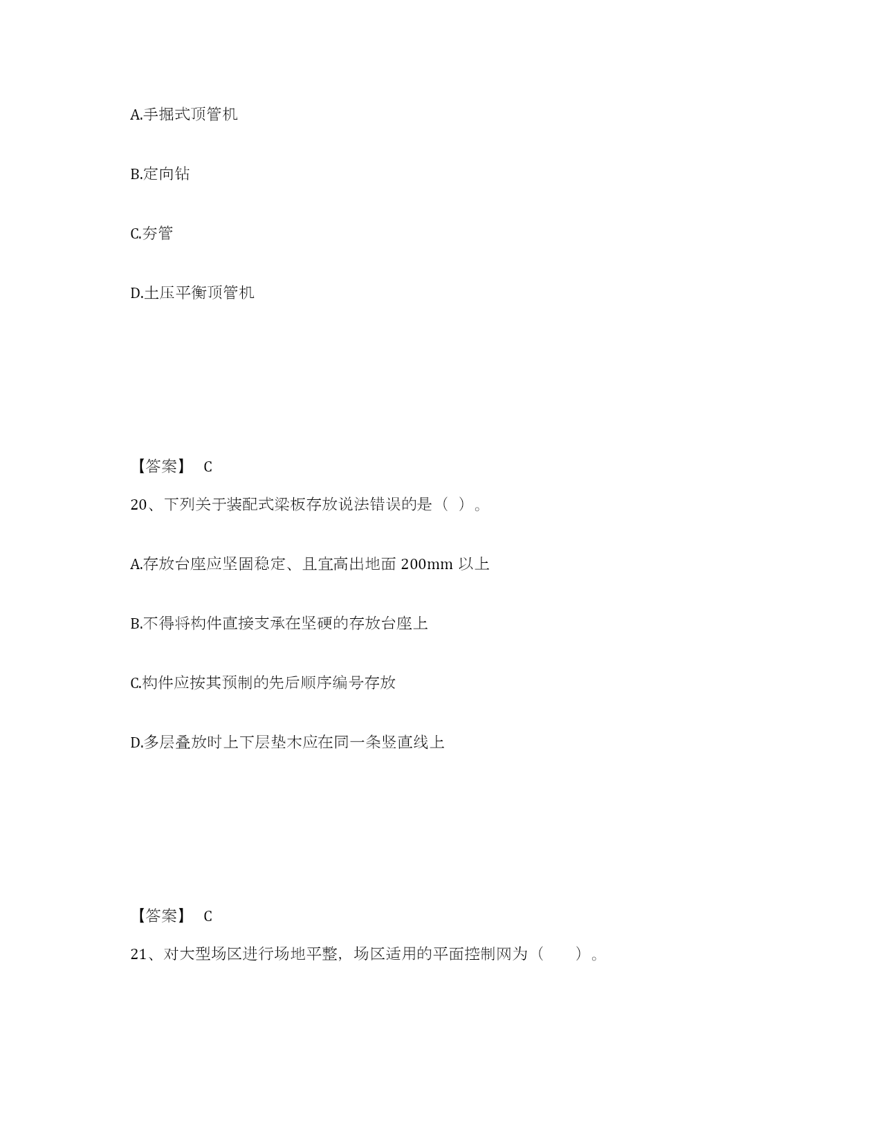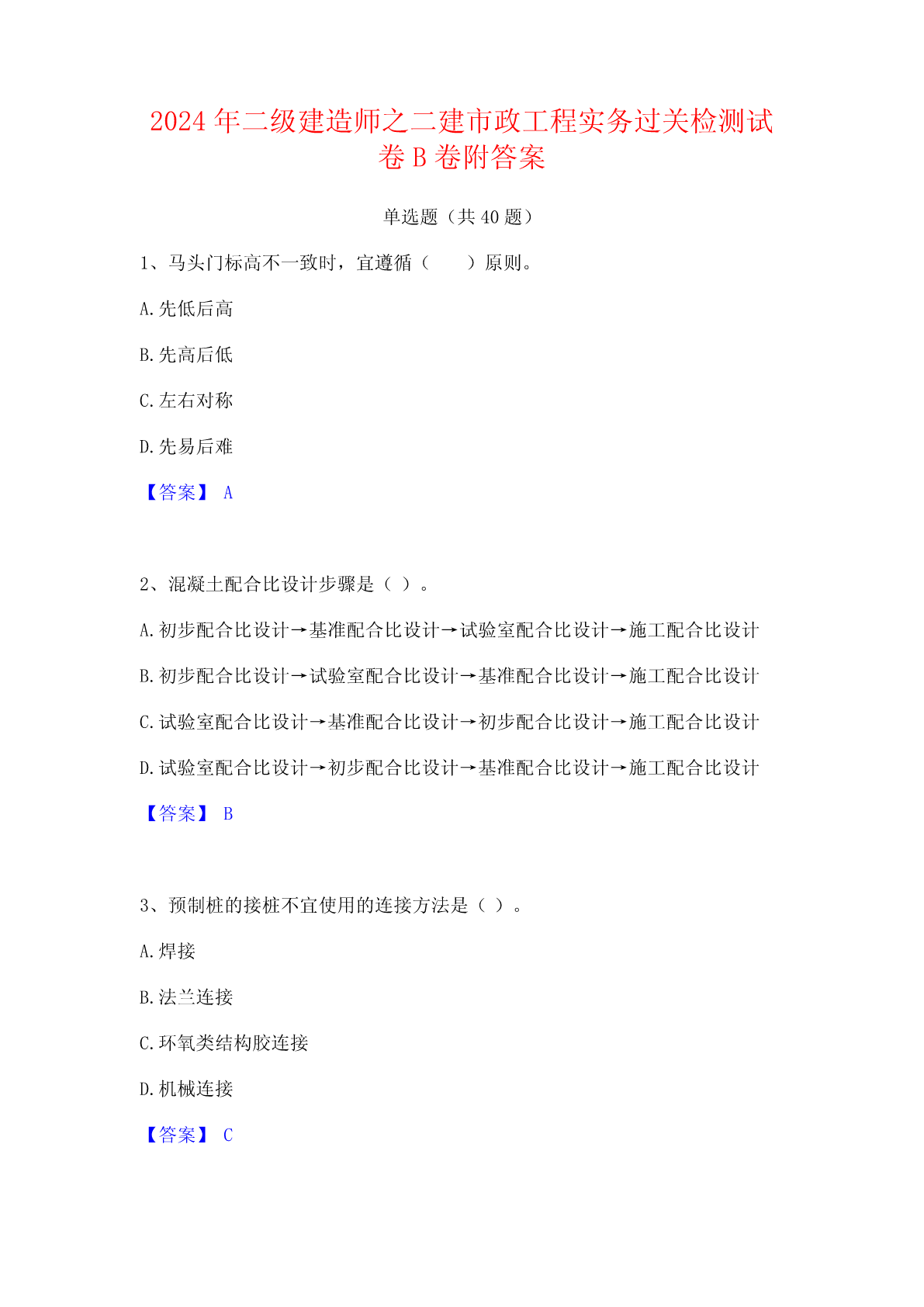 2024年二级建造师之二建市政工程实务过关检测试卷B卷附答案单选题(共40题)1、马头门标高不一致时,宜遵循()原则。A.先低后高B.先高后低C.左右对称D.先易后难【答案】A2、混凝土配合比设计步骤是()。A.初步配合比设计→基准配合比设计→试验室配合比设计→施工配合比设计B.初步配合比设计→试验室配合比设计→基准配合比设计→施工配合比设计C.试验室配合比设计→基准配合比设计→初步配合比设计→施工配合比设计D.试验室配合比设计→初步配合比设计→基准配合比设计→施工配合比设计【答案】B3、预制桩的接桩不宜