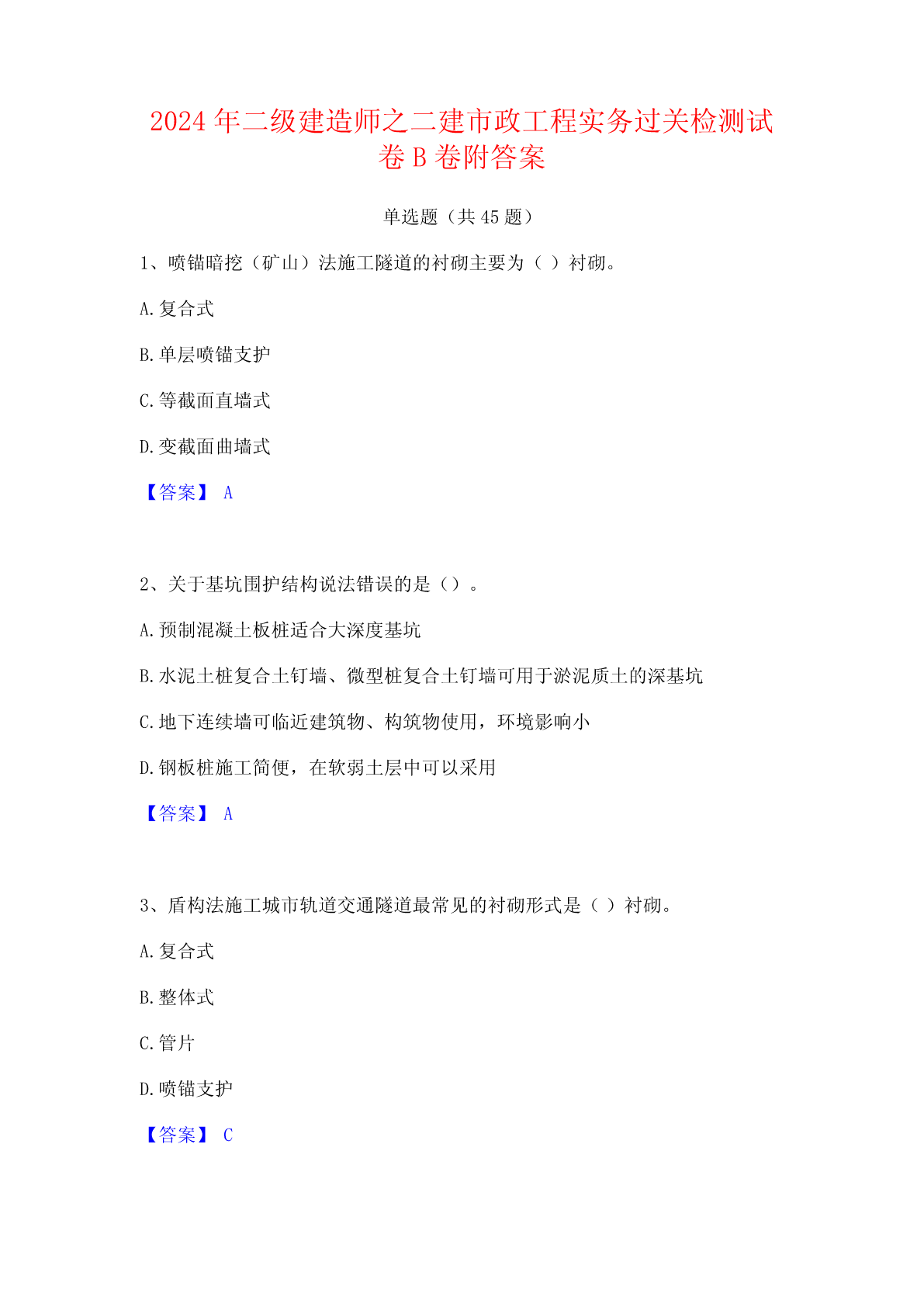 2024年二级建造师之二建市政工程实务过关检测试卷B卷附答案单选题(共45题)1、喷锚暗挖(矿山)法施工隧道的衬砌主要为()衬砌。A.复合式B.单层喷锚支护C.等截面直墙式D.变截面曲墙式【答案】A2、关于基坑围护结构说法错误的是()。A.预制混凝土板桩适合大深度基坑B.水泥土桩复合土钉墙、微型桩复合土钉墙可用于淤泥质土的深基坑C.地下连续墙可临近建筑物、构筑物使用,环境影响小D.钢板桩施工简便,在软弱土层中可以采用【答案】A3、盾构法施工城市轨道交通隧道最常见的衬砌形式是()衬砌。A.复合式B.整体式C