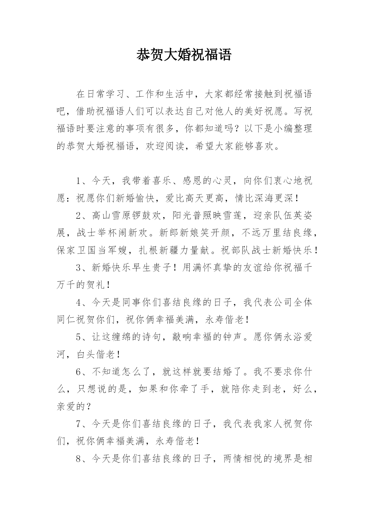 恭贺大婚祝福语在日常学习、工作和生活中,大家都经常接触到祝福语吧,借助祝福语人们可以表达自己对他人的美好祝愿。写祝福语时要注意的事项有很多,你都知道吗?以下是小编整理的恭贺大婚祝福语,欢迎阅读,希望大家能够喜欢。1、今天,我带着喜乐、感恩的心灵,向你们衷心地祝愿:祝愿你们新婚愉快,爱比高天更高,情比深海更深!2、高山雪原锣鼓欢,阳光普照映雪莲,迎亲队伍英姿展,战士举杯闹新欢。新郎新娘笑开颜,不远万里结良缘,保家卫国当军嫂,扎根新疆力量献。祝部队战士新婚快乐!3、新婚快乐早生贵子!用满怀真挚的友谊给你祝福千