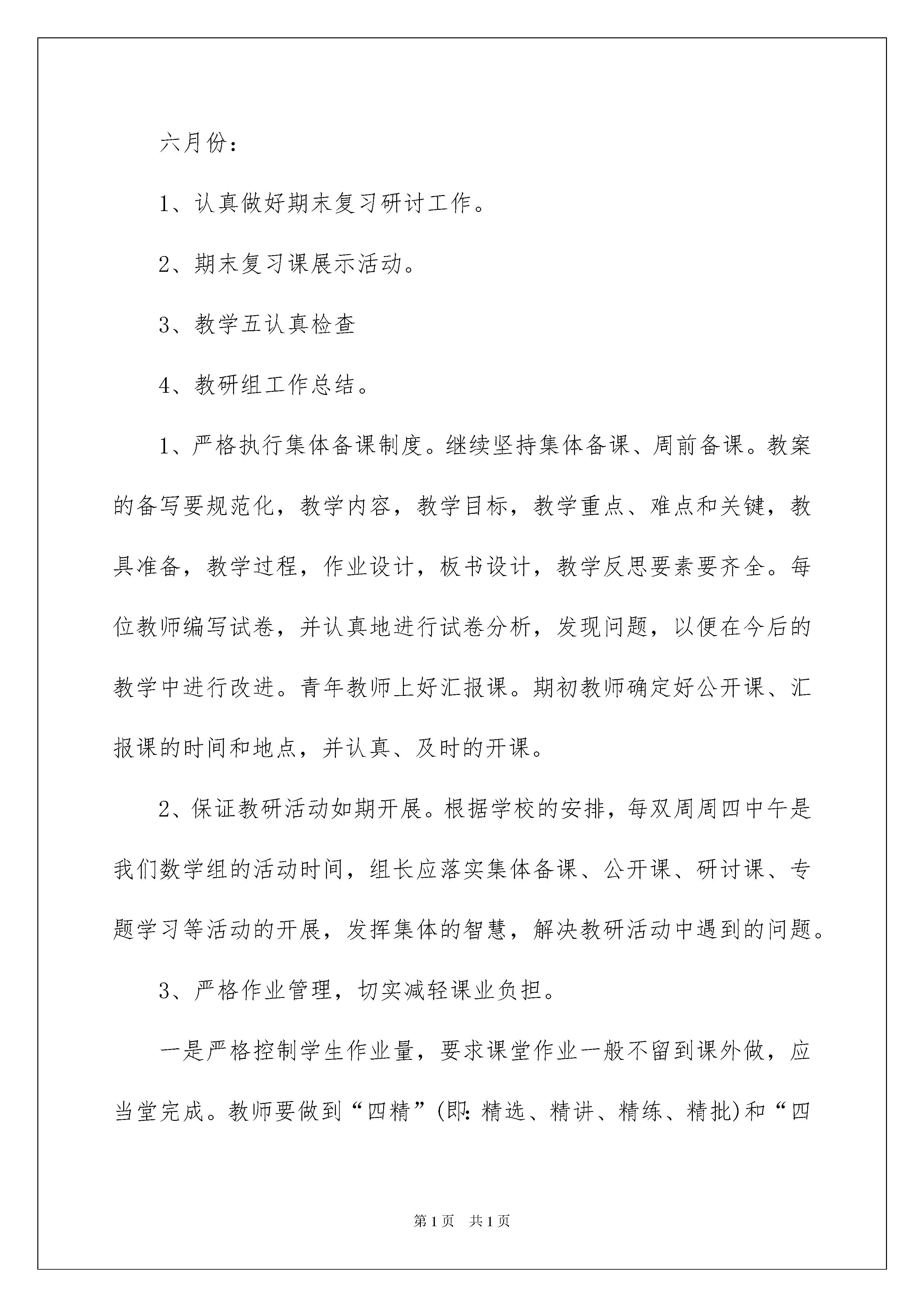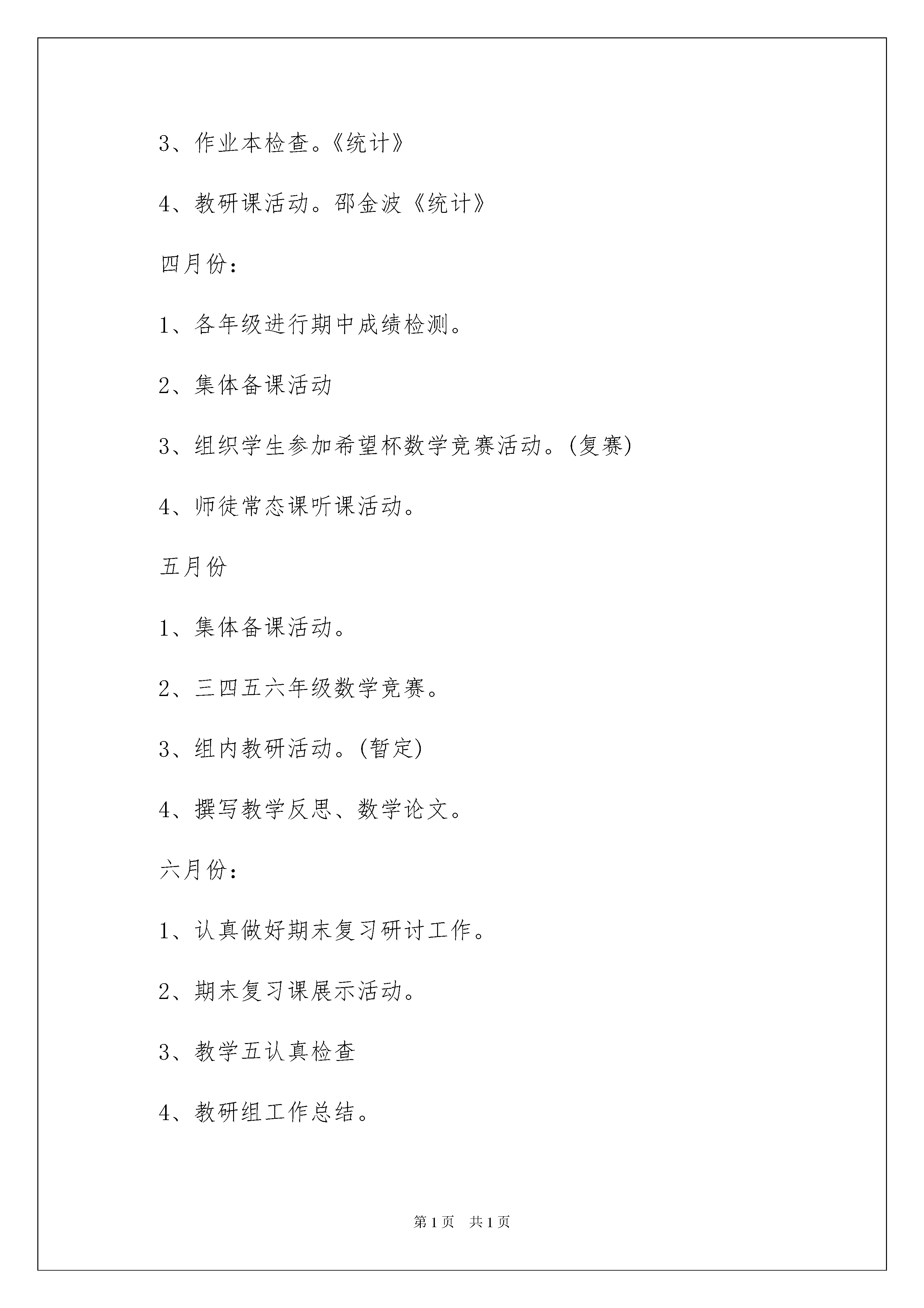本文格式为Word版,下载可任意编辑第PAGE\*MERGEFORMAT7页共NUMPAGES\*MERGEFORMAT7页2022小学数学教研组工作计划|小学教研组工作计划2022小学数学教研组工作计划|小学教研组工作计划在过去的一个学期里,我们数学组所有老师都按照教学工作计划出色的完成了自己的教学工作,大部分班级的学生成绩都有了较为明显的提高,这是与学生的努力离不开的,当然还有我们的老师辛勤教学的因素,两者都有吧。在过去的一个学期中,我们数学组多有老师都总结出一个经验,就是完整的按照我们之