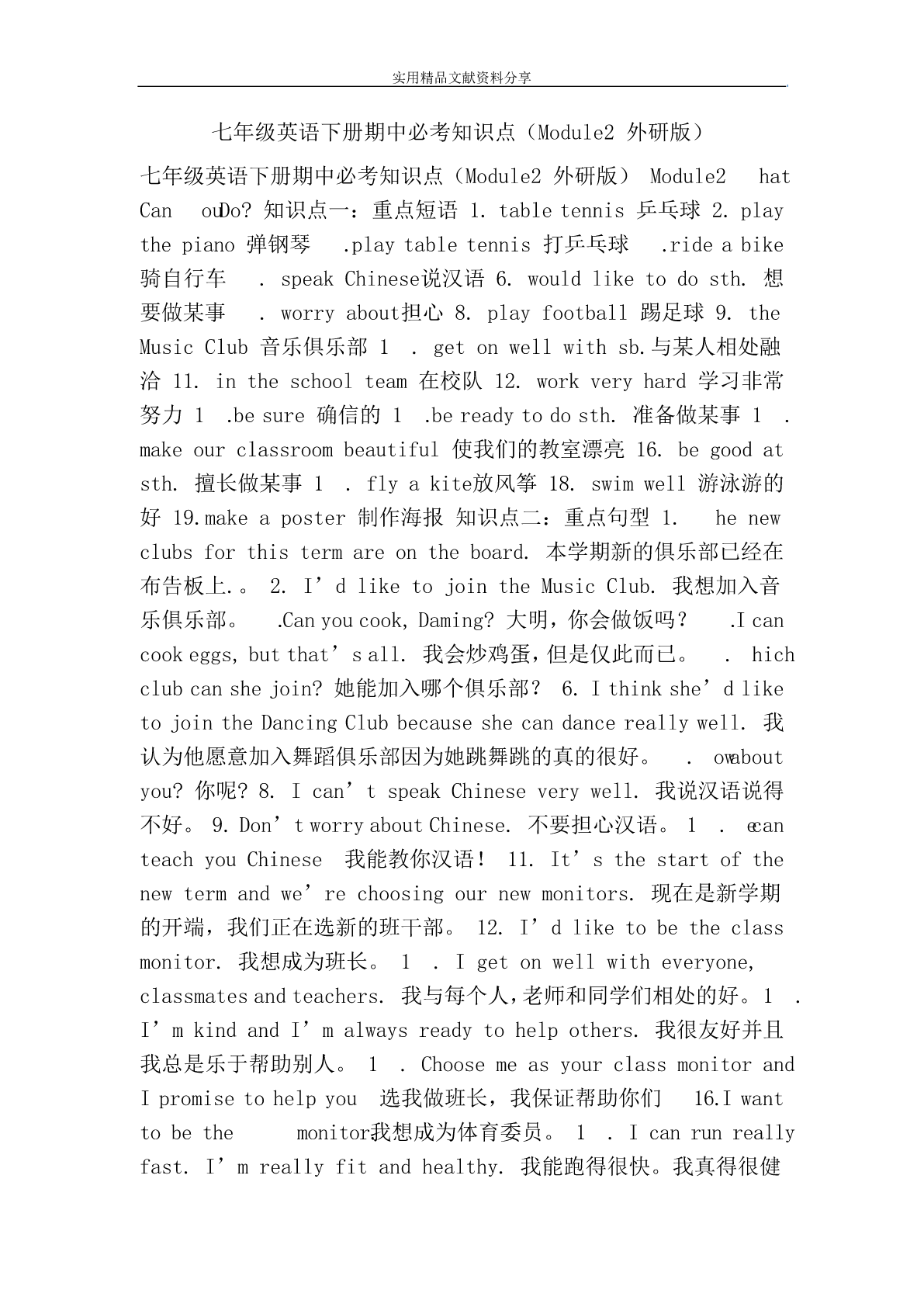实用精品文献资料分享七年级英语下册期中必考知识点(Module2外研版)七年级英语下册期中必考知识点(Module2外研版)Module2WhatCanYouDo?知识点一:重点短语1.tabletennis乒乓球2.playthepiano弹钢琴3.playtabletennis打乒乓球4.rideabike骑自行车5.speakChinese说汉语6.wouldliketodosth.想要做某事7.worryabout担心8.playfootball踢足球9.theMusicClub音乐俱乐部10.g