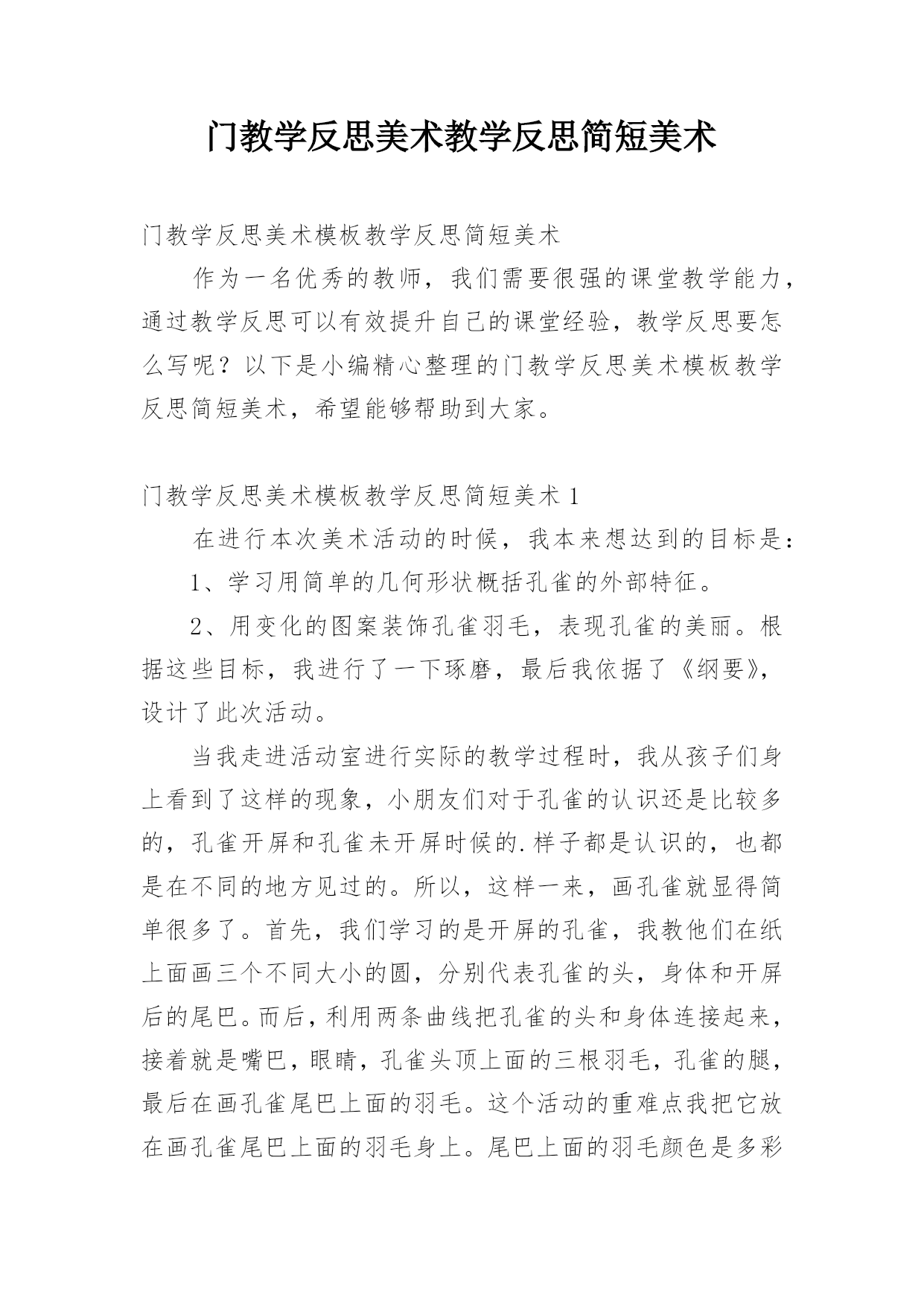 门教学反思美术教学反思简短美术门教学反思美术模板教学反思简短美术作为一名优秀的教师,我们需要很强的课堂教学能力,通过教学反思可以有效提升自己的课堂经验,教学反思要怎么写呢?以下是小编精心整理的门教学反思美术模板教学反思简短美术,希望能够帮助到大家。门教学反思美术模板教学反思简短美术1在进行本次美术活动的时候,我本来想达到的目标是:1、学习用简单的几何形状概括孔雀的外部特征。2、用变化的图案装饰孔雀羽毛,表现孔雀的美丽。根据这些目标,我进行了一下琢磨,最后我依据了《纲要》,设计了此次活动。当我走进活动室进行
