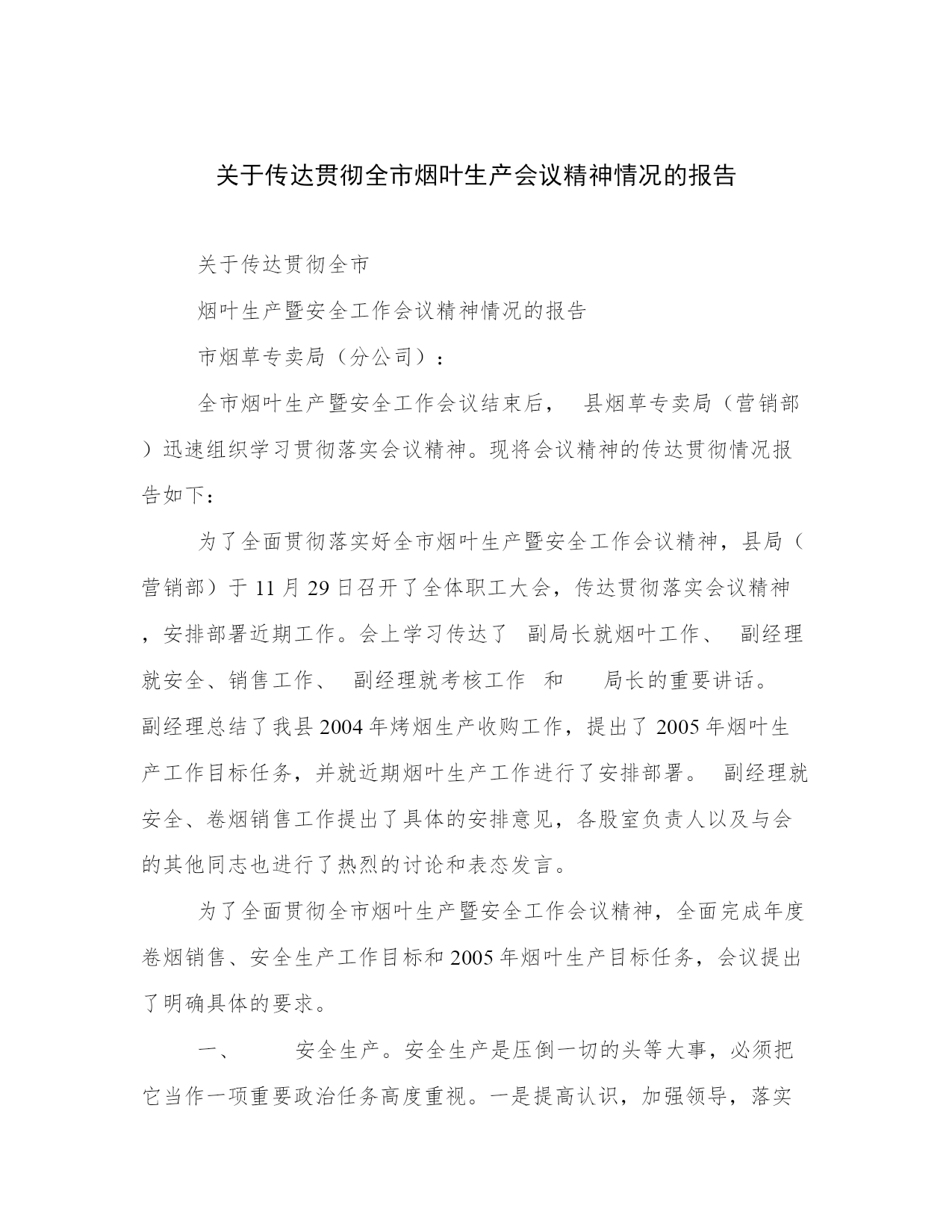 关于传达贯彻全市烟叶生产会议精神情况的报告关于传达贯彻全市烟叶生产暨安全工作会议精神情况的报告市烟草专卖局(分公司):全市烟叶生产暨安全工作会议结束后,县烟草专卖局(营销部)迅速组织学习贯彻落实会议精神。现将会议精神的传达贯彻情况报告如下:为了全面贯彻落实好全市烟叶生产暨安全工作会议精神,县局(营销部)于×月×日召开了全体职工大会,传达贯彻落实会议精神,安排部署近期工作。会上学习传达了副局长就烟叶工作、副经理就安全、销售工作、副经理就考核工作和局长的重要讲话。副经理总结了我县××