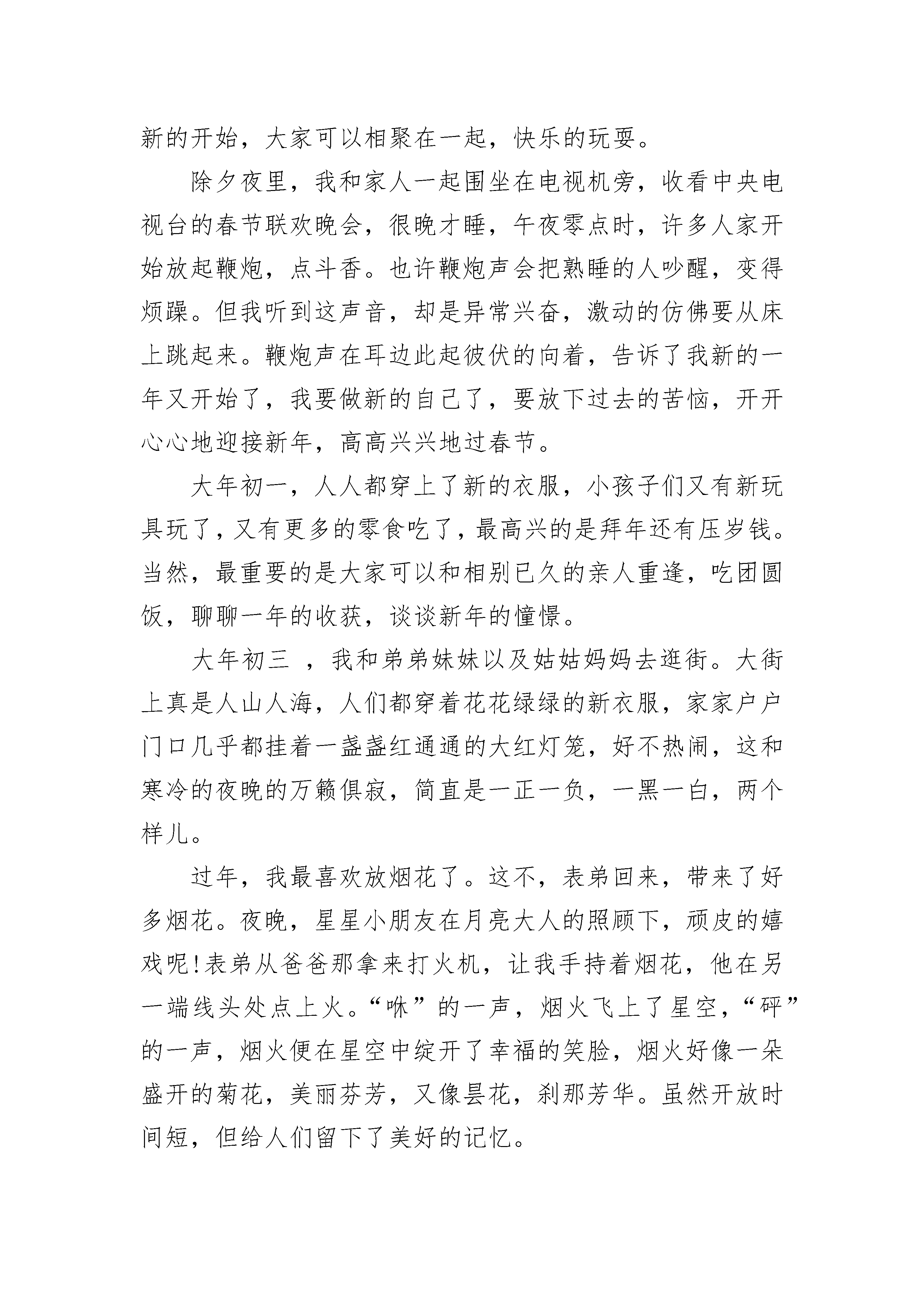 以春节为话题的学生作文在平凡的学习、工作、生活中,大家对作文都再熟悉不过了吧,作文是经过人的思想考虑和语言组织,通过文字来表达一个主题意义的记叙方法。那要怎么写好作文呢?下面是小编帮大家整理的以春节为话题的学生作文,仅供参考,希望能够帮助到大家。以春节为话题的学生作文1我的家乡在四川,那里有着自己独特的风俗,春节非常热闹!除夕的前一两天,大人们就开始忙活着:买鸡、买鱼、买鸭……。家户还必须大扫除一次,把屋里屋外打扫的干干净净的,贴对联,挂灯笼……到处弥漫着浓浓的年味儿。除夕夜,大家围着桌子品尝美味可口的团