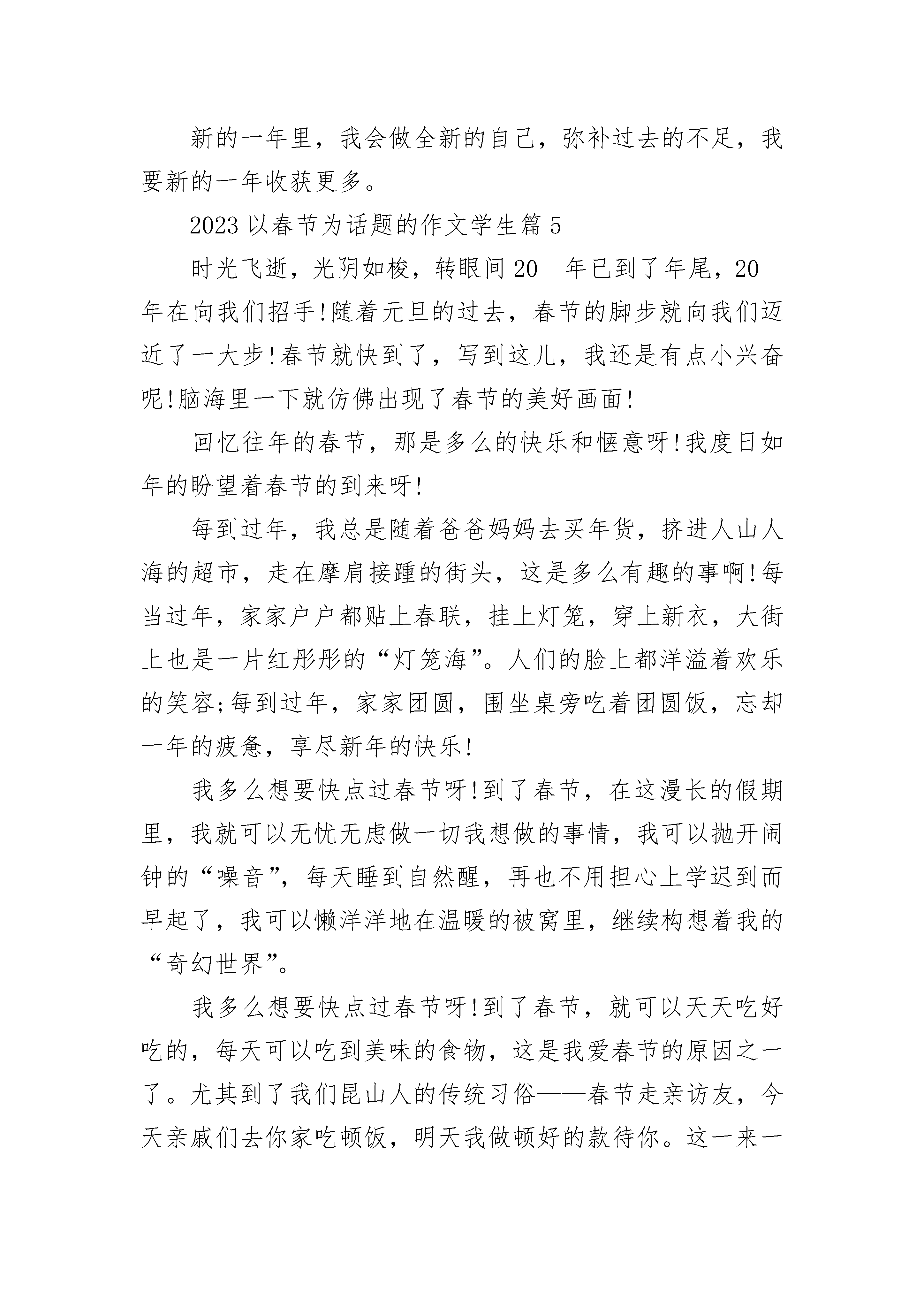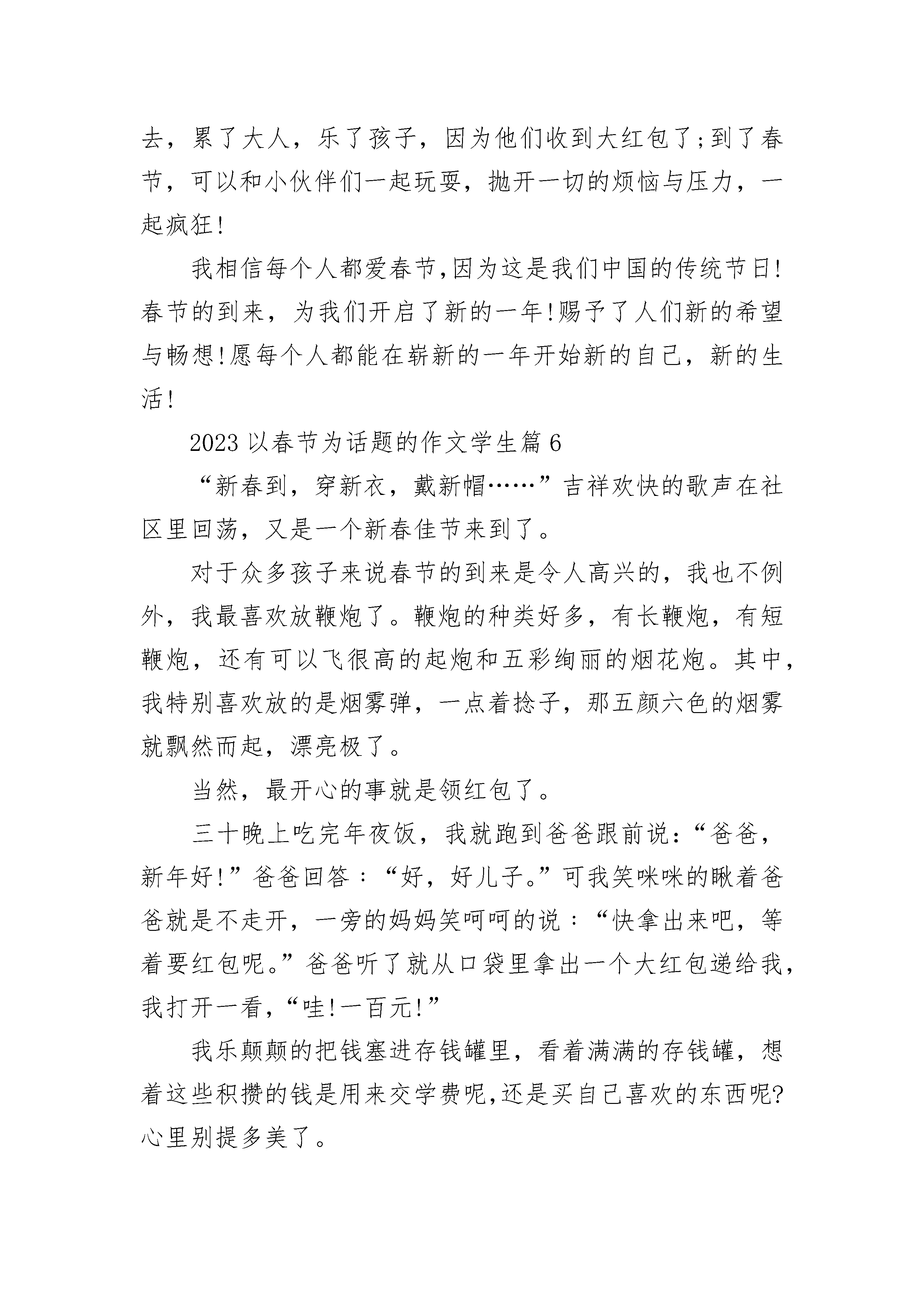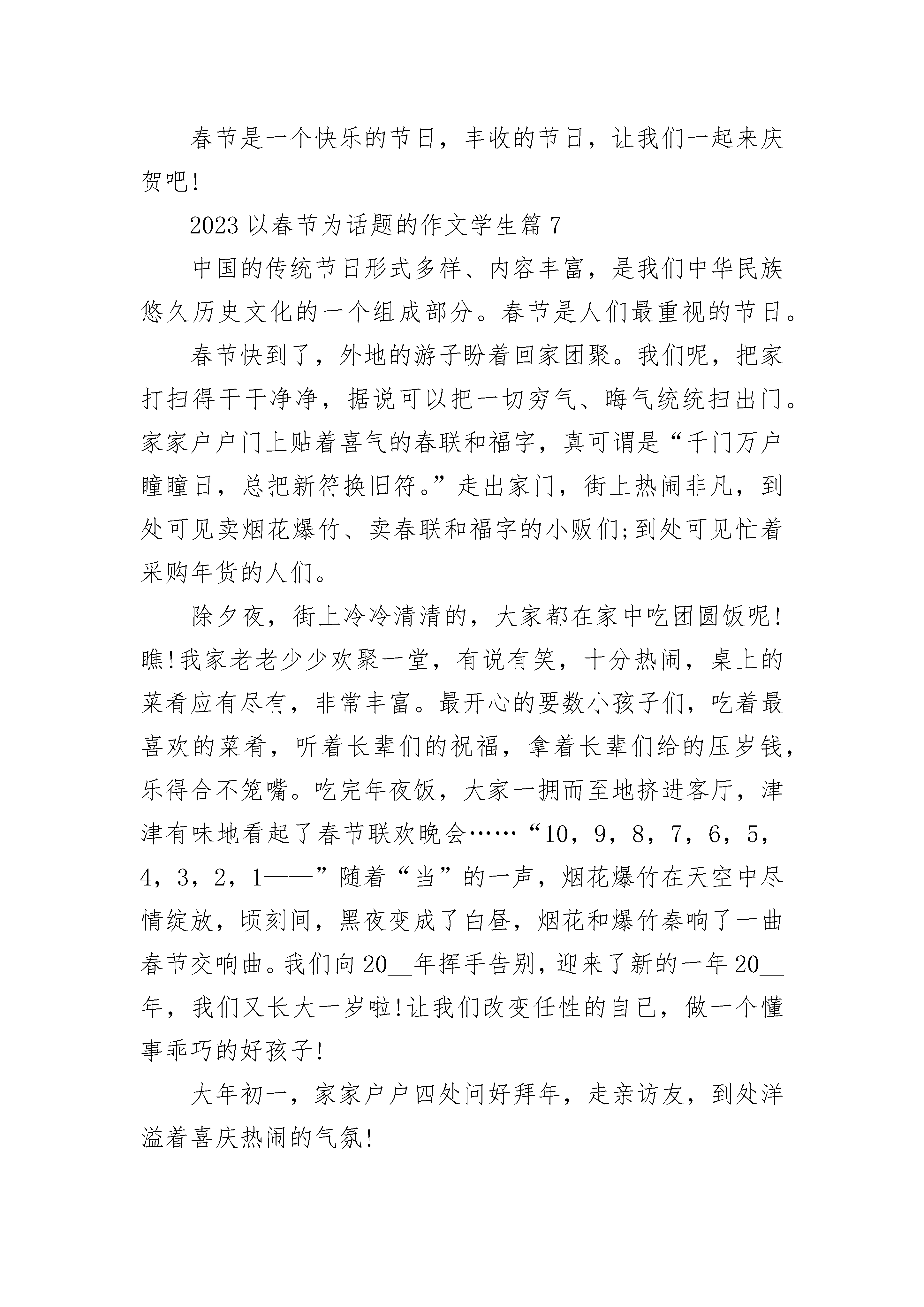 以春节为话题的学生作文以春节为话题的学生作文在平凡的学习、工作、生活中,大家对作文都再熟悉不过了吧,作文是经过人的思想考虑和语言组织,通过文字来表达一个主题意义的记叙方法。那要怎么写好作文呢?下面是小编帮大家整理的以春节为话题的学生作文,仅供参考,希望能够帮助到大家。以春节为话题的学生作文1我的家乡在四川,那里有着自己独特的风俗,春节非常热闹!除夕的前一两天,大人们就开始忙活着:买鸡、买鱼、买鸭……。家户还必须大扫除一次,把屋里屋外打扫的干干净净的,贴对联,挂灯笼……到处弥漫着浓浓的年味儿。除夕夜,大家围