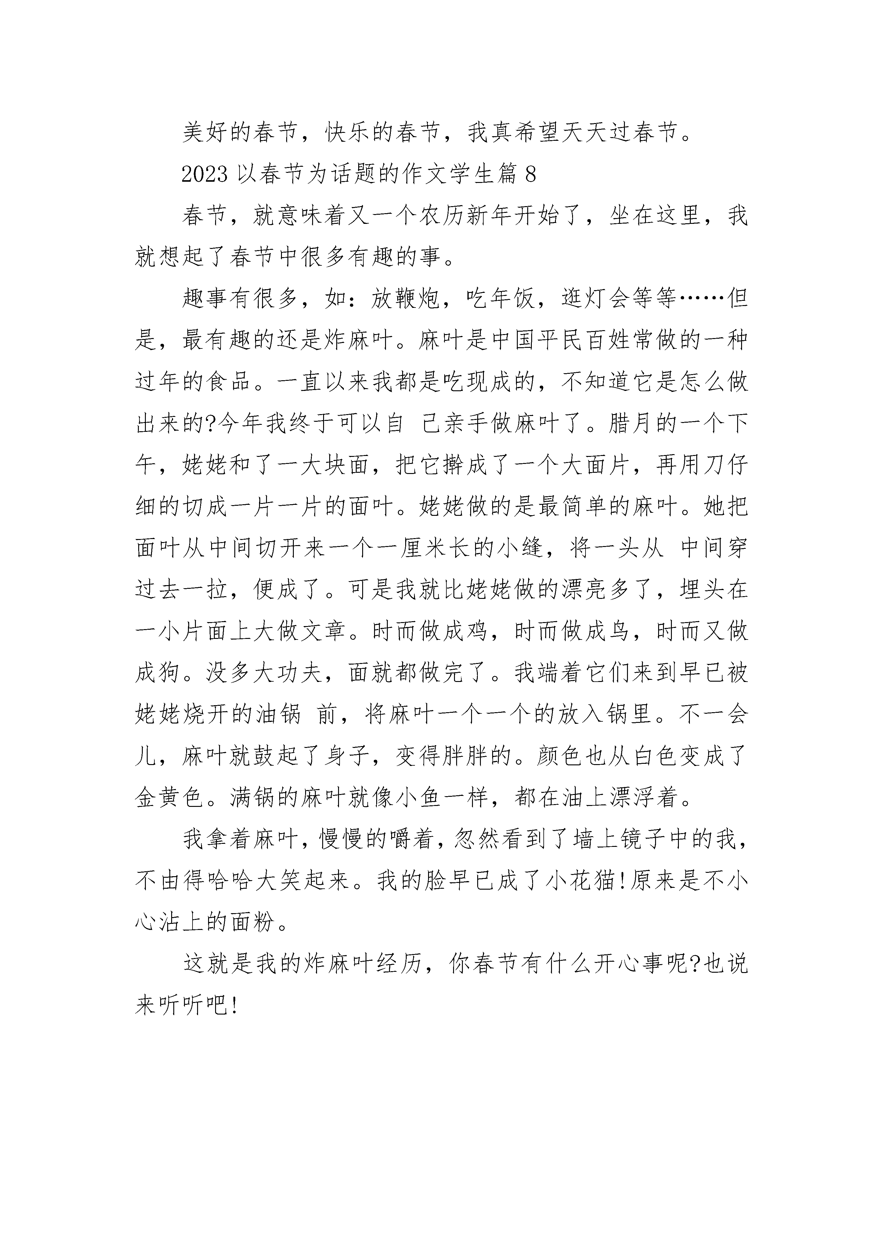 以春节为话题的学生作文以春节为话题的学生作文无论是在学校还是在社会中,大家都不可避免地要接触到作文吧,借助作文可以宣泄心中的情感,调节自己的心情。作文的注意事项有许多,你确定会写吗?下面是小编为大家整理的以春节为话题的学生作文,希望对大家有所帮助。以春节为话题的学生作文1盼星星,盼月亮,终于把这一个欢快的节日给盼来了—春节。新年来了,往事如风一样飞走了,迎接来了新一年的开始。新的一年,新的气象。走出家门,家家户户都张灯结彩;大街上,到处都喜气洋洋,欢声笑语。春天的气息把花儿般的喜悦映在人们的脸上。除夕晚上