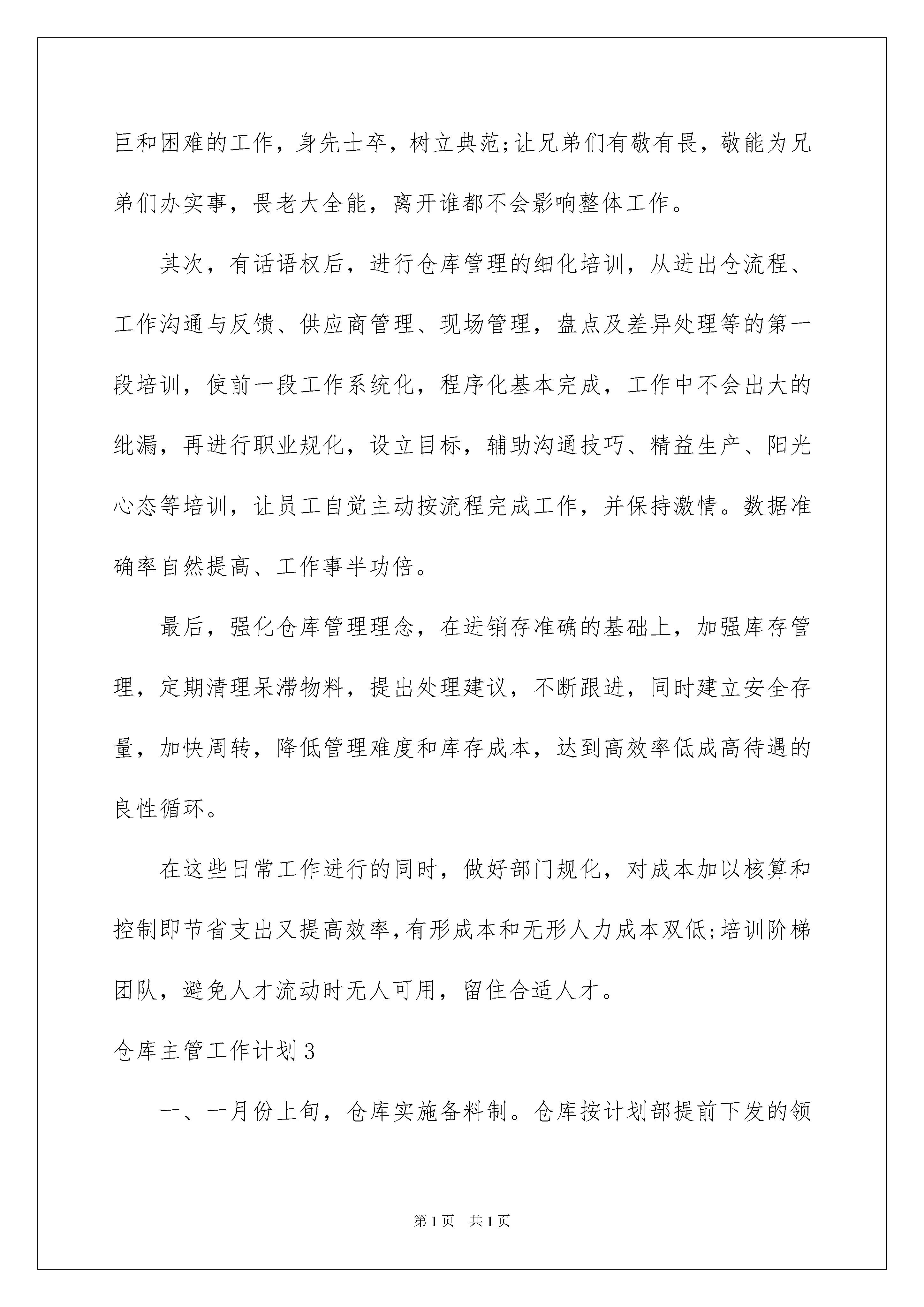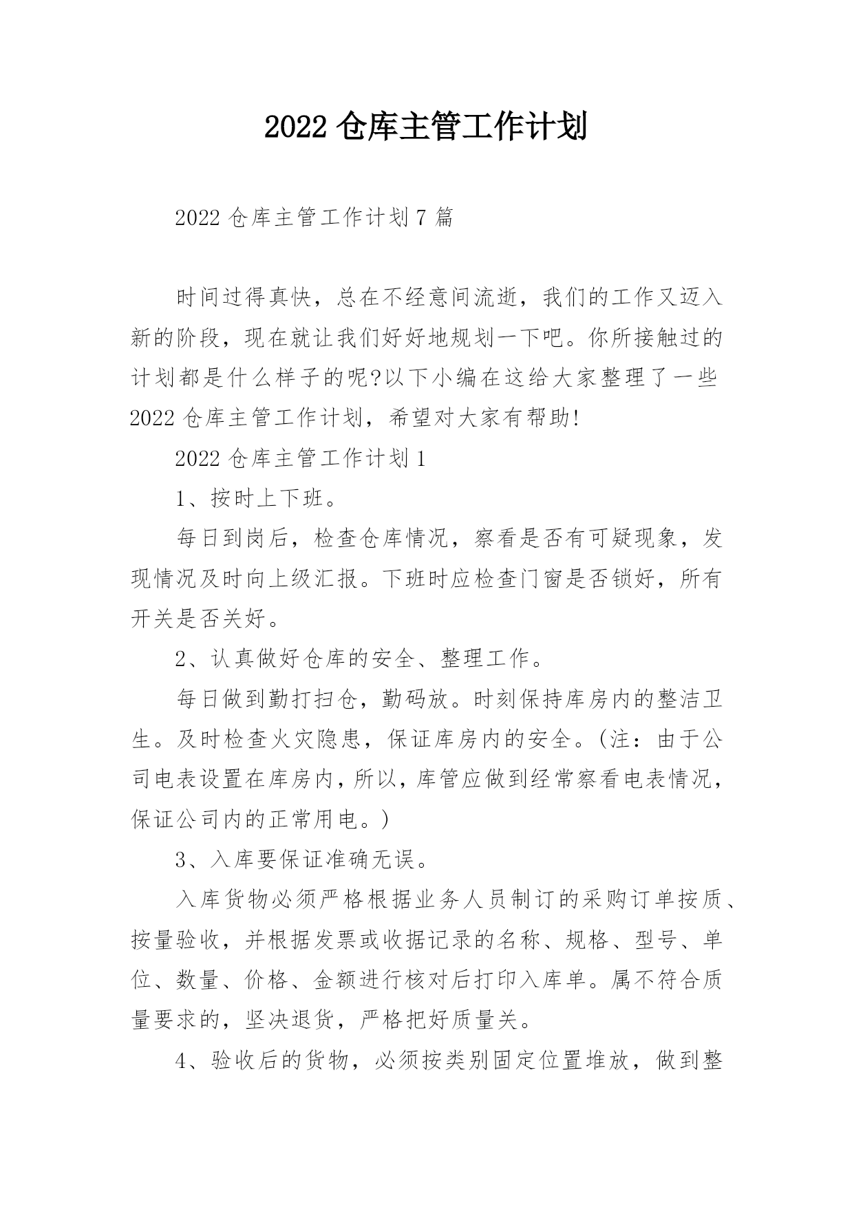 2022仓库主管工作计划2022仓库主管工作计划7篇时间过得真快,总在不经意间流逝,我们的工作又迈入新的阶段,现在就让我们好好地规划一下吧。你所接触过的计划都是什么样子的呢?以下小编在这给大家整理了一些2022仓库主管工作计划,希望对大家有帮助!2022仓库主管工作计划11、按时上下班。每日到岗后,检查仓库情况,察看是否有可疑现象,发现情况及时向上级汇报。下班时应检查门窗是否锁好,所有开关是否关好。2、认真做好仓库的安全、整理工作。每日做到勤打扫仓,勤码放。时刻保持库房内的整洁卫生。及时检查火灾隐患,保证