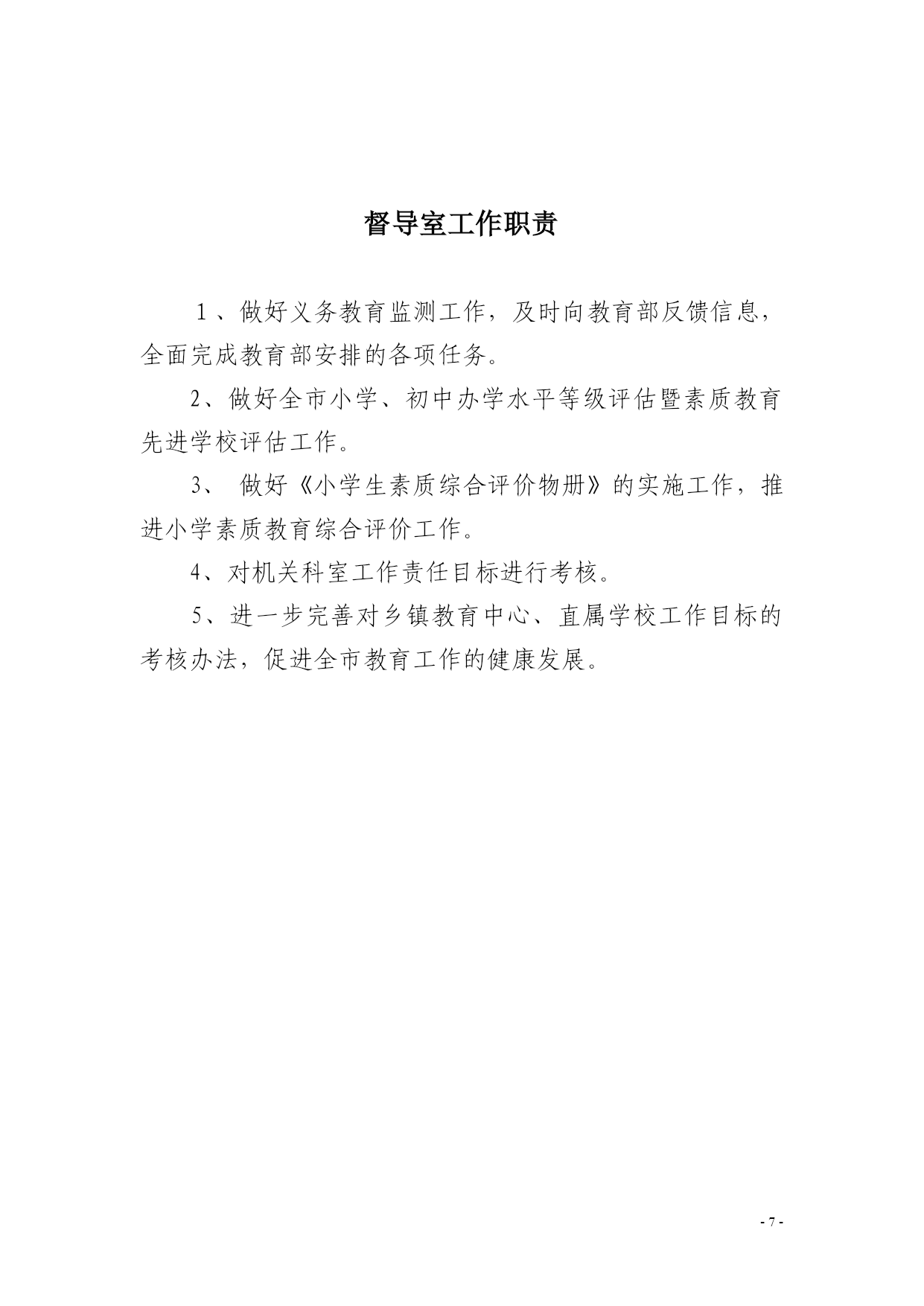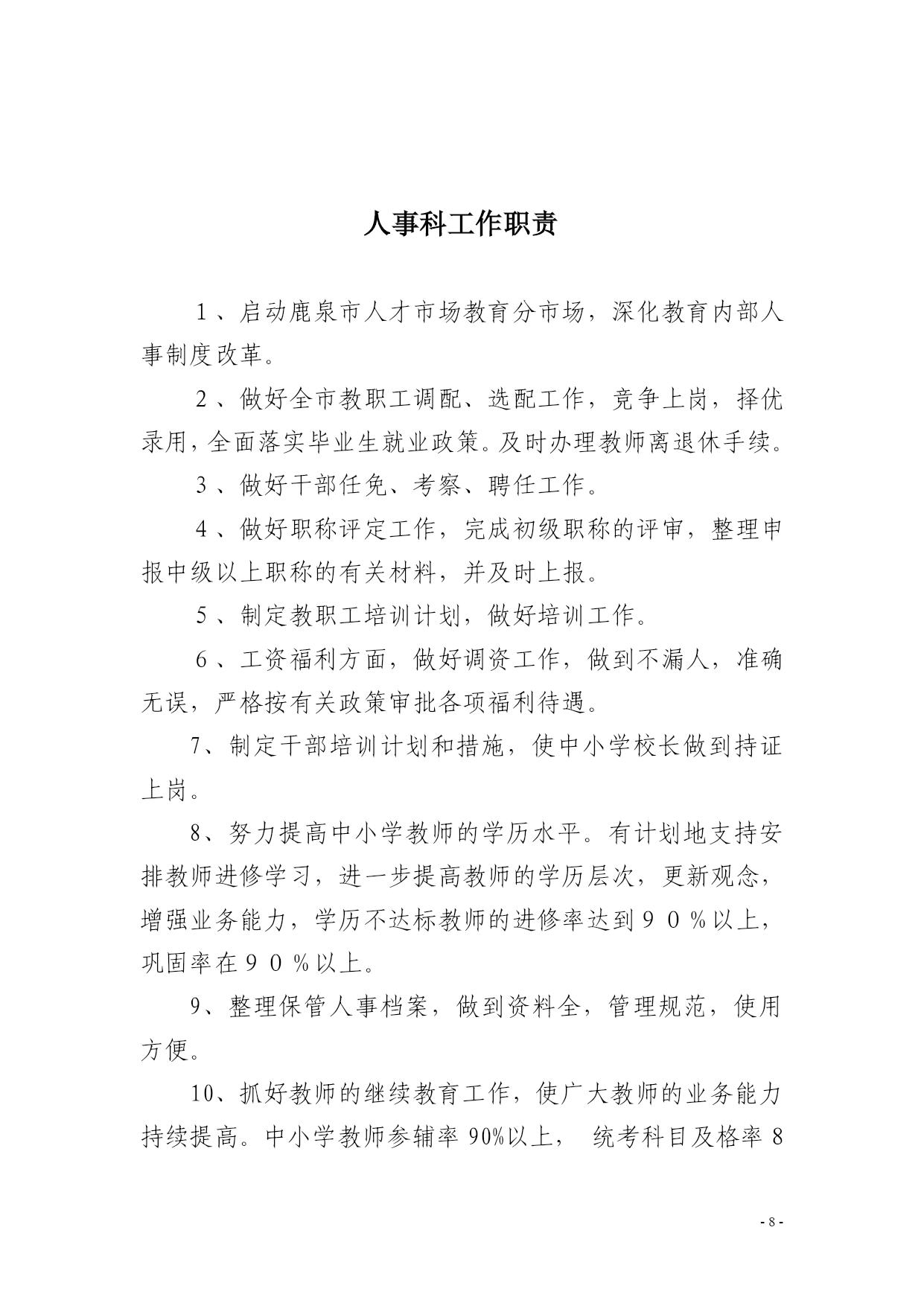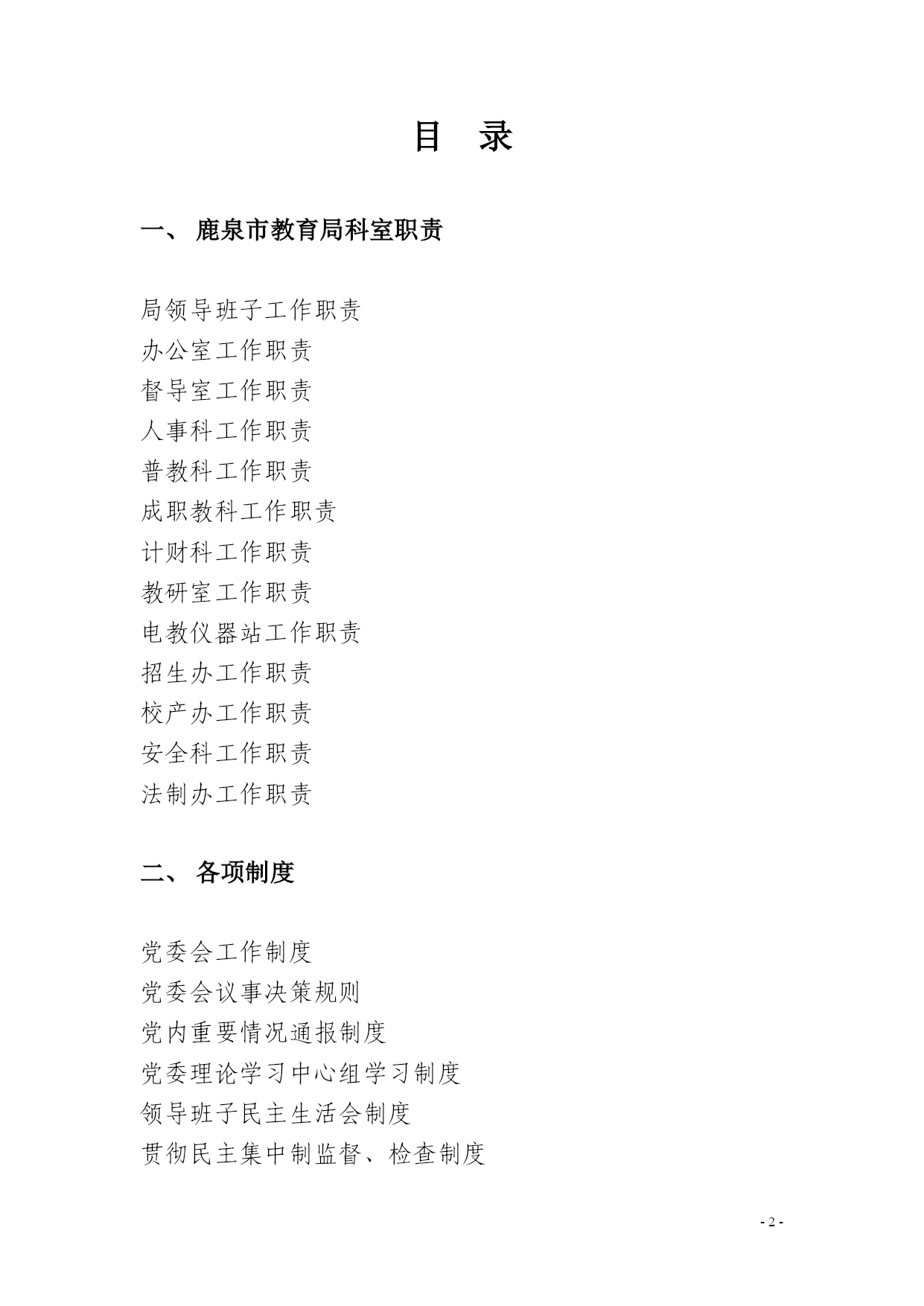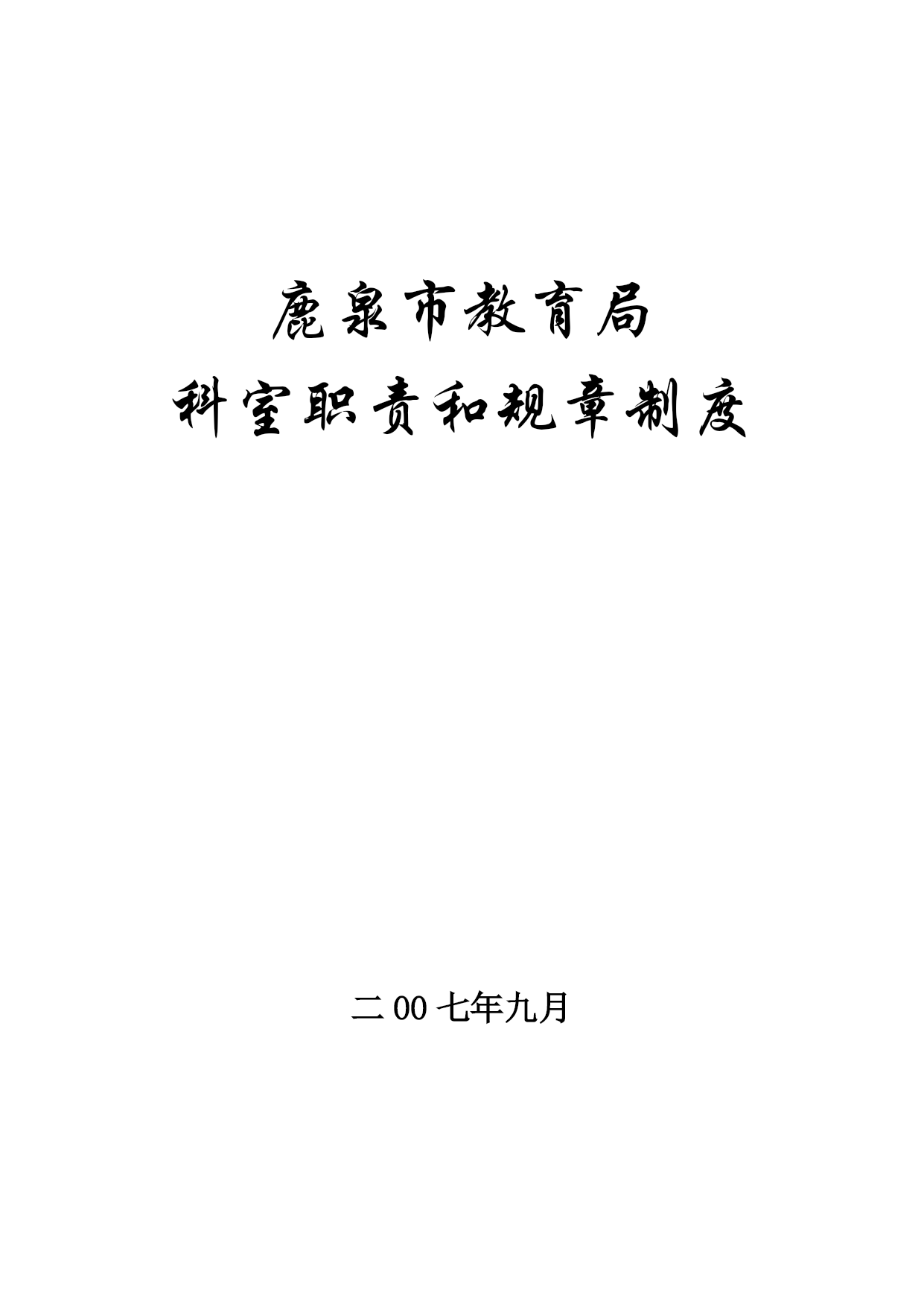 PAGE-84-鹿泉市教育局科室职责和规章制度二00七年九月目录鹿泉市教育局科室职责局领导班子工作职责办公室工作职责督导室工作职责人事科工作职责普教科工作职责成职教科工作职责计财科工作职责教研室工作职责电教仪器站工作职责招生办工作职责校产办工作职责安全科工作职责法制办工作职责各项制度党委会工作制度党委会议事决策规则党内重要情况通报制度党委理论学习中心组学习制度领导班子民主生活会制度贯彻民主集中制监督、检查制度三会一课制度党员权利保障制度党员谈话诫勉制度学习培训制度政治、业务学习制度机关