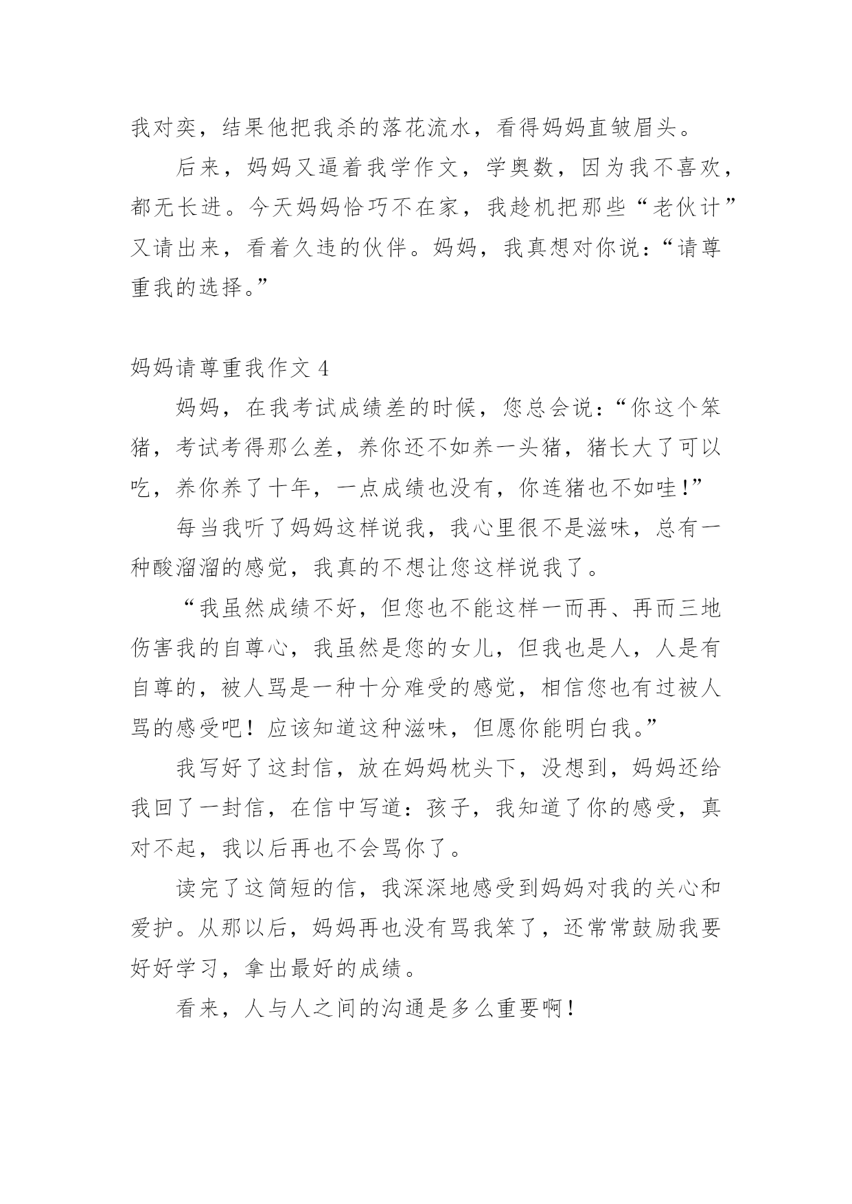 妈妈请尊重我作文在学习、工作或生活中,大家都不可避免地会接触到作文吧,写作文是培养人们的观察力、联想力、想象力、思考力和记忆力的重要手段。那么问题来了,到底应如何写一篇优秀的作文呢?下面是小编帮大家整理的妈妈请尊重我作文,供大家参考借鉴,希望可以帮助到有需要的朋友。妈妈请尊重我作文1妈妈,在生活中,您总是在我身边帮助我,鼓励我,我非常感谢您,但有时候您也有些坏习惯,您想过我的感受吗?有一次,我走在上学的路上,突然想起复印件忘记带了,我拿出电话手表给您打通电话后焦急地说:妈妈,我的复印件忘带了,您快帮我送来