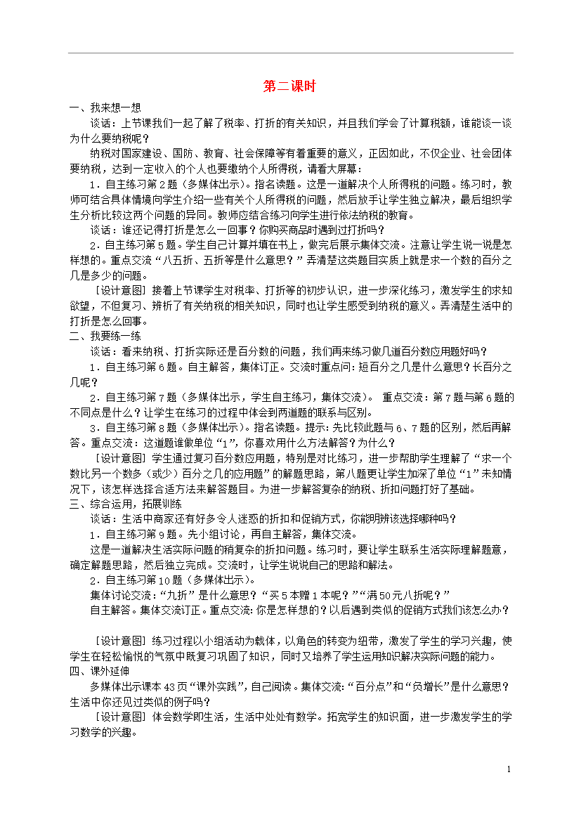 1第二课时一、我来想一想谈话:上节课我们一起了解了税率、打折的有关知识,并且我们学会了计算税额,谁能谈一谈为什么要纳税呢?纳税对国家建设、国防、教育、社会保障等有着重要的意义,正因如此,不仅企业、社会团体要纳税,达到一定收入的个人也要缴纳个人所得税,请看大屏幕:1.自主练习第2题(多媒体出示)。指名读题。这是一道解决个人所得税的问题。练习时,教师可结合具体情境向学生介绍一些有关个人所得税的问题,然后放手让学生独立解决,最后组织学生分析比较这两个问题的异同。教师应结合练习向学生进行依法纳税的教育。谈话:谁还